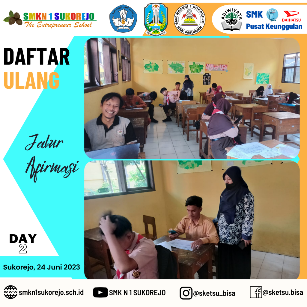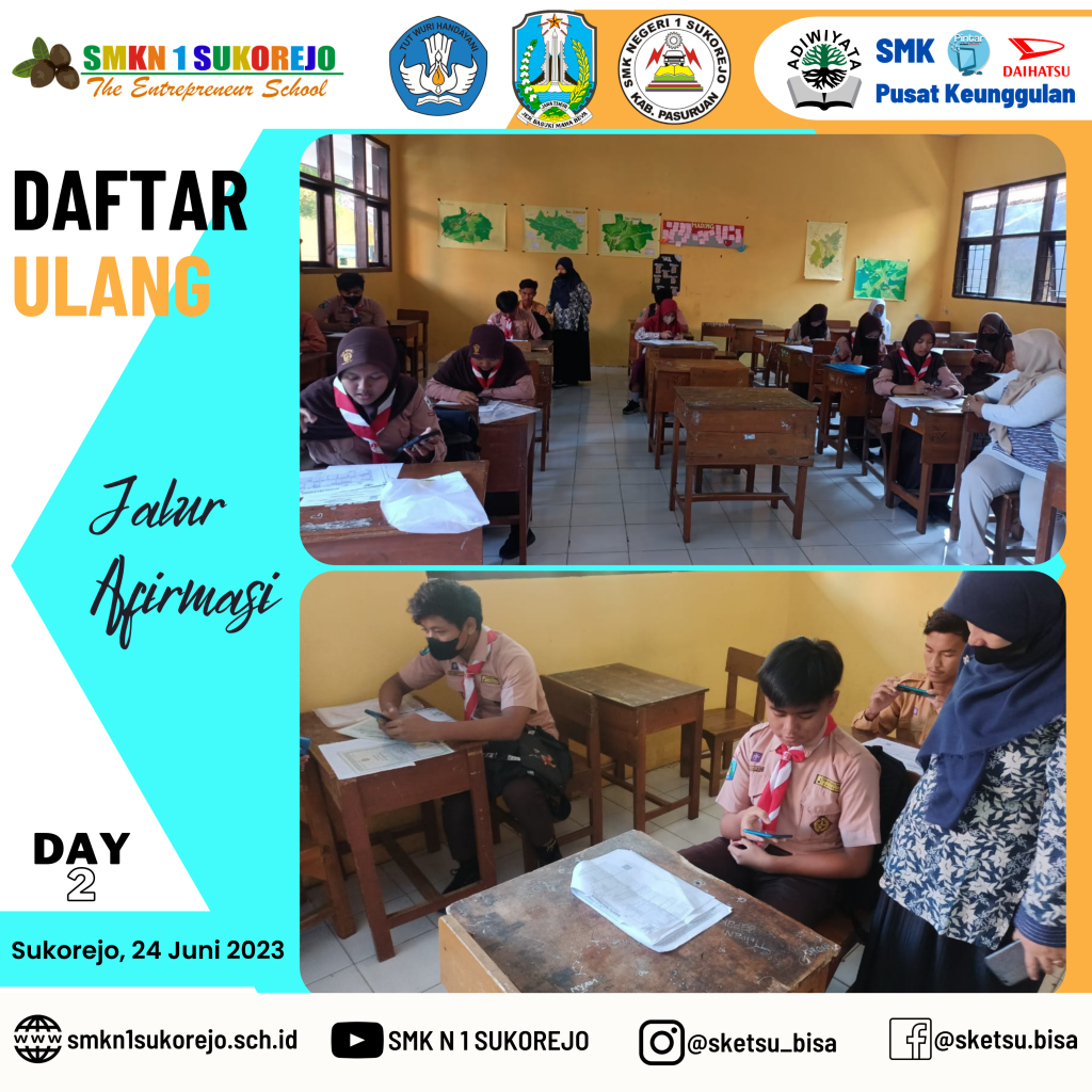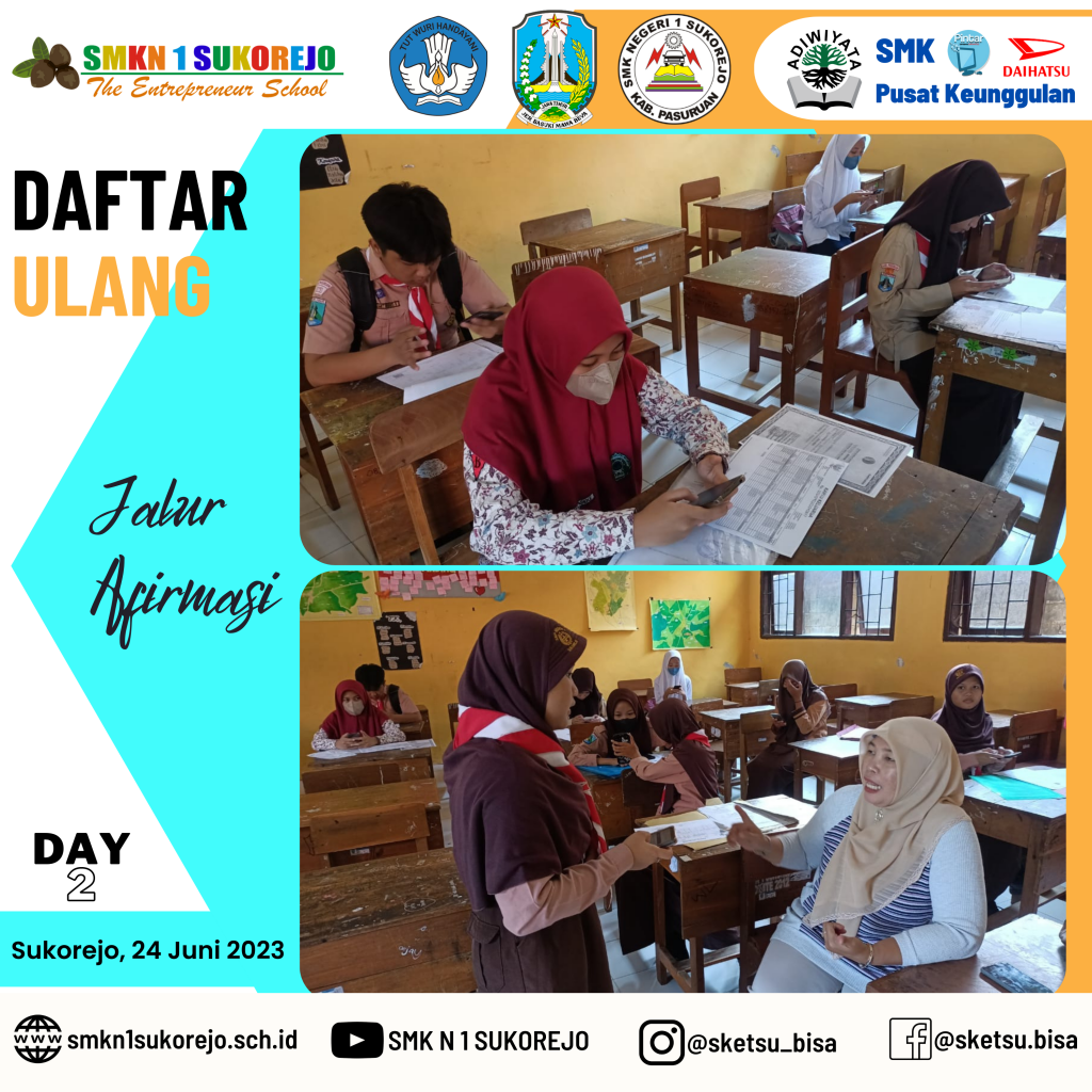 122 CALON PESERTA DIDIK BARU JALUR AFIRMASI LAKUKAN DAFTAR ULANG SECARA OFFLINE Agenda Sekolah Informasi Sekolah Kegiatan Sekolah 23 Juni 202327 Juni 2023 adminLeave a Comment on 122 CALON PESERTA DIDIK BARU JALUR AFIRMASI LAKUKAN DAFTAR ULANG SECARA OFFLINE [SKETSU BERAKSI]122 peserta didik baru telah dinyatakan LOLOS Jalur Afirmasi di SMK Negeri 1 Sukorejo… Selamat bergabung di Sekolah kami π€Bagi kalian yang namanya tercantum dalam daftar 122 siswa tersebut, segera lakukan daftar ulang secara offline di SMK Negeri 1 Sukorejo.Jika kalian tidak melakukan daftar ulang sesuai waktu yang telah ditentukan, maka akan dianggap Gugur loh πMakanya ayo buruan daftar ulang & lengkapi berkas berkas yang diperlukan π#smkn1sukorejo#sketsu#smkbisa#smkhebat#sketsubisahebat#sketsuberaksi#berakhlak#berkarya#berprestasi#ppdb2023#ppdbjatim2023#afirmasi2023 GALLERY