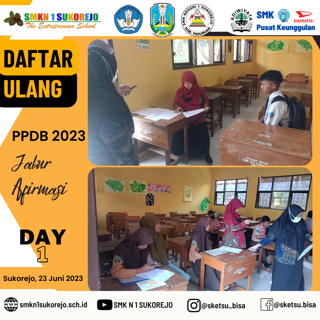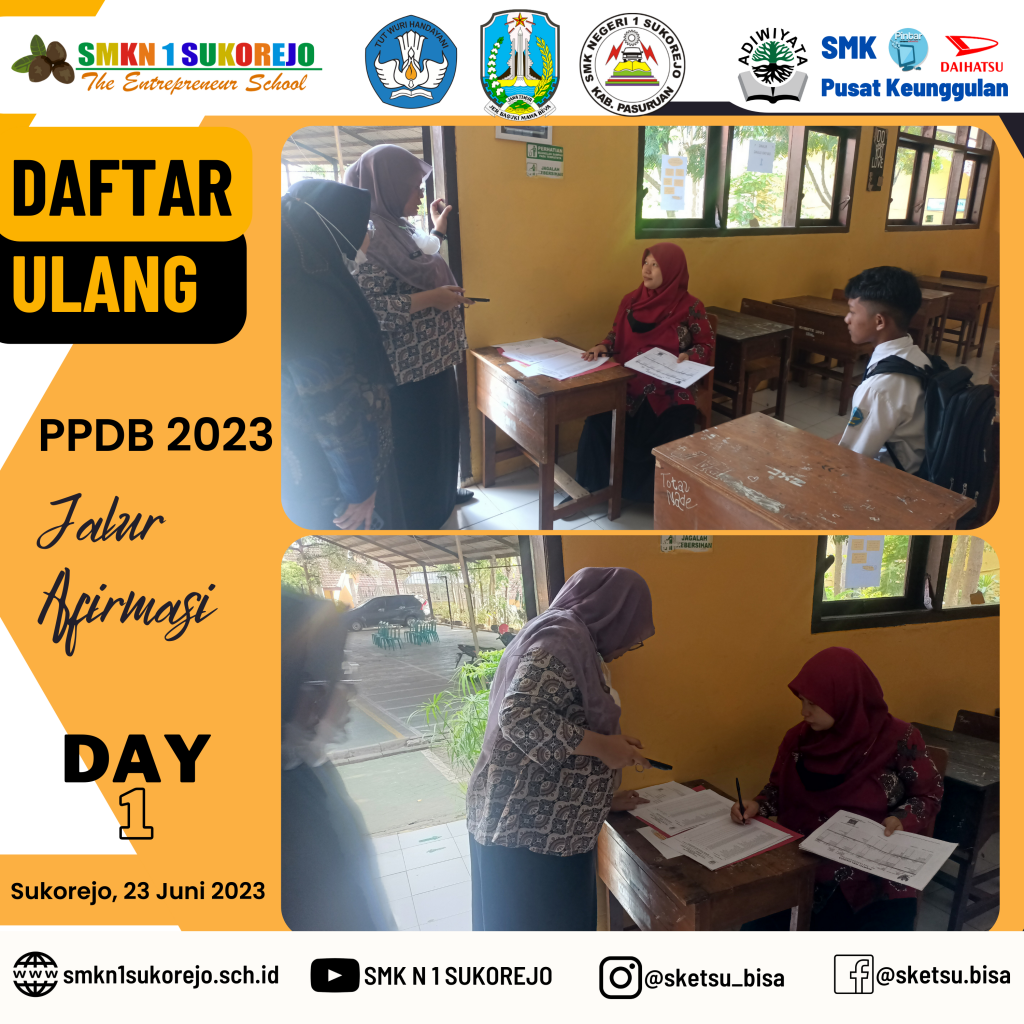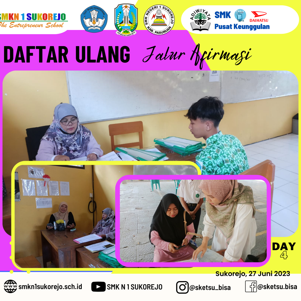 122 CALON PESERTA DIDIK BARU JALUR AFIRMASI LAKUKAN DAFTAR ULANG SECARA OFFLINE Agenda Sekolah Informasi Sekolah Kegiatan Sekolah 23 Juni 202327 Juni 2023 adminLeave a Comment on 122 CALON PESERTA DIDIK BARU JALUR AFIRMASI LAKUKAN DAFTAR ULANG SECARA OFFLINE [SKETSU BERAKSI]122 peserta didik baru telah dinyatakan LOLOS Jalur Afirmasi di SMK Negeri 1 Sukorejo… Selamat bergabung di Sekolah kami π€Bagi kalian yang namanya tercantum dalam daftar 122 siswa tersebut, segera lakukan daftar ulang secara offline di SMK Negeri 1 Sukorejo.Jika kalian tidak melakukan daftar ulang sesuai waktu yang telah ditentukan, maka akan dianggap Gugur loh πMakanya ayo buruan daftar ulang & lengkapi berkas berkas yang diperlukan π#smkn1sukorejo#sketsu#smkbisa#smkhebat#sketsubisahebat#sketsuberaksi#berakhlak#berkarya#berprestasi#ppdb2023#ppdbjatim2023#afirmasi2023 GALLERY