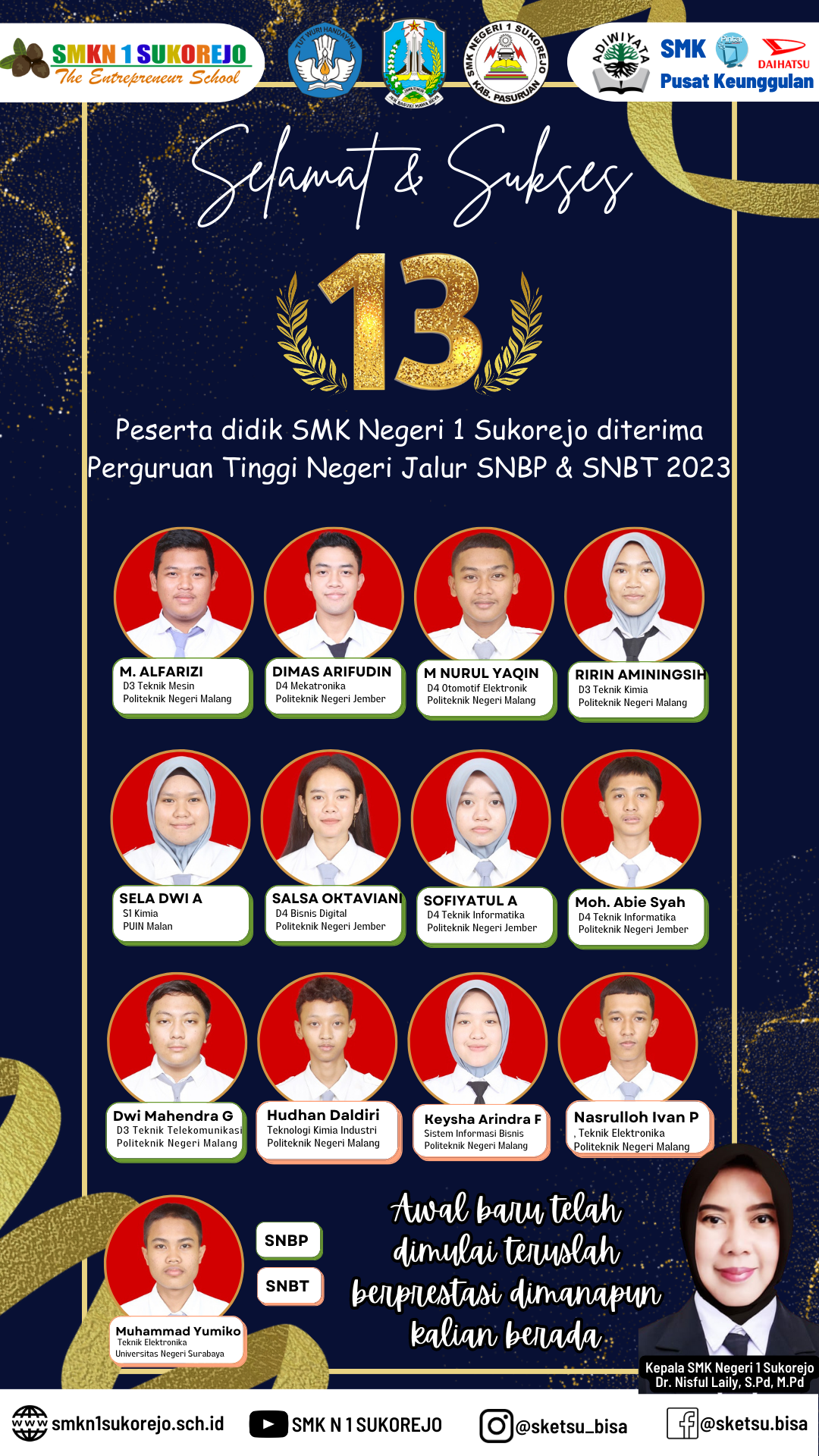 Selamat kepada 1. Hudhan Daldiri, Polinema, Teknologi Kimia Industri 2. Keysha Arindra Fabian, Polinema, Sistem Informasi Bisnis 3. Nasrulloh Ivan Pramudia, Polinema, Teknik Elektronika 4. Muhammad Yumiko, Unesa, Teknik Elektronika