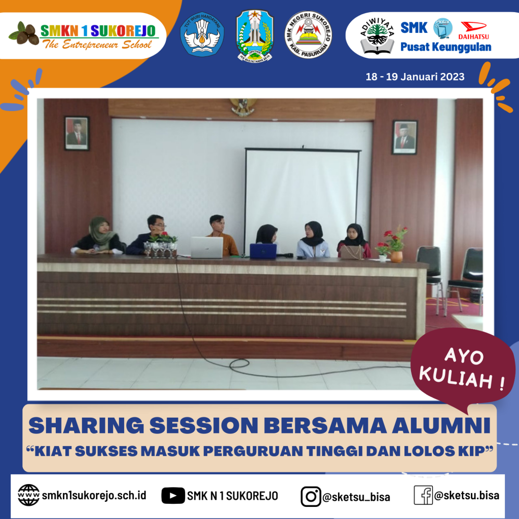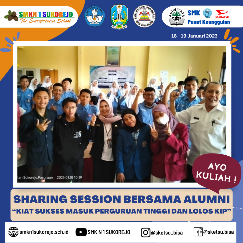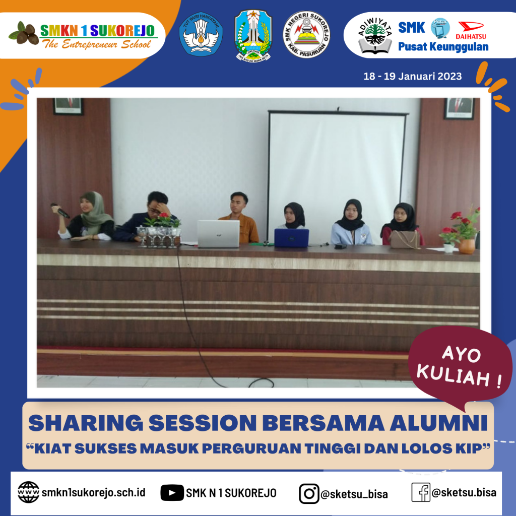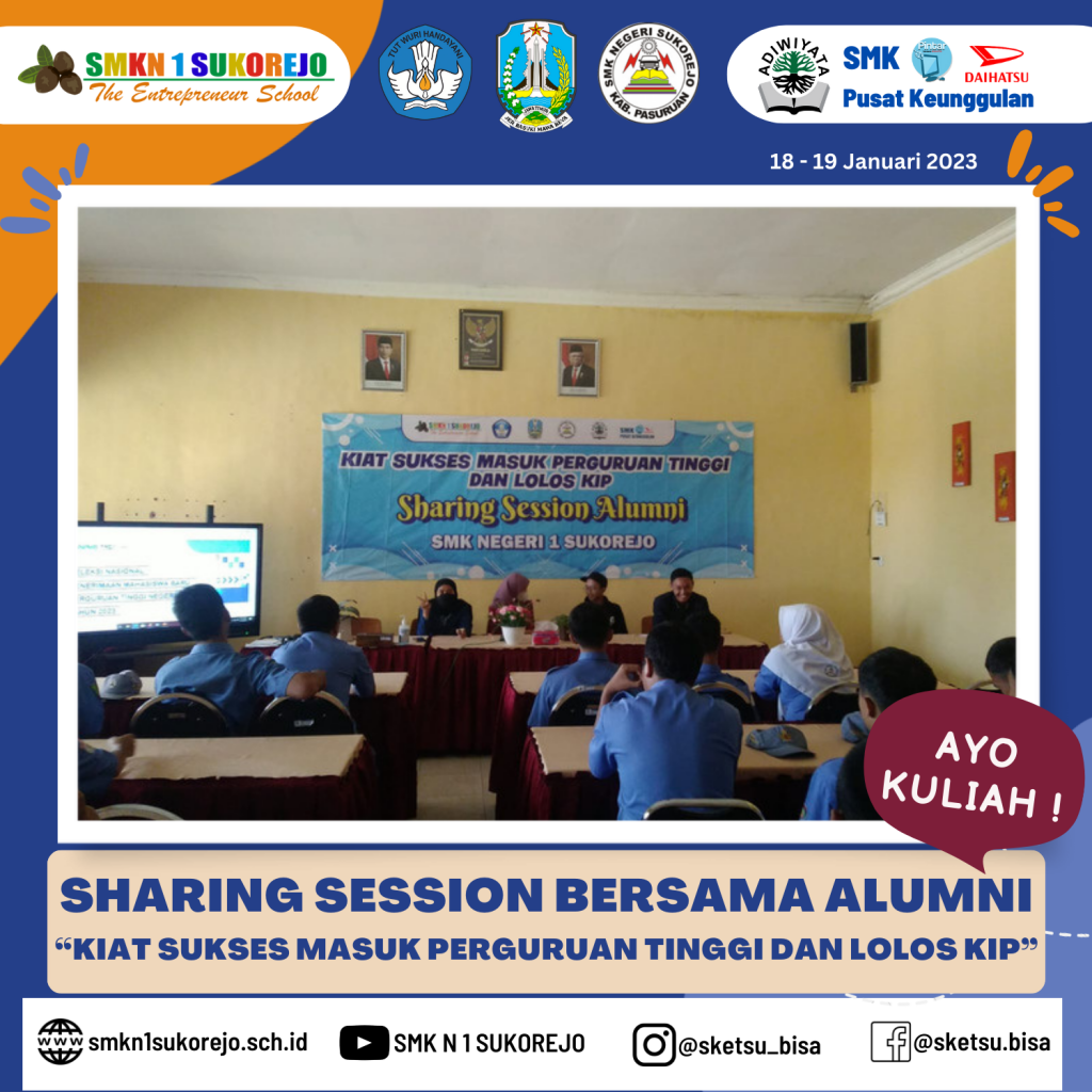 Guru BK SMK Negeri 1 Sukorejo mengadakan Sharing Session Bersama Alumni dalam rangka menjaring peserta didik yang memiliki minat untuk melanjutkan Pendidikan ke Perguruan Tinggi. Kegiatan ini mengambil tema “Kiat Sukses Masuk Perguruan Tinggi dan Lolos KIP”.