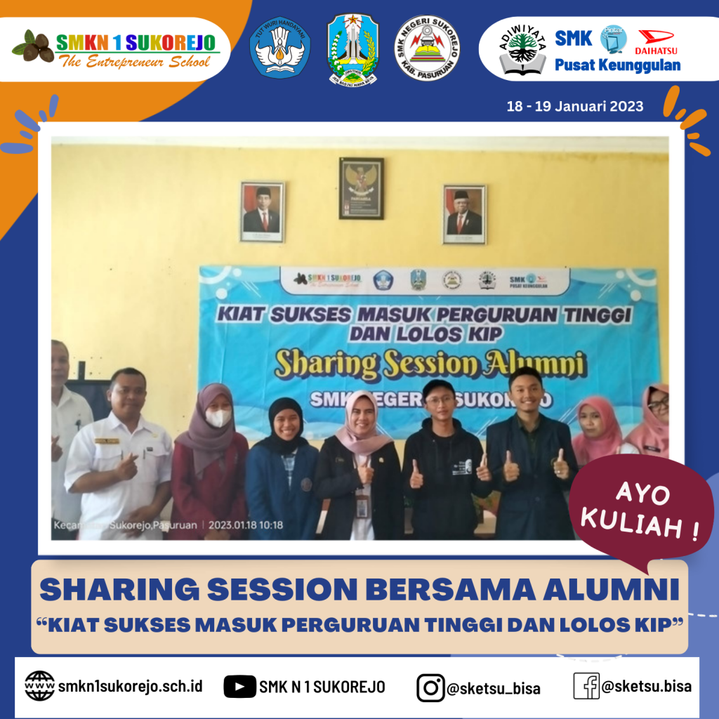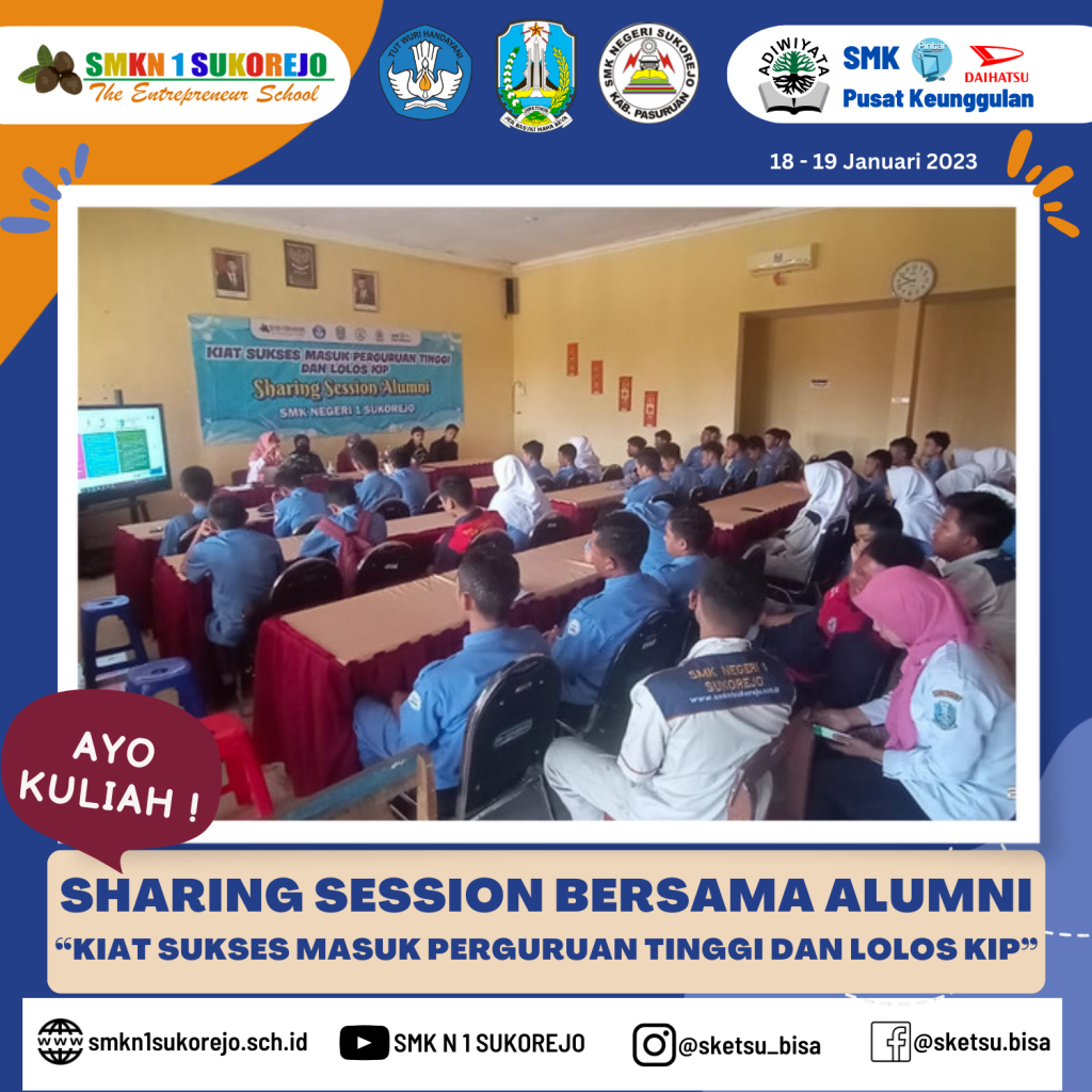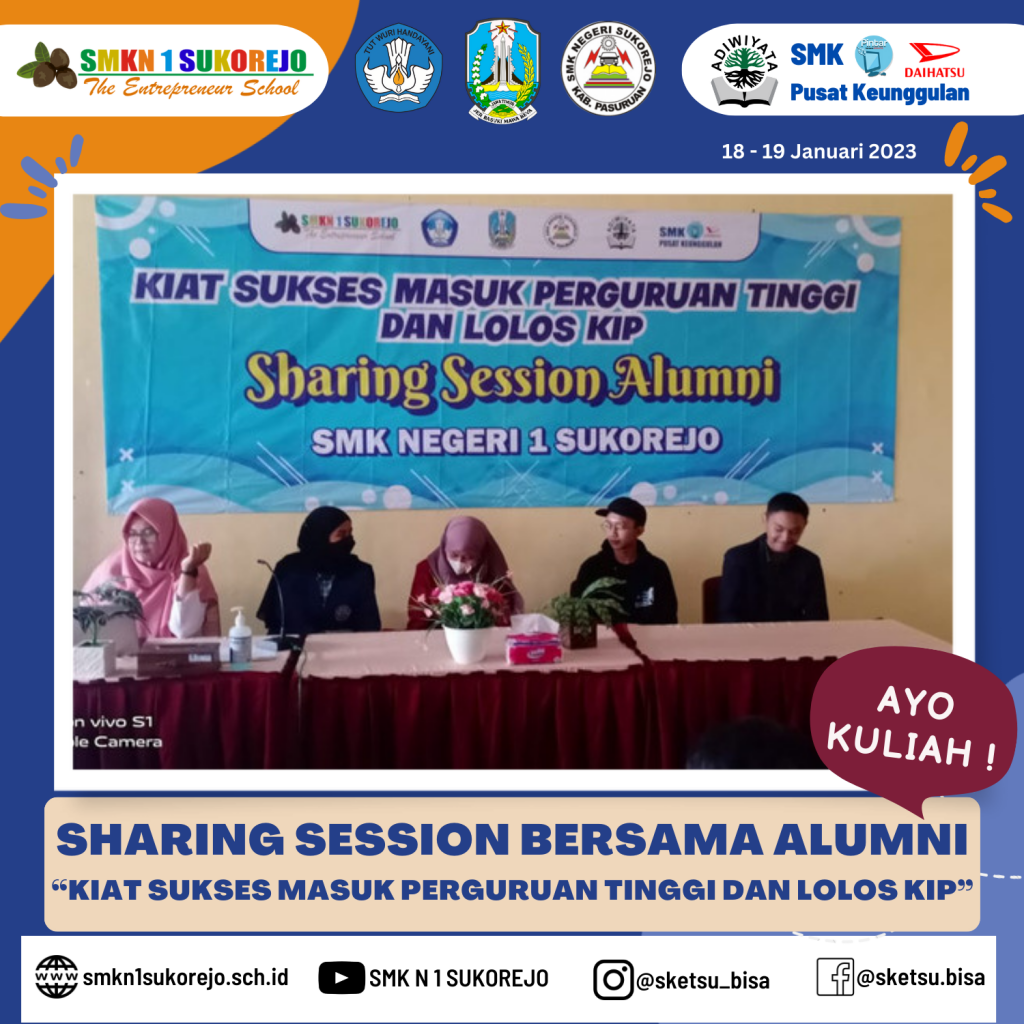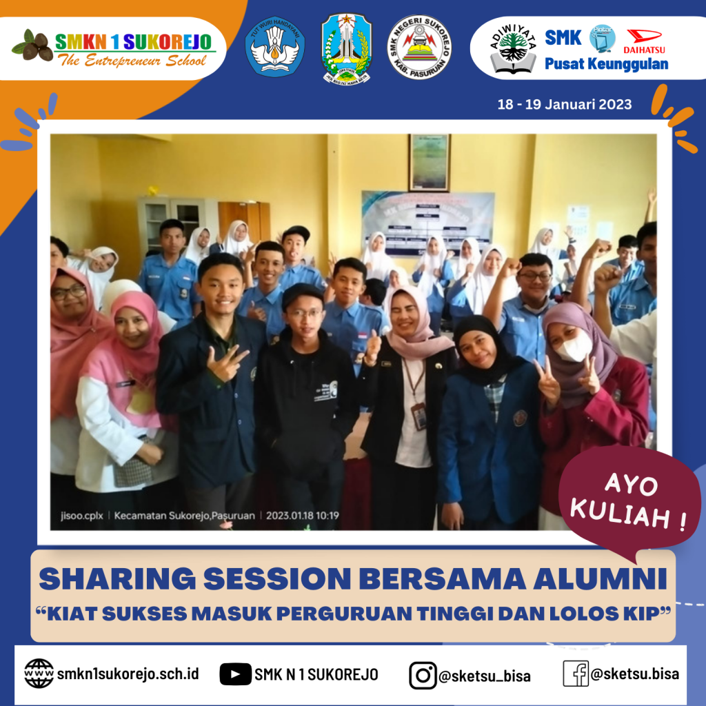 Guru BK SMK Negeri 1 Sukorejo mengadakan Sharing Session Bersama Alumni dalam rangka menjaring peserta didik yang memiliki minat untuk melanjutkan Pendidikan ke Perguruan Tinggi. Kegiatan ini mengambil tema “Kiat Sukses Masuk Perguruan Tinggi dan Lolos KIP”.