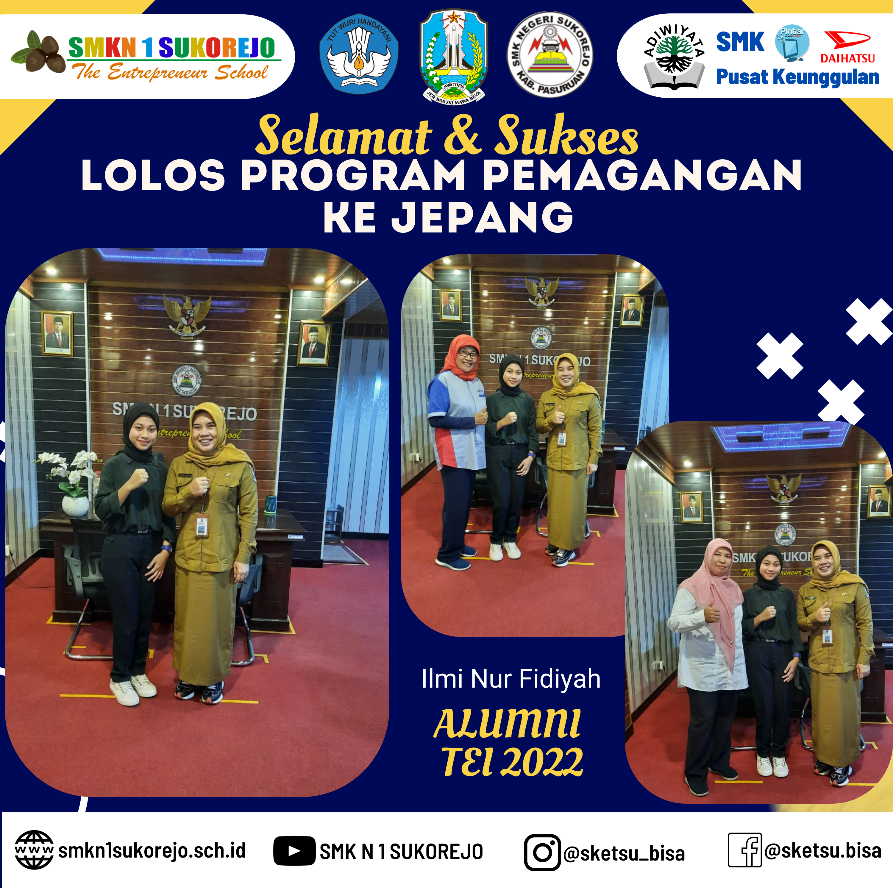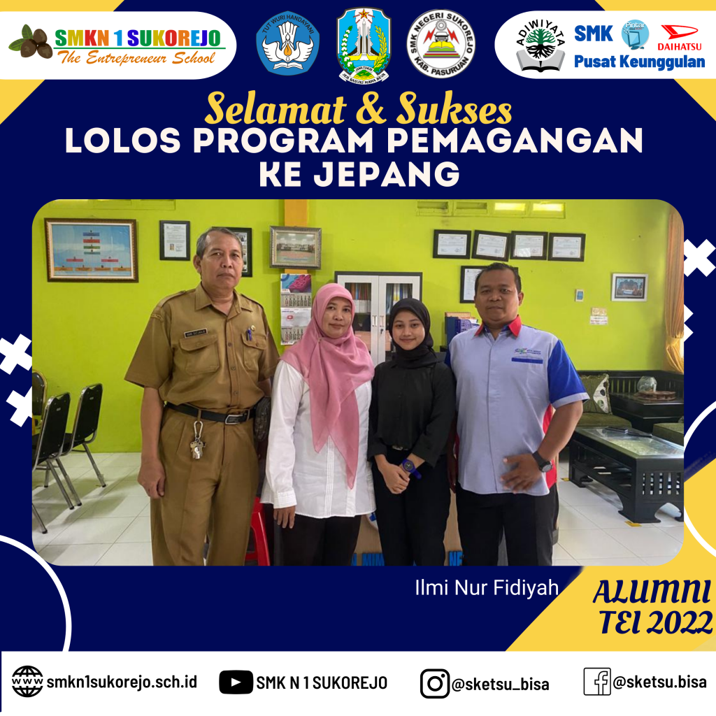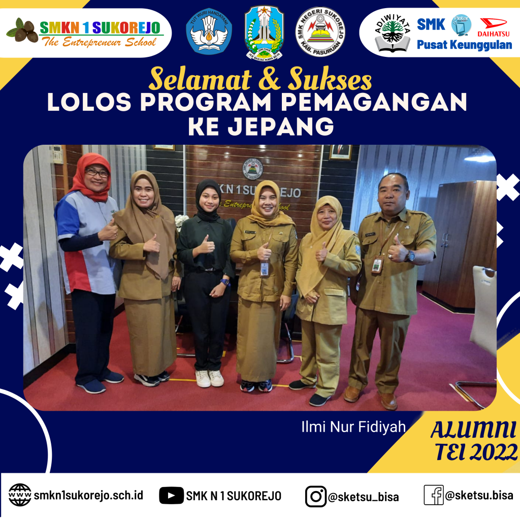 Selasa 20 Juni 2023 Ilmi hadir ke Sekolah Sebagai bentuk terimakasih kepada Bapak & Ibu Guru. Ilmi menambah daftar panjang Alumni SMK Negeri 1 Sukorejo yang berhasil lolos program Magang ke Jepang