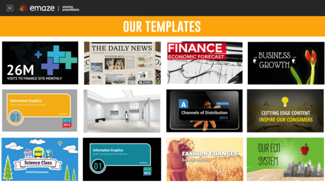 Guru dapat menggunakan Emaze untuk membuat presentasi yang menarik dan diingat para siswa. Emaze adalah software presentasi online yang dibuat dengan teknologi html5. Penggunanya dapat membuat, menentukan dan membagikan presentasi mereka melalui cloud-based SaaSsystem. Tak hanya buat guru, siswa pun dapat menggunakan alat ini untuk membuat presentasi dengan berbagai topik