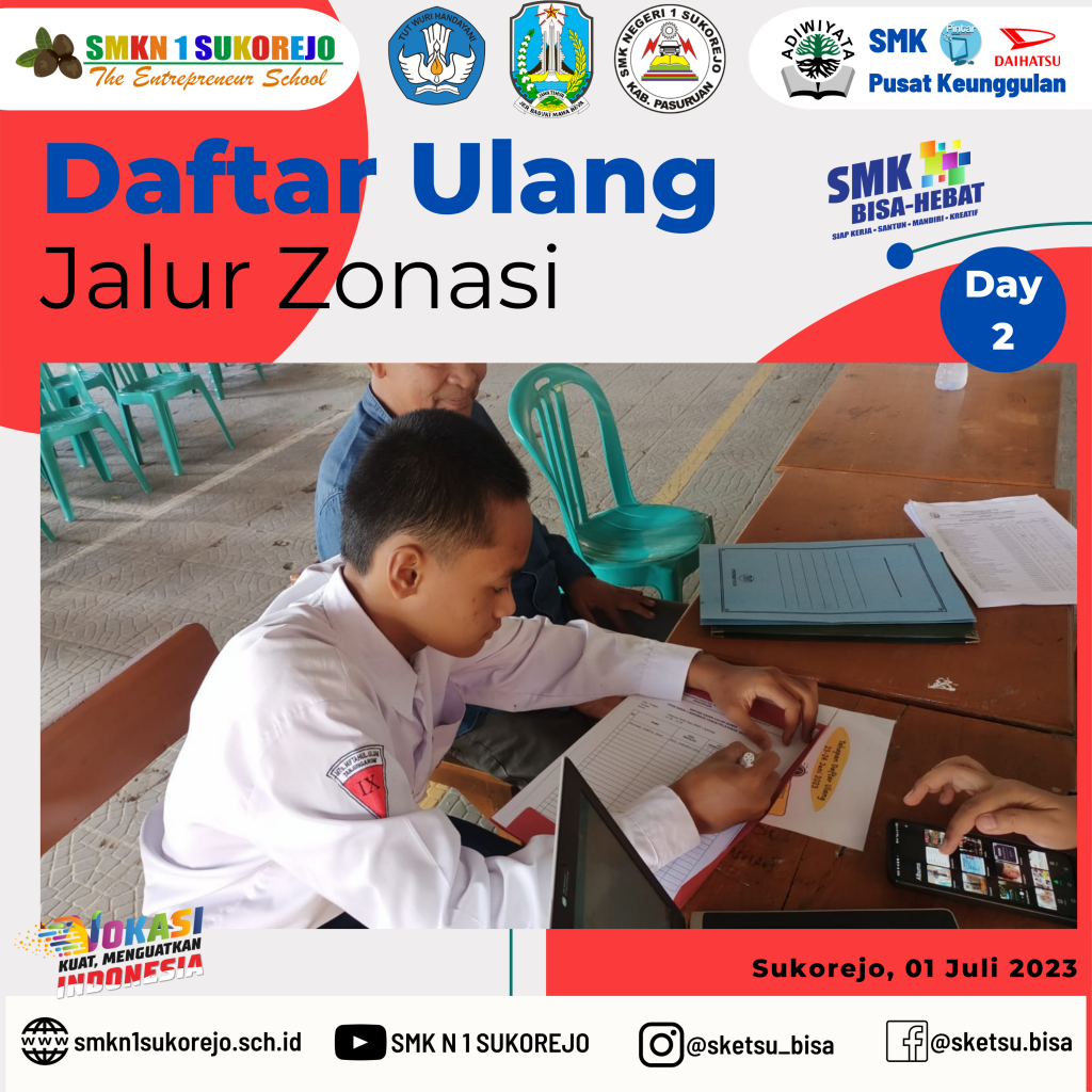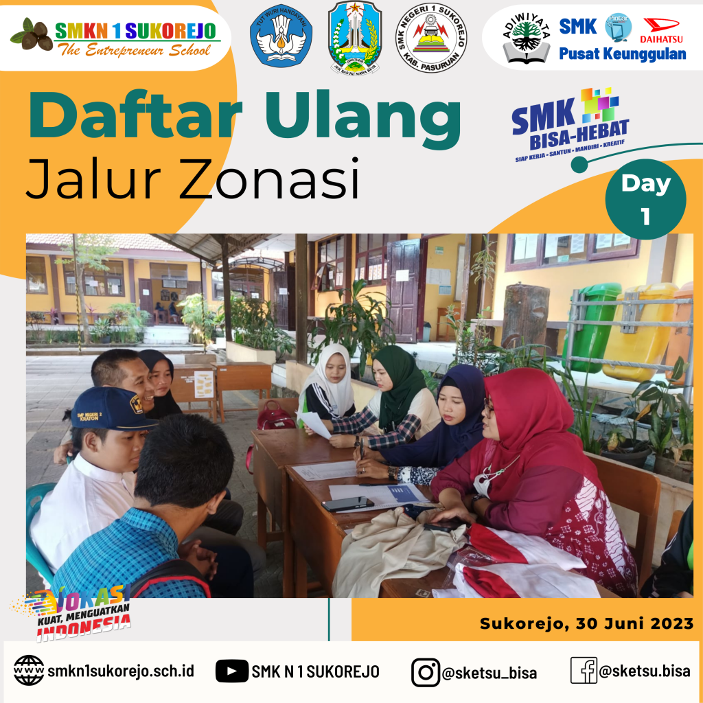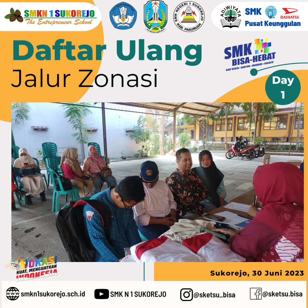 Sukorejo, 30 Juni sampai 01 Juli 2023 SMK Negeri 1 Sukorejo melayani Daftar Ulang secara offline untuk calon peserta didik baru yang diterima di Jalur Zonasi.