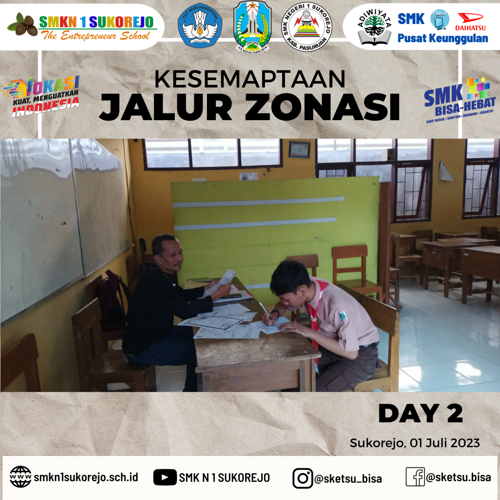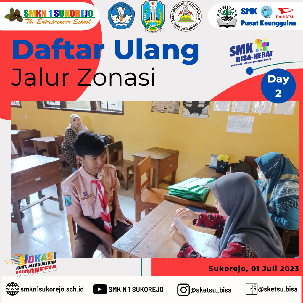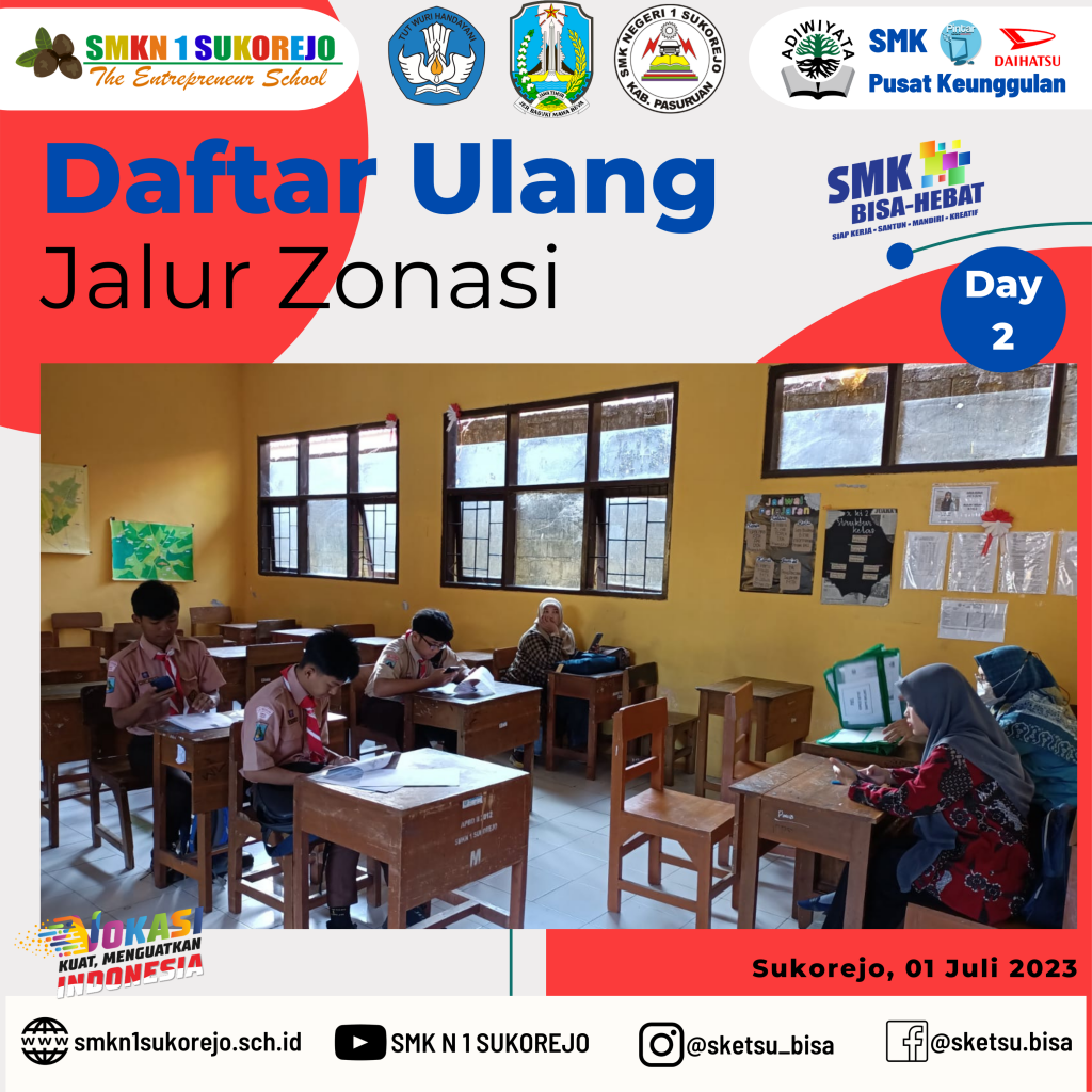 Sukorejo, 30 Juni sampai 01 Juli 2023 SMK Negeri 1 Sukorejo melayani Daftar Ulang secara offline untuk calon peserta didik baru yang diterima di Jalur Zonasi.
