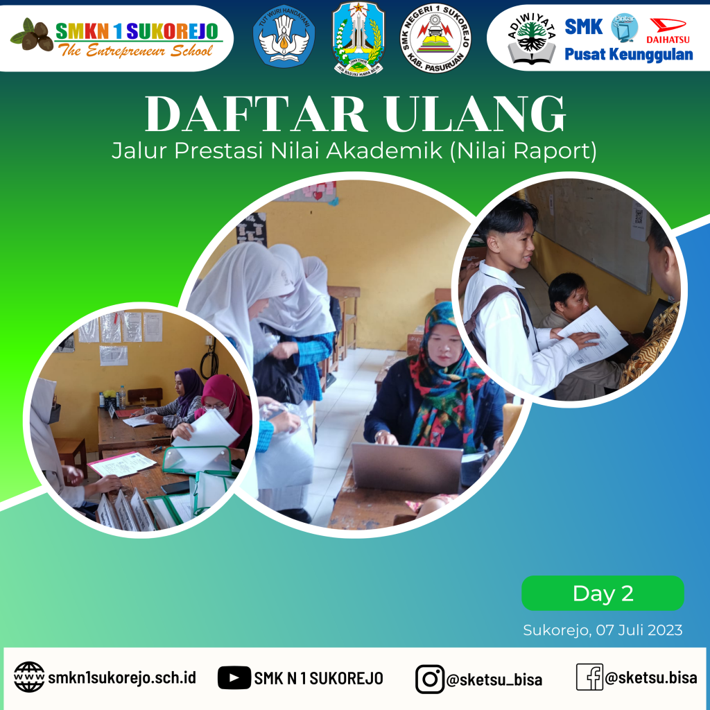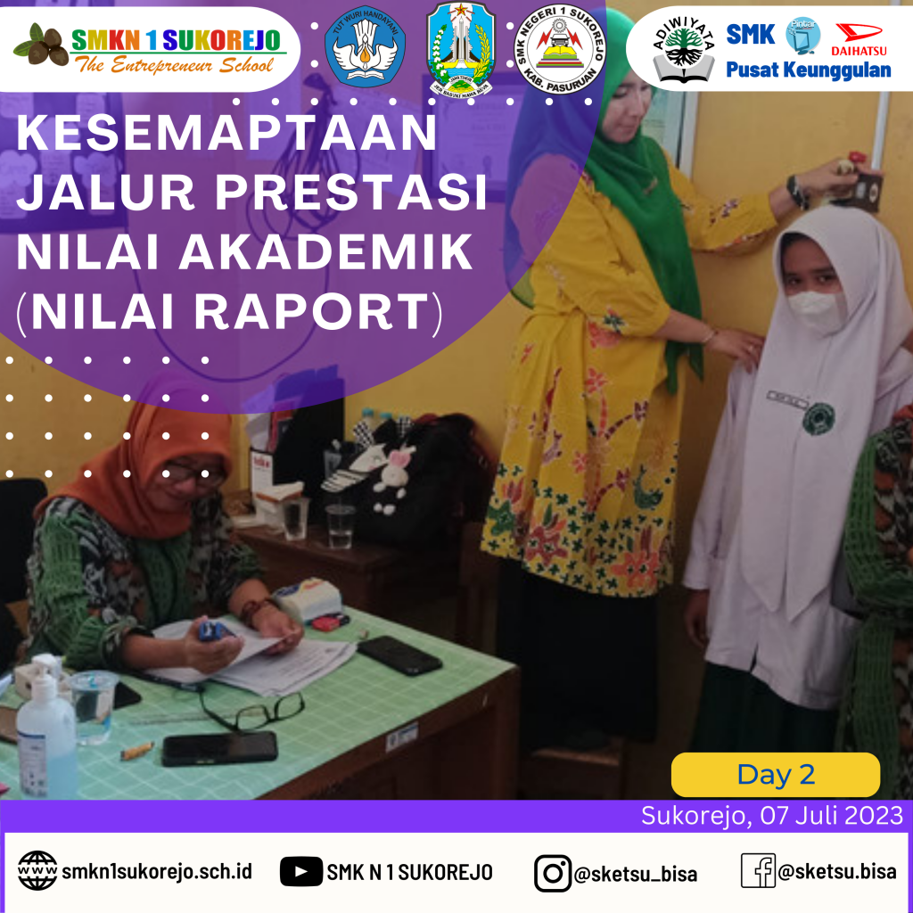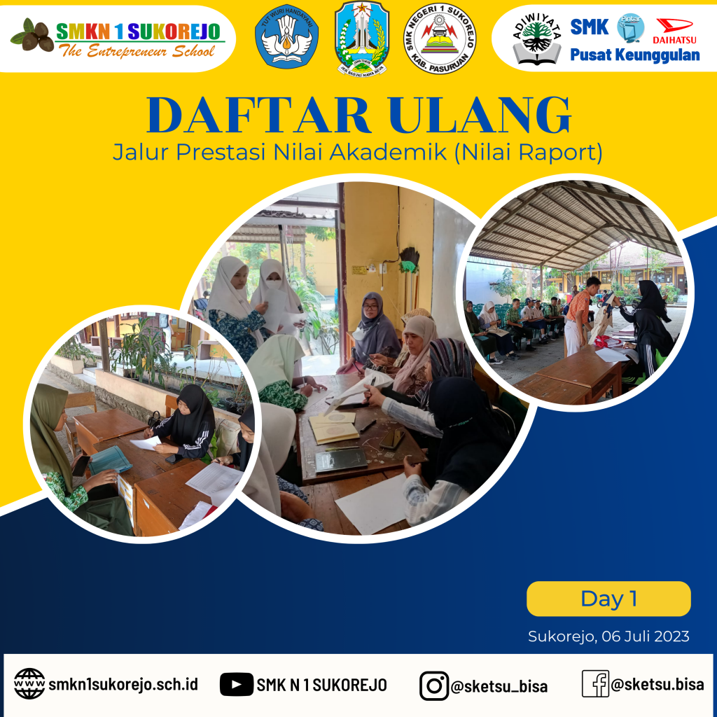 DAFTAR ULANG & KESEMAPTAAN PPDB JALUR PRESTASI NILAI AKADEMIK (NILAI RAPORT) Agenda Sekolah Informasi Sekolah Kegiatan Sekolah 6 Juli 20237 Juli 2023 adminLeave a Comment on DAFTAR ULANG & KESEMAPTAAN PPDB JALUR PRESTASI NILAI AKADEMIK (NILAI RAPORT) [SKETSU BERAKSI]Daftar Ulang & Kesemaptaan Jalur Prestasi Nilai AkademikSelamat untuk adik adik yang sudah diterima dijalur Prestasi Nilai Akademik… Jangan lupa segera lakukan Daftar Ulang secara offline pada :Hari : Kamis – SabtuTanggal : 06 – 08 Juli 2023Pukul : 08.00 – 11.00 WIBTempat : SMK Negeri 1 SukorejoKami tunggu kedatangannya 🤗#smkn1sukorejo#sketsu#smkbisa#smkhebat#sketsubisahebat#sketsuberaksi#berakhlak#berkarya#berprestasi#ppdb2023#ppdbjatim2023#prestasinilaiakademik2023 GALLERY