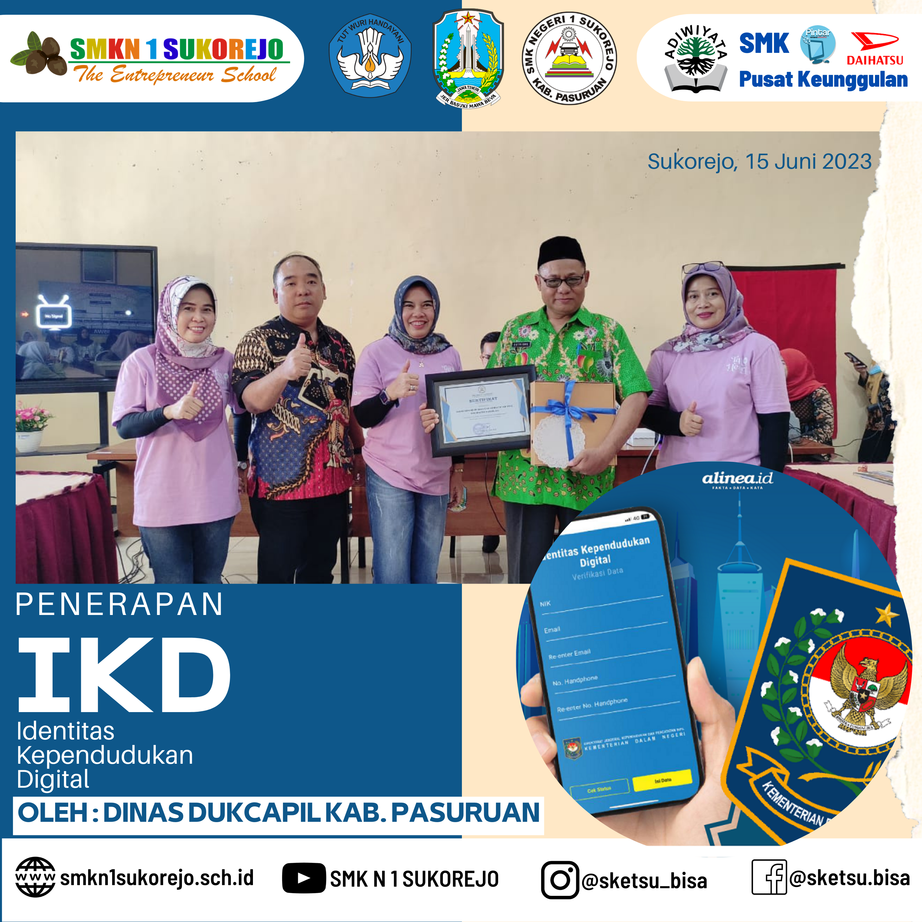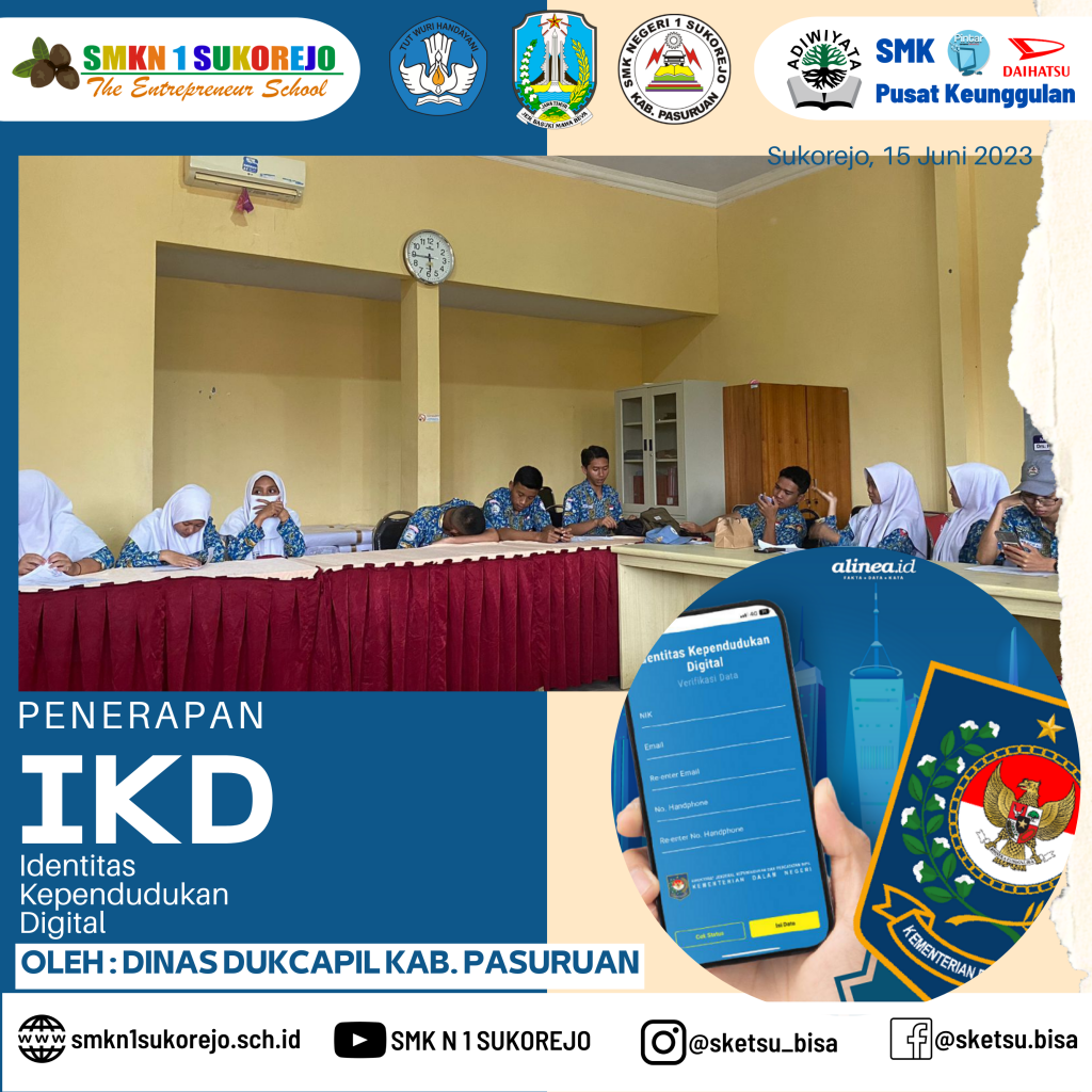 Sukorejo, 15 Juni 2023, Dinas Kependudukan dan Catatan Sipil Kabupaten Pasuruan berkesempatan hadir di SMK Negeri 1 Sukorejo dalam rangka Menerapkan Identitas Kependudukan Digital (IKD).
