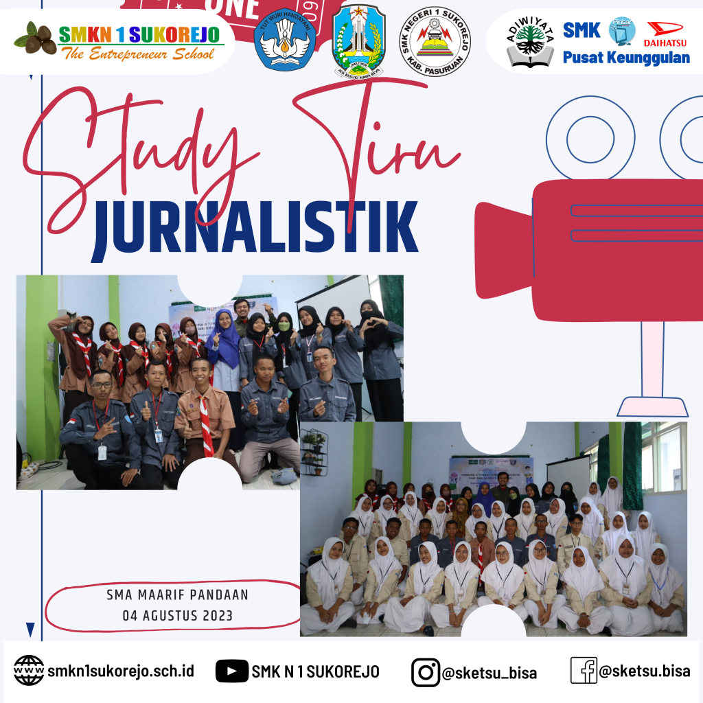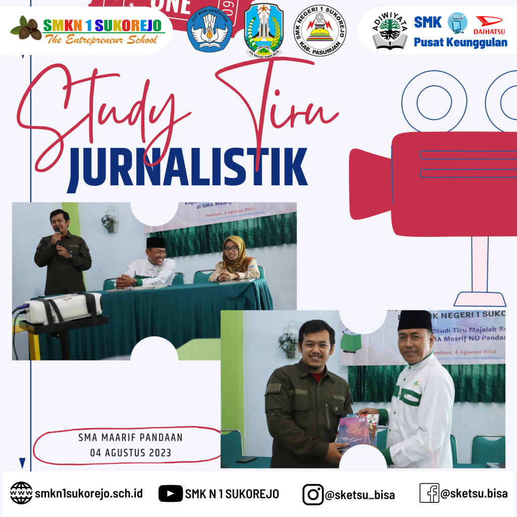 Jum’at, 04 Agustus 2023 Tim Ekstrakurikuler Jurnalistik SMK Negeri 1 Sukorejo melaksanakan studi tiru di SMA Maarif Pandaan, kedatangan pembina dan peserta estrakurikuler dari SMK Negeri 1 Sukorejo disambut dengan sangat hangat oleh pihak SMA Maarif Pandaan.