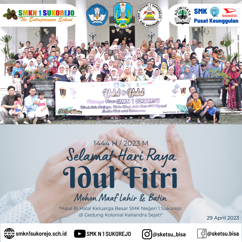 Kami keluarga besar SMK Negeri 1 Sukorejo mengucapkan Selamat Hari Raya Idul Fitri 1444 H Mohon Maaf lahir dan batin.