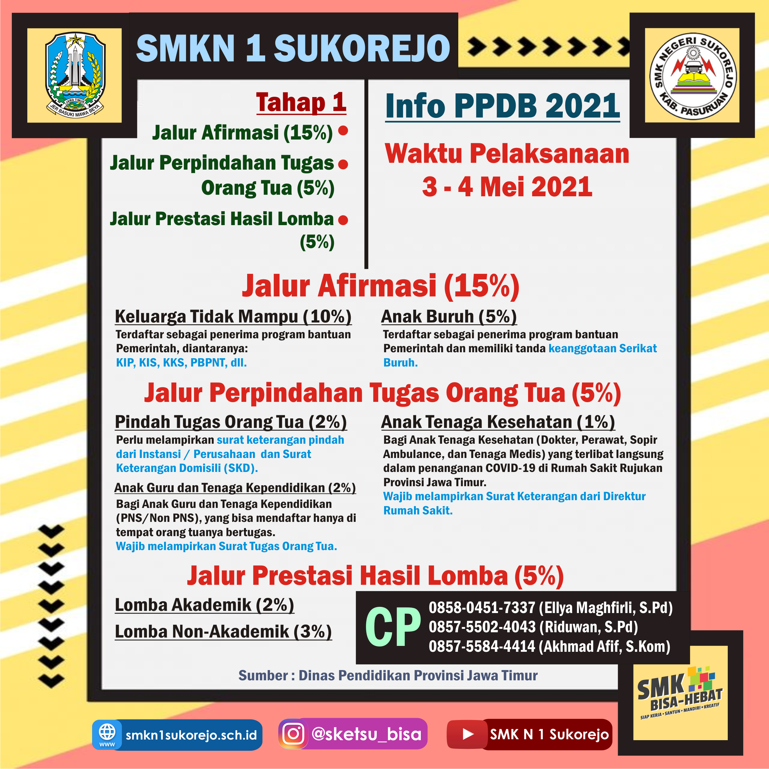 PPDB SMKN 1 Sukorejo mengacu pada Juknis yang diedarkan oleh Kepala Dinas Pendidikan Provinsi Jawa Timur dimana dibagi menjadi 3 tahap, diantaranya: