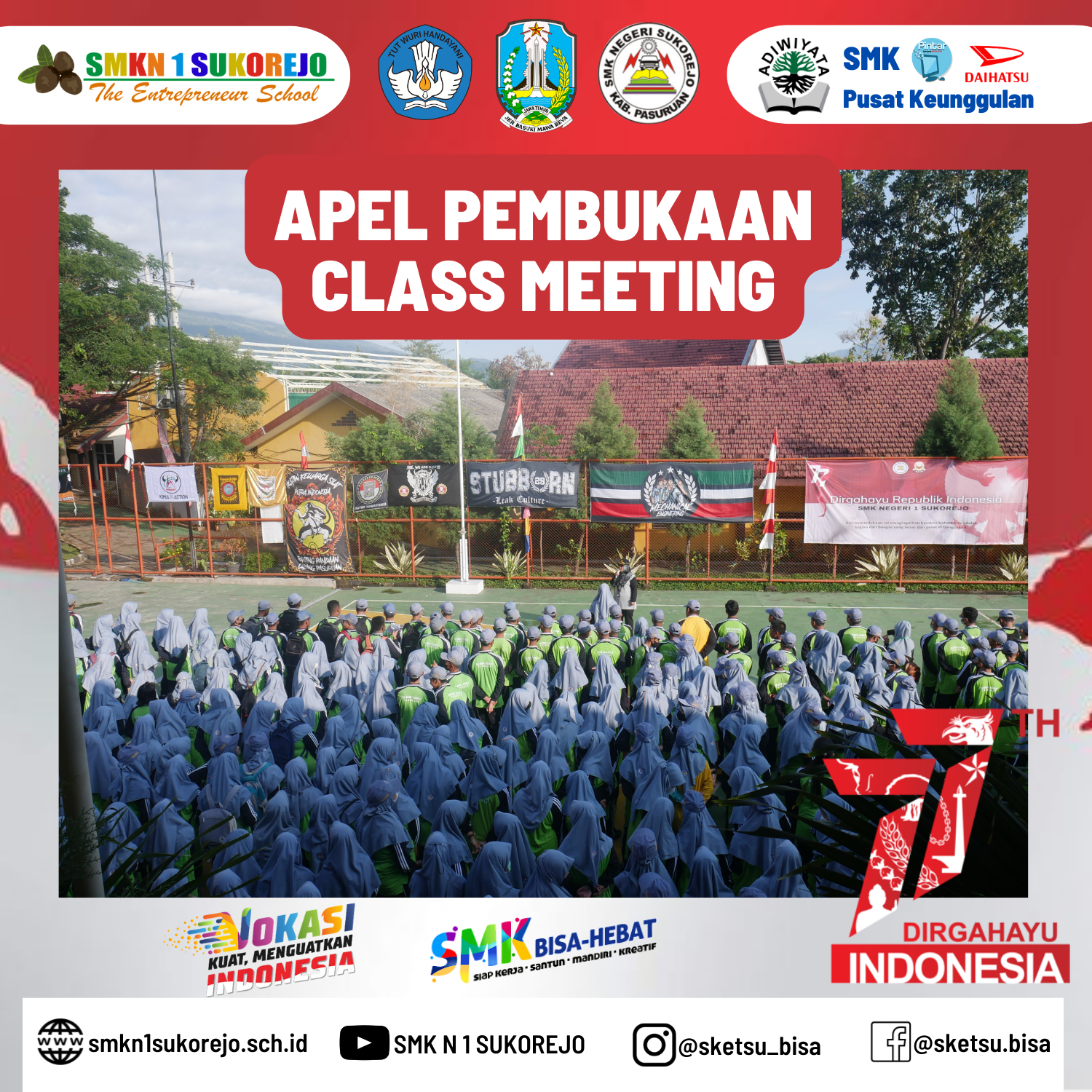 Hari kemerdekaan Republik Indonesia akan segera tiba, SMK Negeri 1 Sukorejo turut serta meramaikan detik detik menjelang HUT RI ke 77 Tahun dengan berbagai kegiatan.