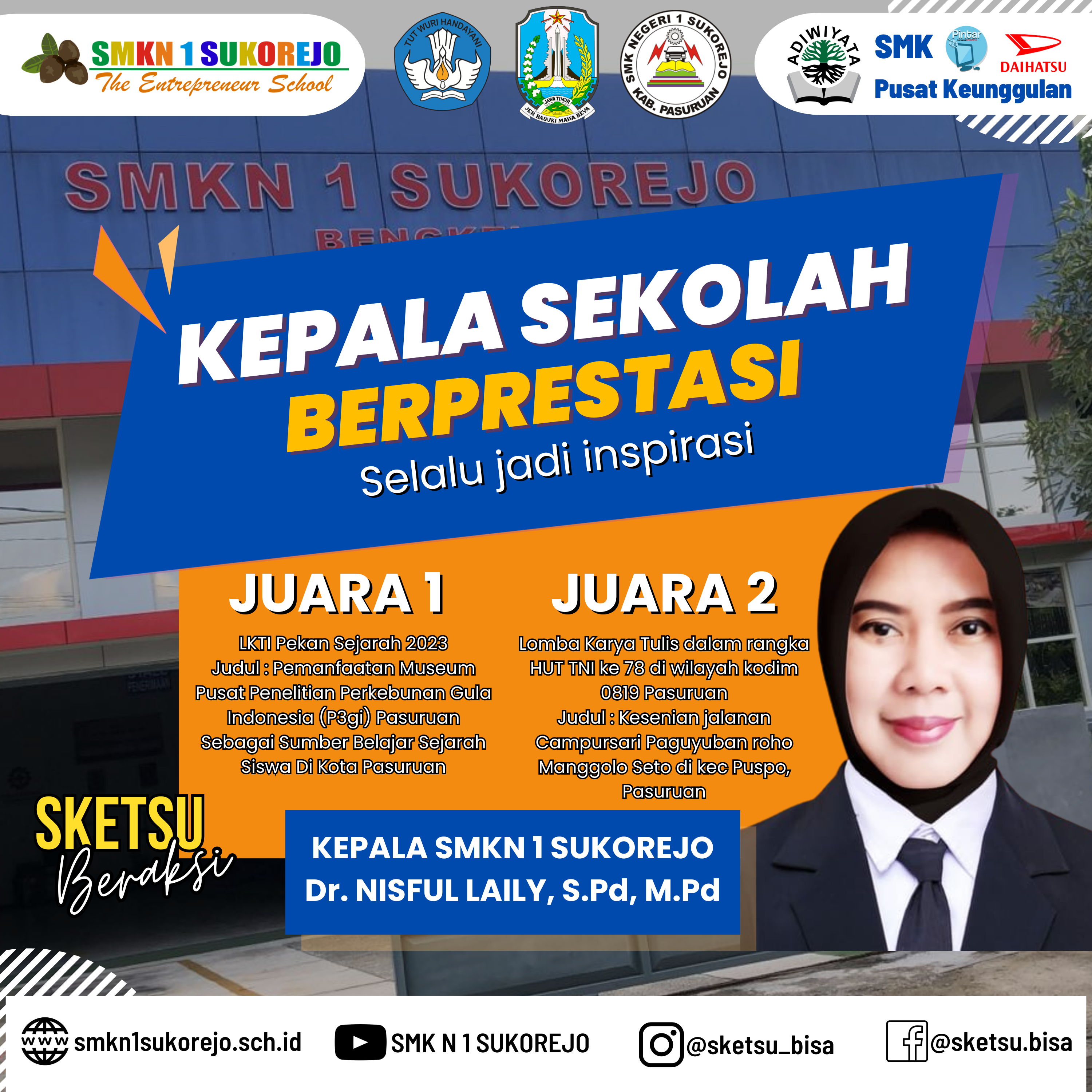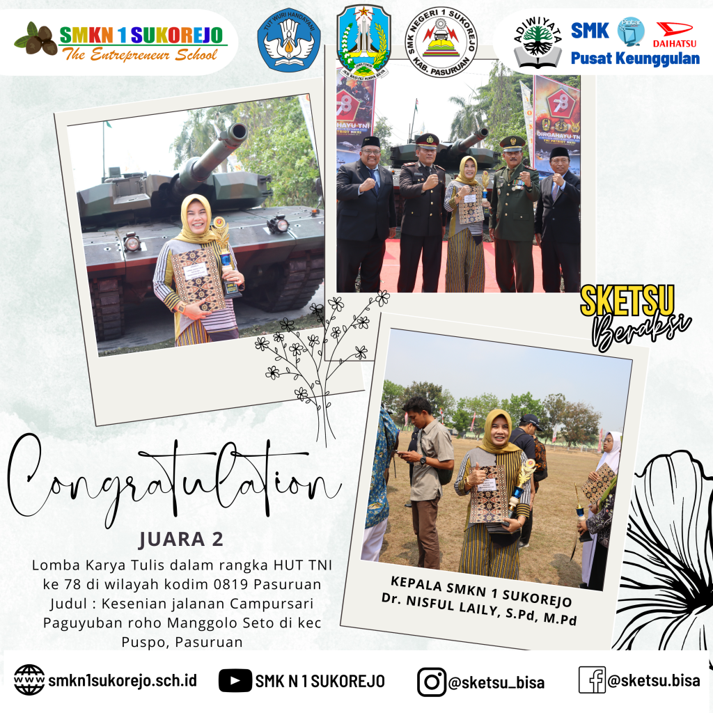 Kepala SMK Negeri 1 Sukorejo (Ibu Dr. NISFUL LAILY, S.Pd, M.Pd) selalu menginspirasi kami semua untuk terus berprestasi. Baru baru ini Ibu Nisful berhasil meraih JUARA 1 untuk karya tulisnya yang berjudul “Pemanfaatan Museum Pusat Penelitian Perkebunan Gula Indonesia (P3gi) Pasuruan Sebagai Sumber Belajar Sejarah Siswa Di Kota Pasuruan” dalam LKTI Pekan Sejarah 2023, hal ini membuktikan eksistensinya sebagai Guru Sejarah Indonesia memang sangat mumpuni. Selain itu Ibu Nisful juga meraih JUARA 2 dalam Lomba Karya Tulis dalam rangka HUT TNI ke 78 di wilayah kodim 0819 Pasuruan kategori Masyarakat/Pelajar/Mahasiswa dengan judul Kesenian jalanan Campursari Paguyuban roho Manggolo Seto di kec Puspo, Pasuruan