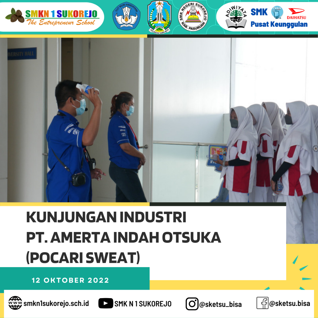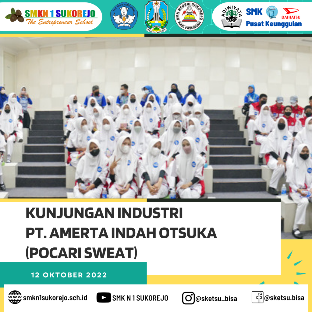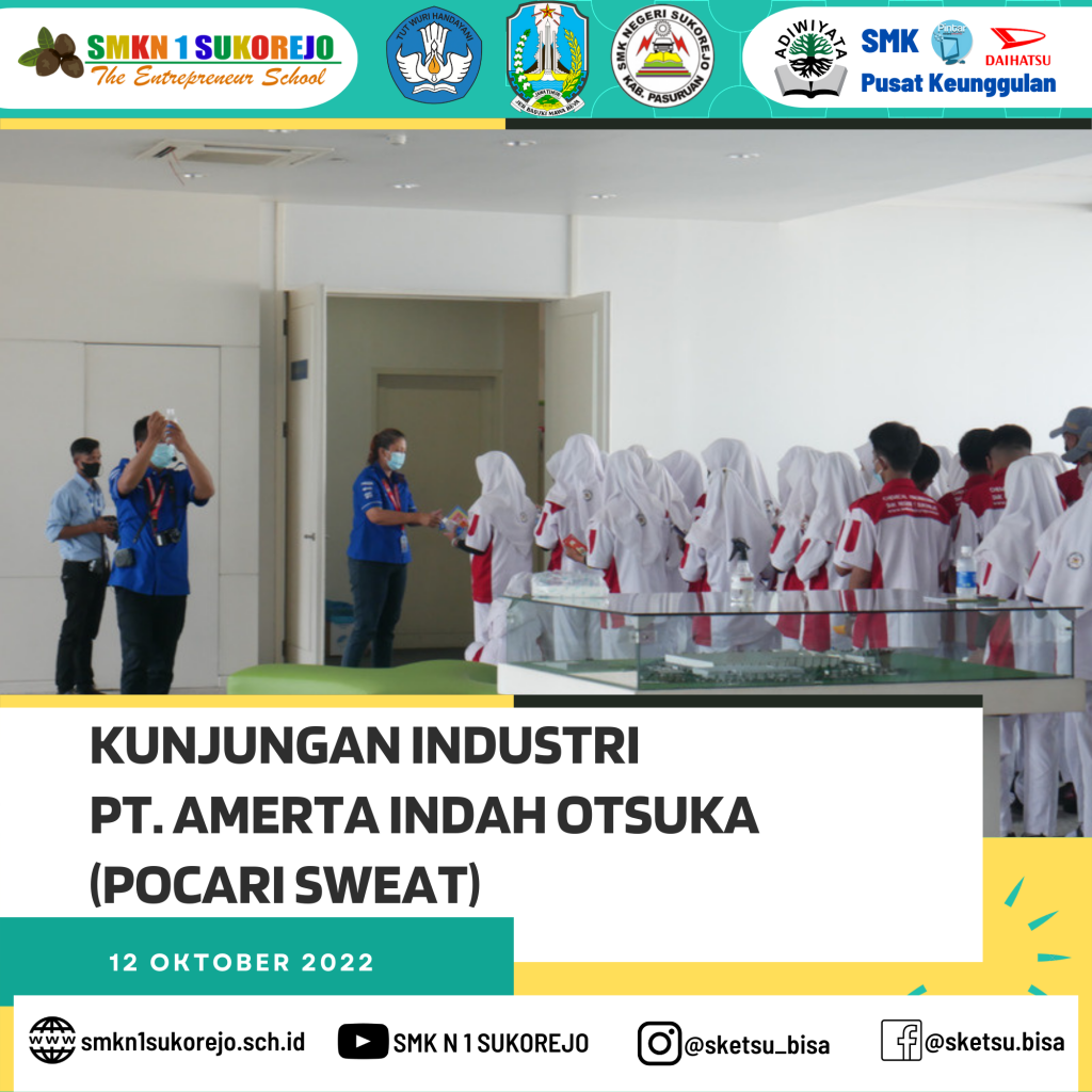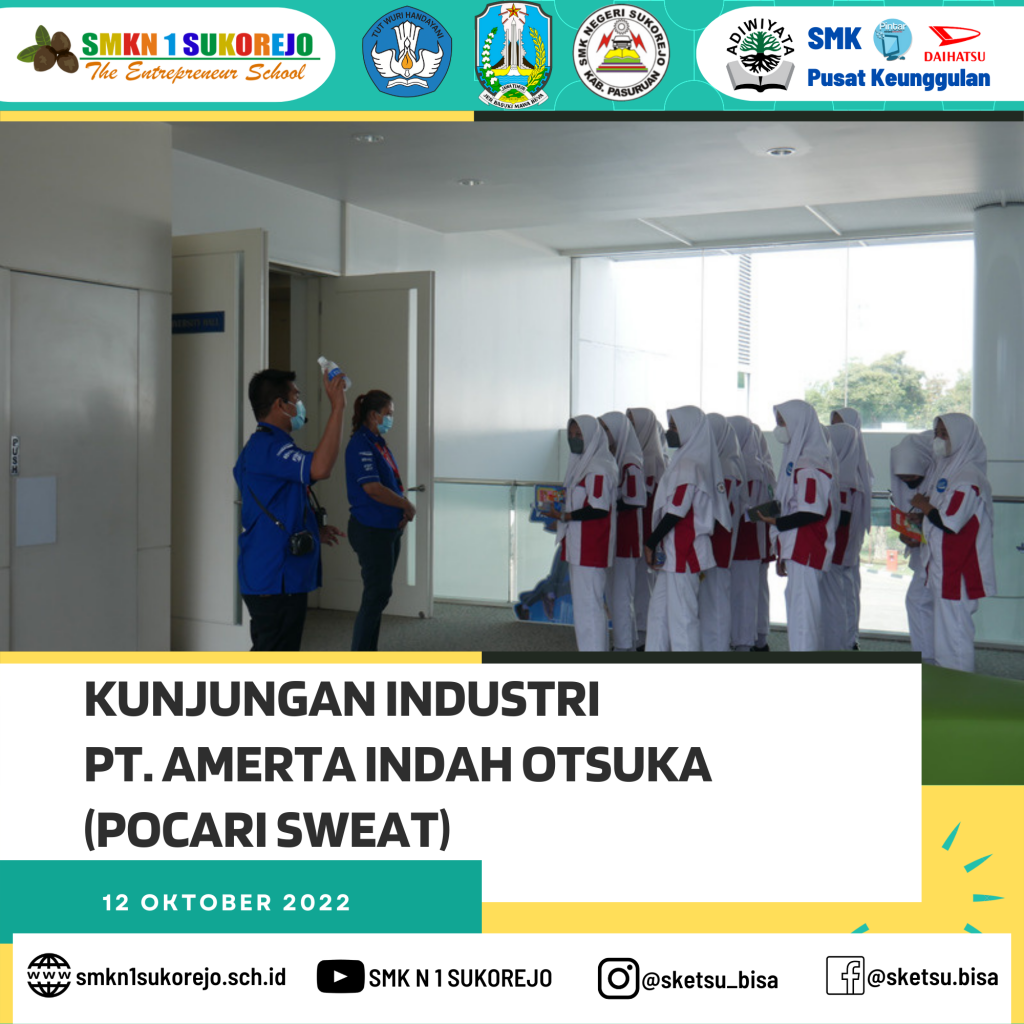 Sukorejo, 12 Oktober 2022 Peserta didik SMK Negeri 1 Sukorejo melakukan kunjungan industri ke PT. Amerta Indah Otsuka (Pocari Sweat) – Kejayan Pasuruan. PT Amerta Indah Otsuka adalah bagian dari Otsuka Parmaceutical Co., Ltd Jepang dengan produk terkemuka seperti Pocari Sweat, SOYJOY, dan Ionessence.