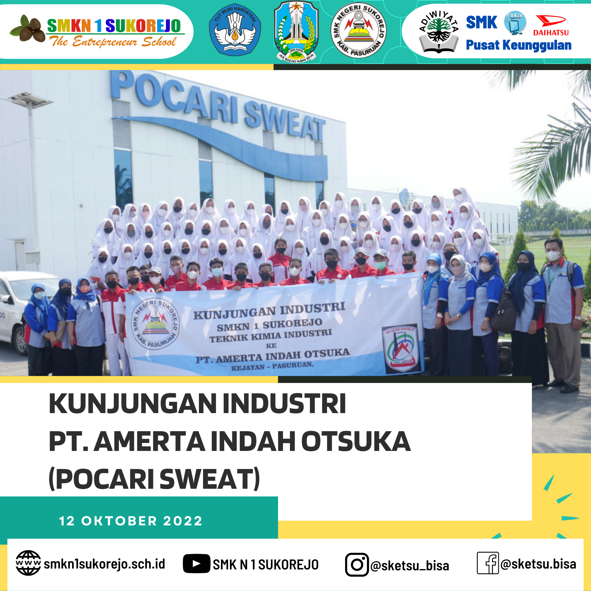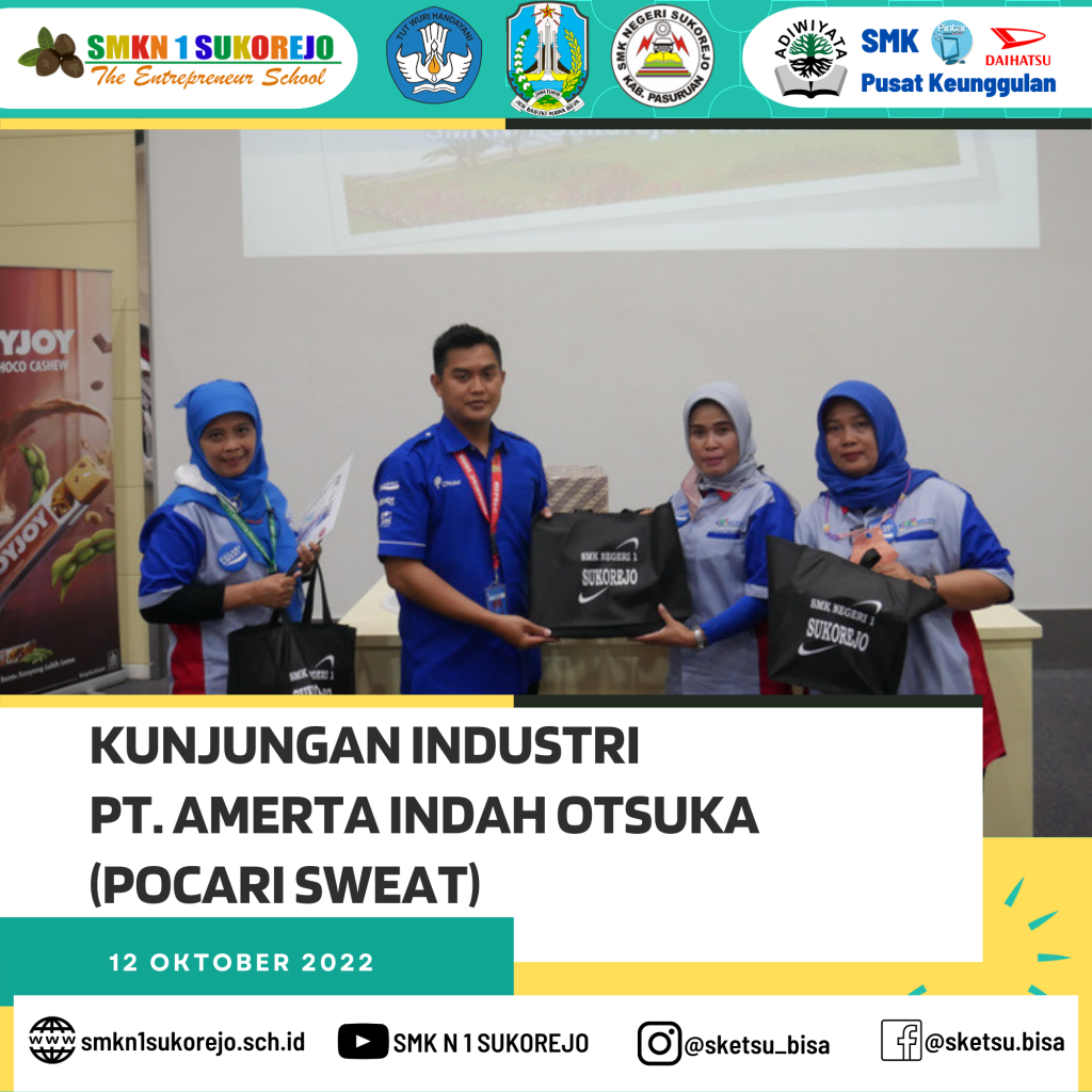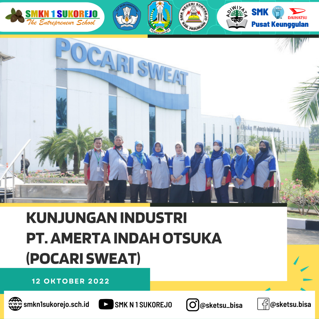 Sukorejo, 12 Oktober 2022 Peserta didik SMK Negeri 1 Sukorejo melakukan kunjungan industri ke PT. Amerta Indah Otsuka (Pocari Sweat) – Kejayan Pasuruan. PT Amerta Indah Otsuka adalah bagian dari Otsuka Parmaceutical Co., Ltd Jepang dengan produk terkemuka seperti Pocari Sweat, SOYJOY, dan Ionessence.