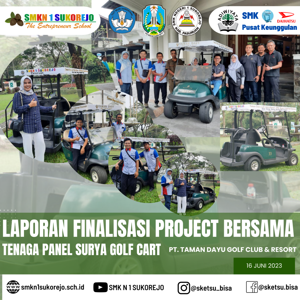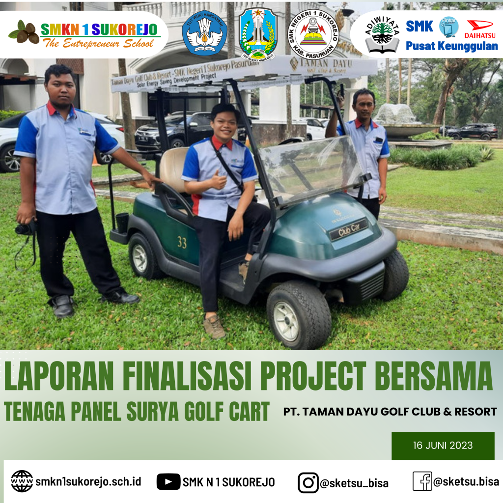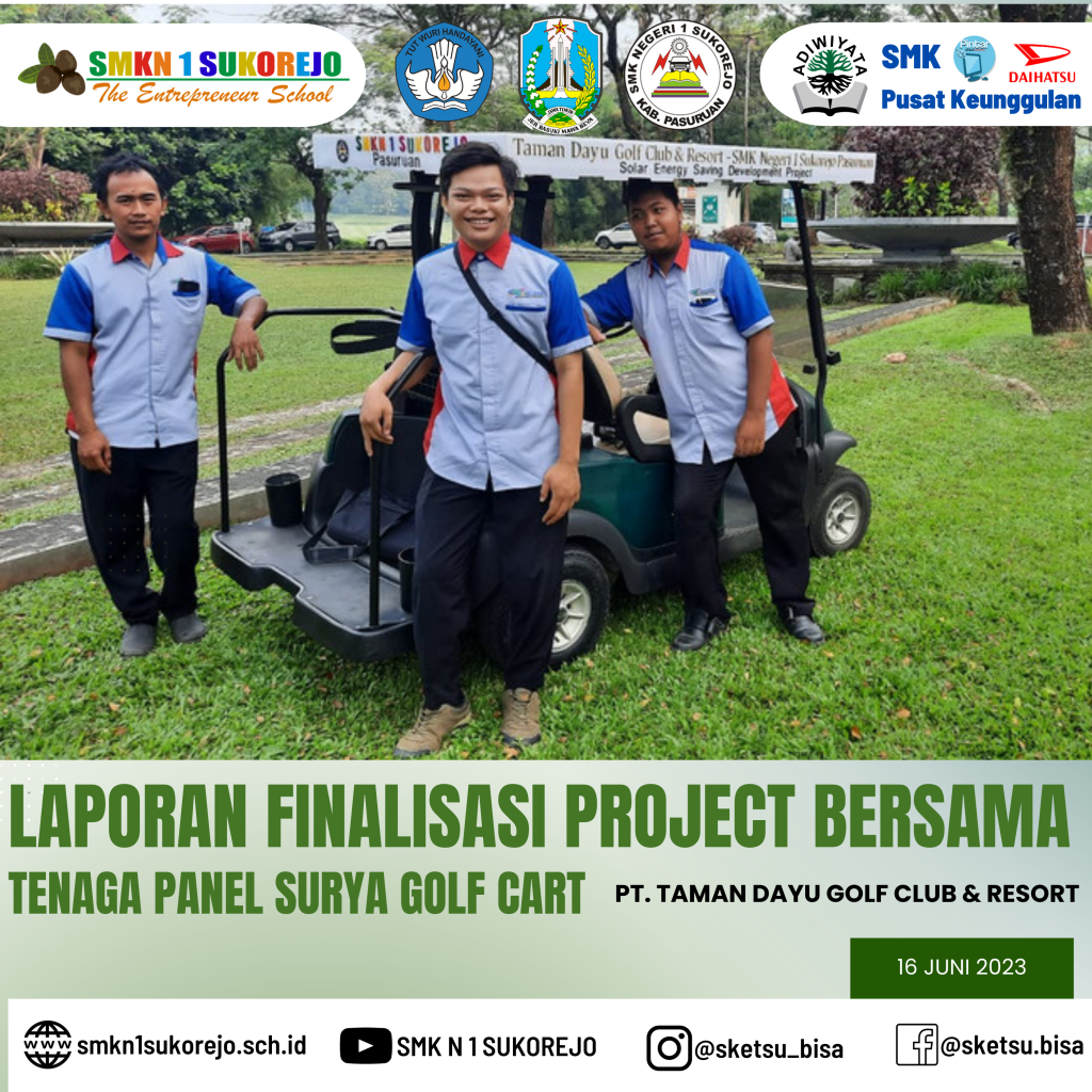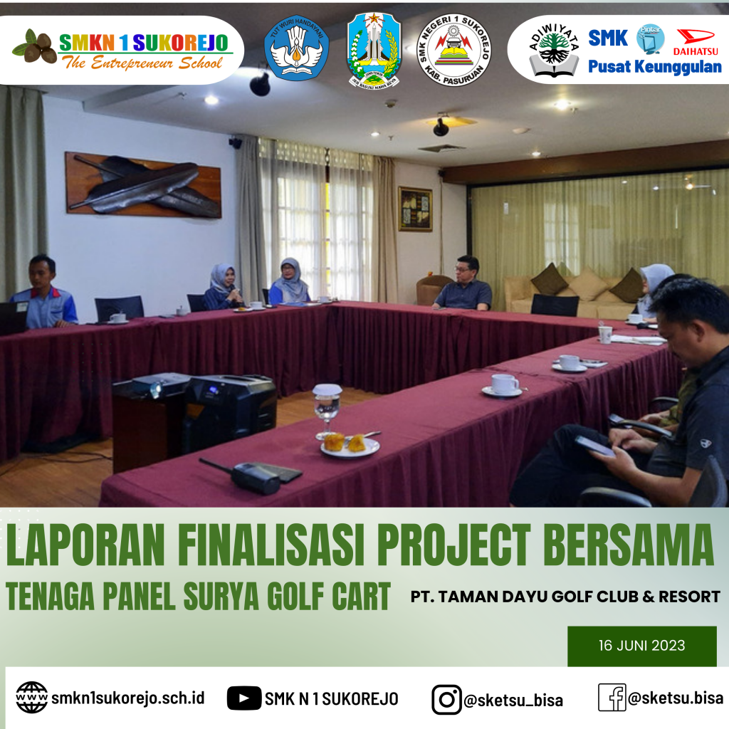 Jum’at, 16 Juni 2023 Kepala SMK Negeri 1 Sukorejo bersama Tim Project Bersama Golf Cart berkesempatan hadir di PT. Taman Dayu Golf Club & Resort dalam rangka pemaparan Laporan Akhir sekaligus evaluasi Project Saving Energy pada Golf Cart milik PT. Taman Dayu.