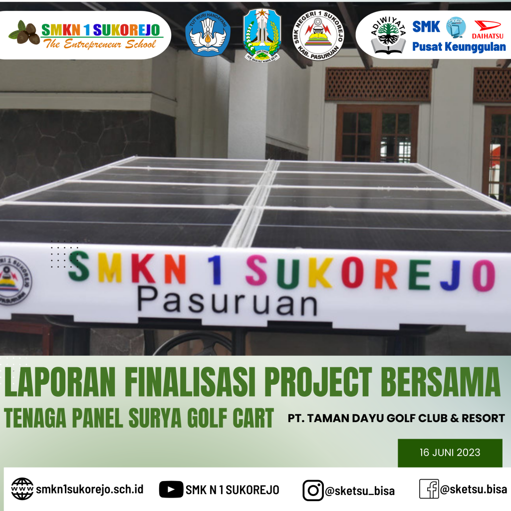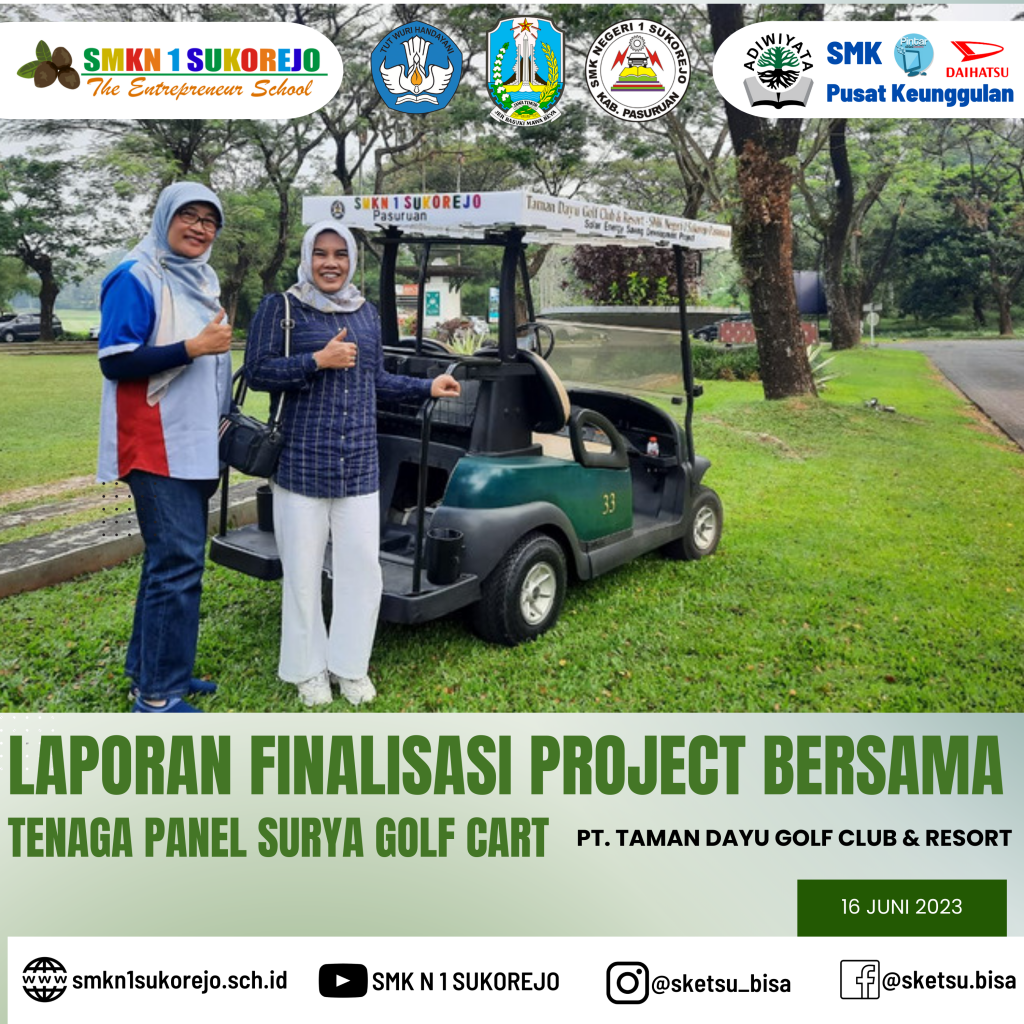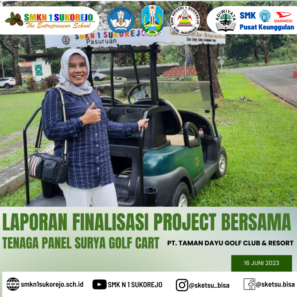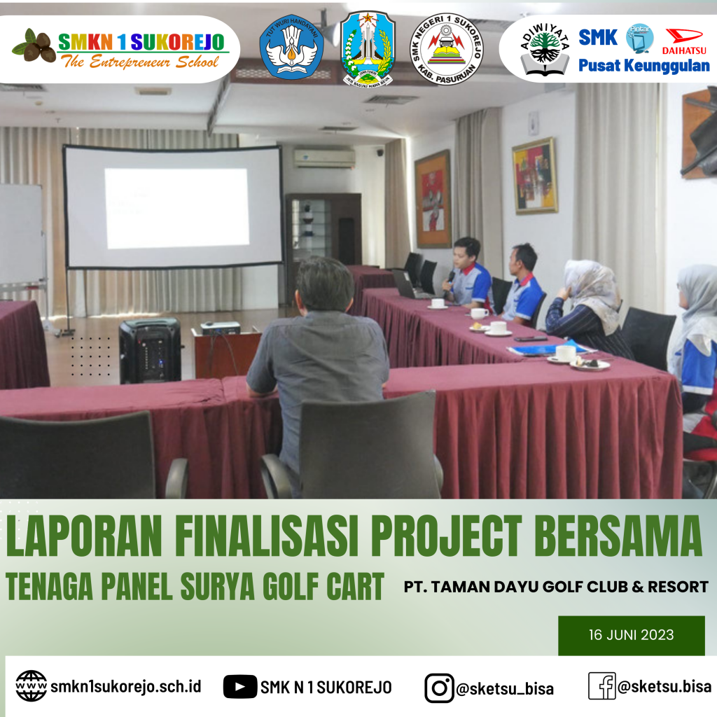 Jum’at, 16 Juni 2023 Kepala SMK Negeri 1 Sukorejo bersama Tim Project Bersama Golf Cart berkesempatan hadir di PT. Taman Dayu Golf Club & Resort dalam rangka pemaparan Laporan Akhir sekaligus evaluasi Project Saving Energy pada Golf Cart milik PT. Taman Dayu.