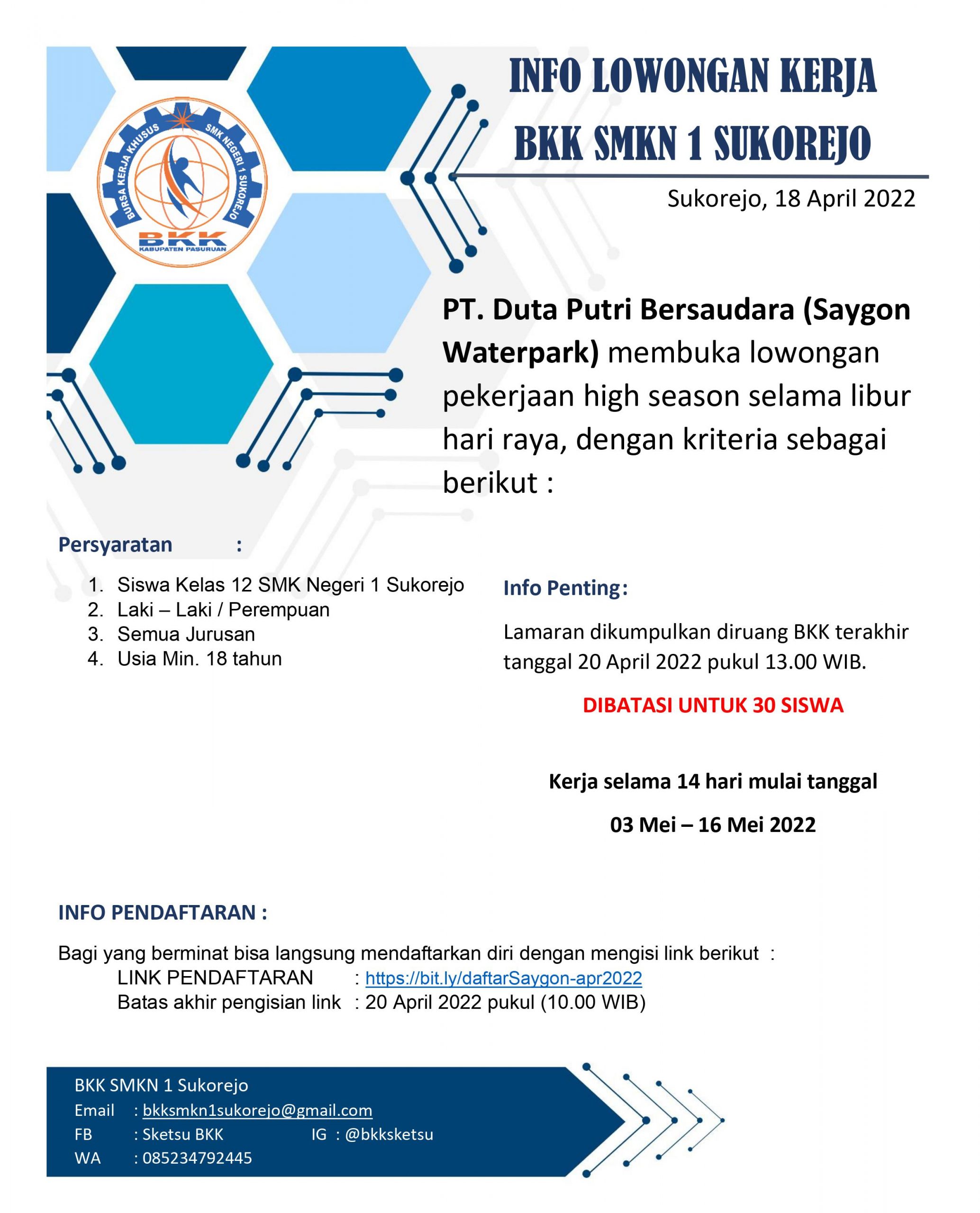 Kabar baik untuk siswa – siswi kelas 12 SMK Negeri 1 Sukorejo. PT. Duta Putri Bersaudara (Saygon Waterpark) membuka kesempatan bekerja selama libur hari raya.