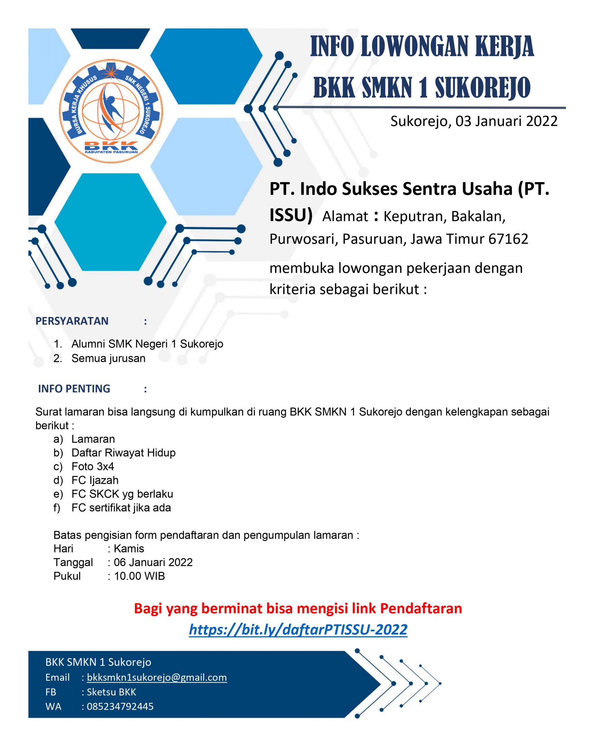 PT. Indo Sukses Sentra Usaha (PT. ISSU) Alamat : Keputran, Bakalan, Purwosari, Pasuruan, Jawa Timur 67162 . membuka lowongan pekerjaan dengan kriteria sebagai berikut :