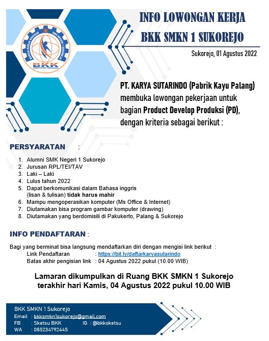 Bagi alumni yang memenuhi persyaratan dan  berminat menjadi bagian dari PT. Karya Sutarindo dapat mendaftarkan diri DISINI