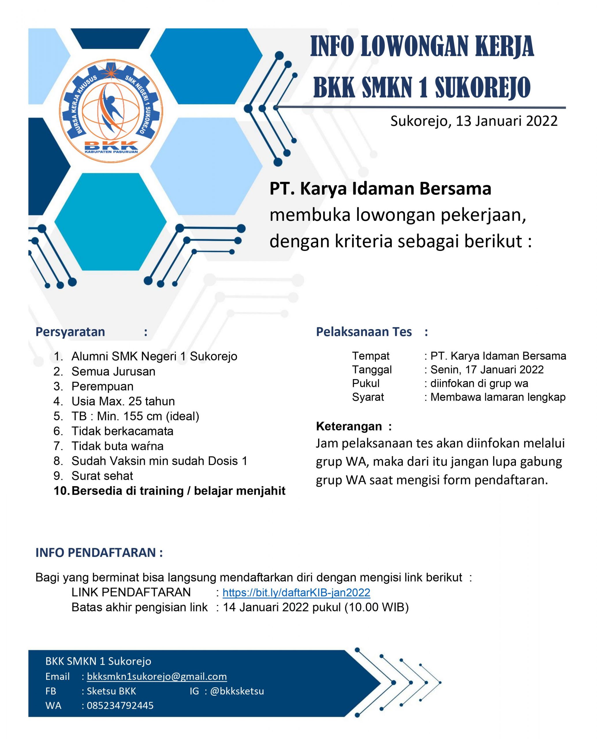PT. Karya Idaman Bersama membuka lowongan pekerjaan dibidang PKT (Pekerja Tangan), dengan kriteria sebagai berikut :