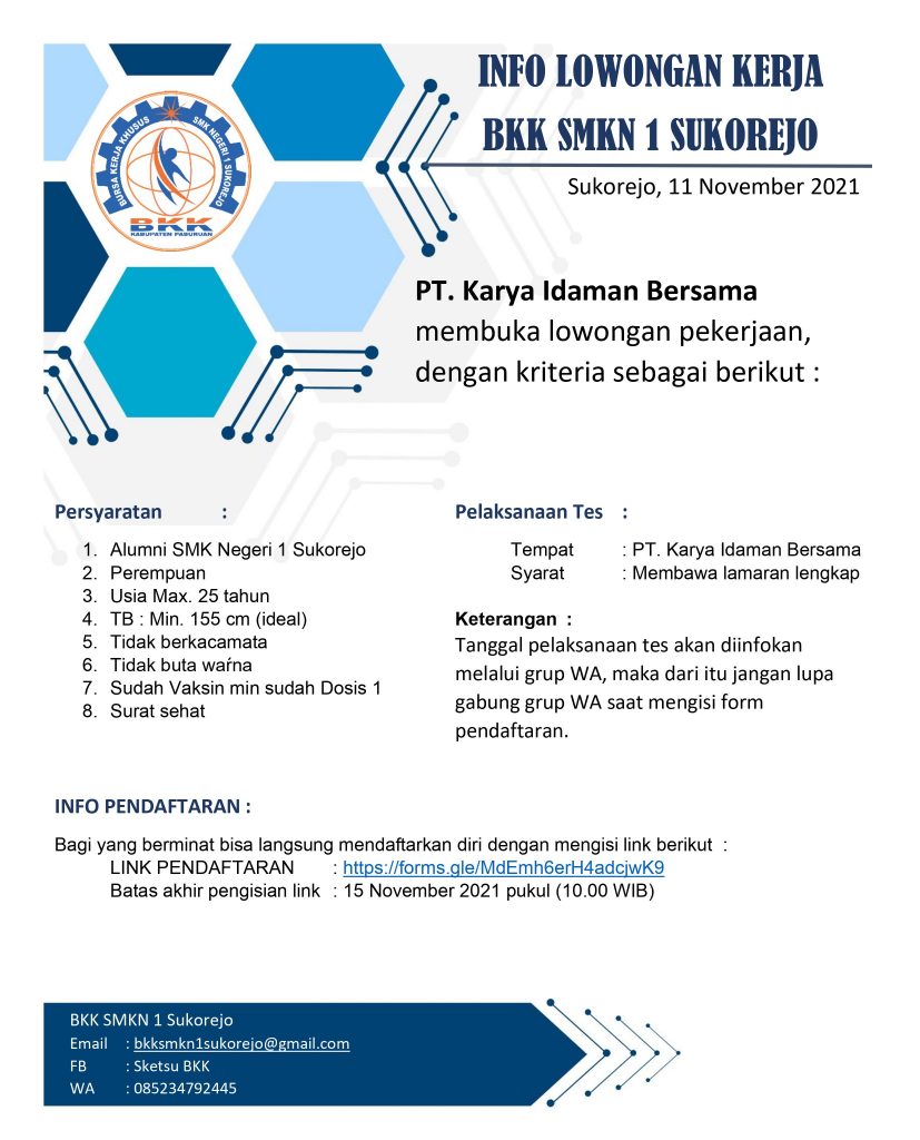 Lowongan Kerja PT. KIB Kegiatan BKK Lowongan Kerja 12 November 202112 November 2021 Admin BKKLeave a Comment on Lowongan Kerja PT. KIB Bagi yang berminat bisa langsung mendaftarkan diri dengan mengisi link disini. Batas akhir pengisian link : 15 November 2021 pukul (10.00 WIB)