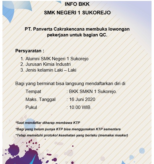 Lowongan Kerja PT. Panverta Cakrakencana bagian QC (Quality Control) Lowongan Kerja 10 Juni 20207 November 2021 adminLeave a Comment on Lowongan Kerja PT. Panverta Cakrakencana bagian QC (Quality Control)