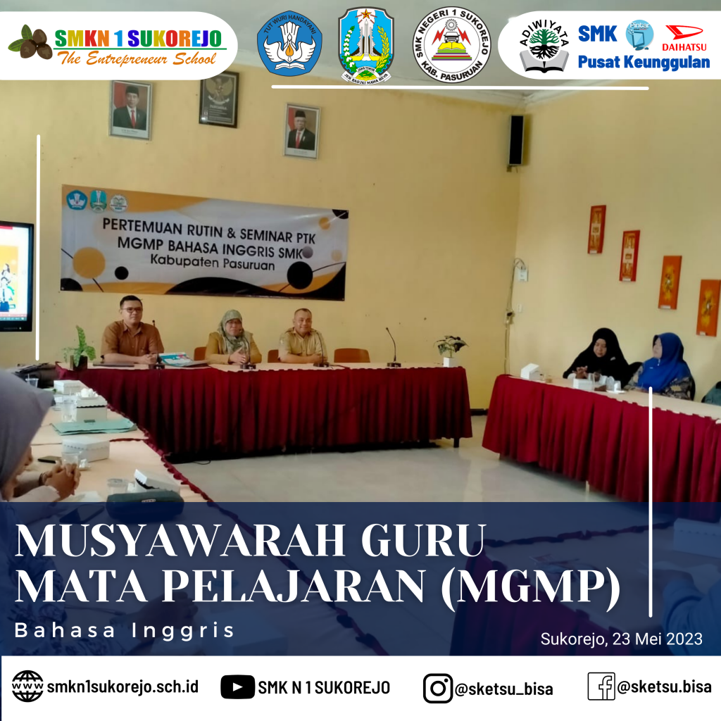 SMK Negeri 1 Sukorejo menjadi tuan rumah pelaksanaan Musyawarah Guru Mata Pelajaran (MGMP) Bahasa Inggris se Kabupaten Pasuruan.