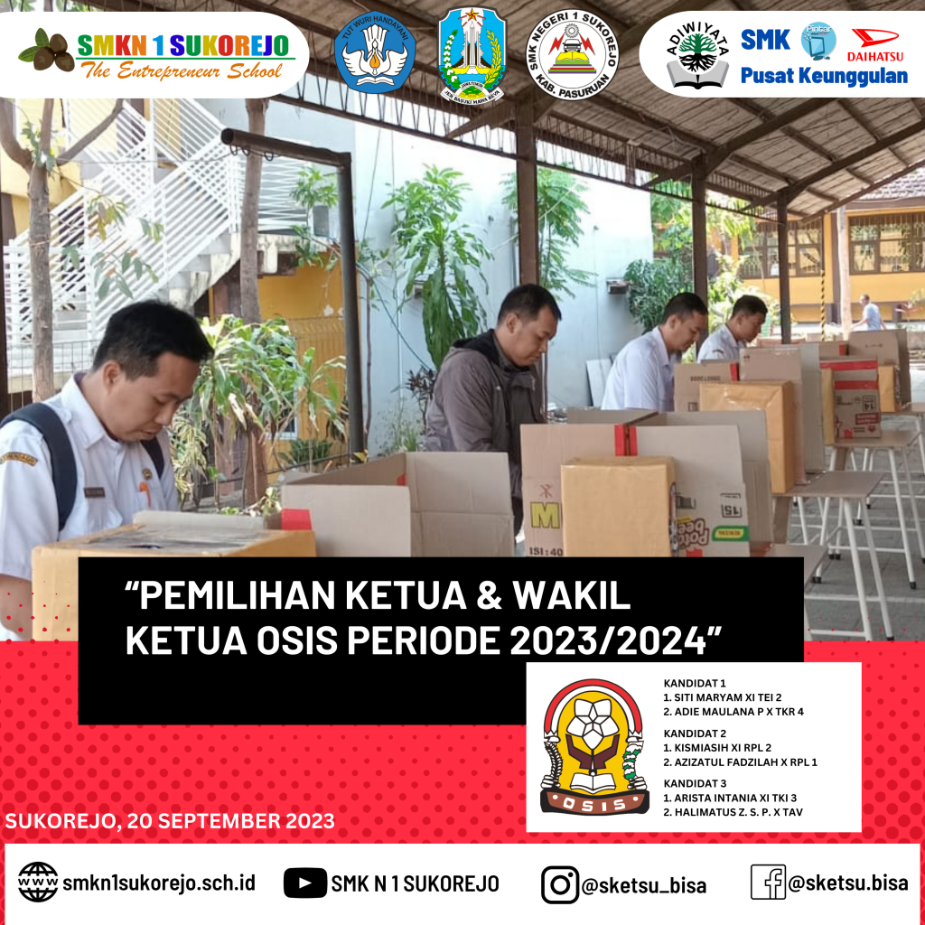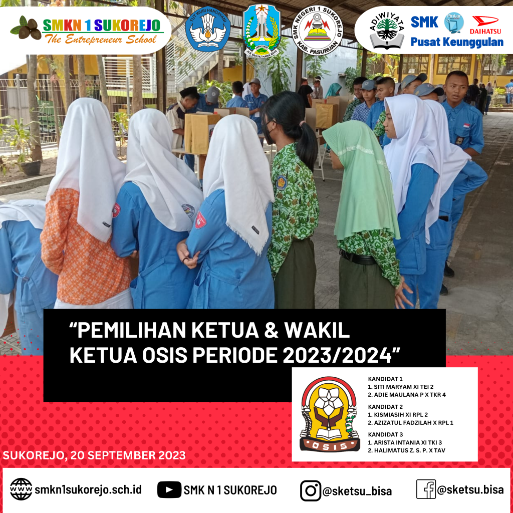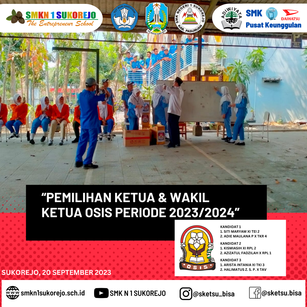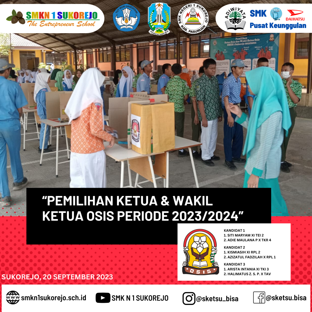 Sukorejo, 20 September 2023 – Memasuki pertengahan semester ganjil Tahun Pelajaran 2023/2024 SMK Negeri 1 Sukorejo melaksanakan pemilihan umum calon Ketua & Wakil Ketua OSIS periode 2023/2024. Pemilihan Ketua OSIS mampu mengembangkan nilai-nilai demokrasi yang dimiliki oleh siswa karena masing-masing siswa dapat menyalurkan suaranya dan ikut berpartisipasi secara langsung untuk memilih pemimpinnya.