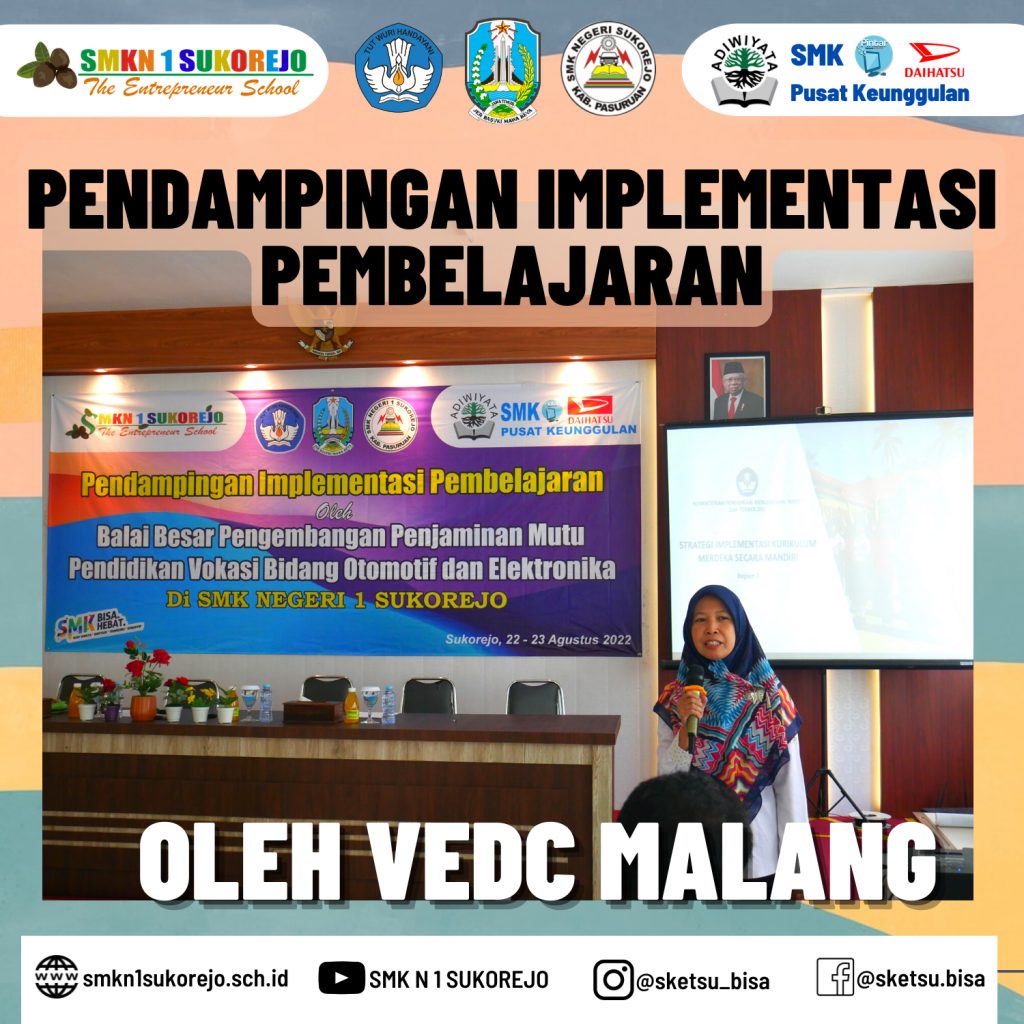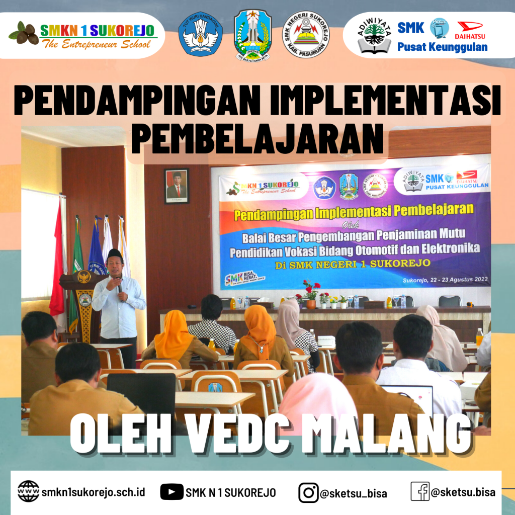 Sebagai Sekolah Pusat Keunggulan (SMK PK), SMK Negeri 1 Sukorejo terus mengadakan kegiatan guna peningkatan kualitas SDM. Dalam upaya peningkatatan SDM maka diselenggarakannya Workshop Pendampingan Implementasi Pembelajaran yang bekerjasama deng VEDC Malang.