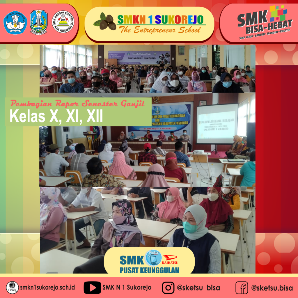 Pengambilan rapor di SMKN 1 Sukorejo dengan mendatangkan wali murid untuk kelas X dan XII. Sedangkan kelas XI mengambil rapornya sesuai dengan undangan Bapak Kepala SMKN 1 Sukorejo yaitu diambil sendiri oleh peserta didik tersebut. Selamat bagi peserta didik yang mendapatkan prestasi baik dikelasnya dan selamat berjuang kembali di Semester Genap (2021-2022)