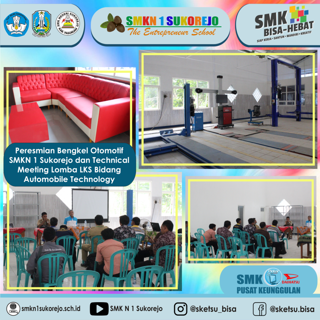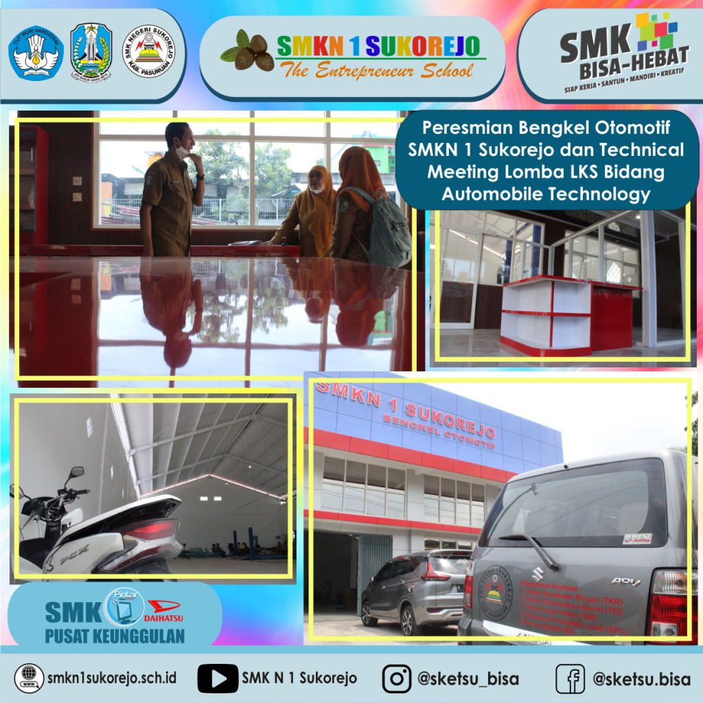 Senin (04/01/2022) Peresmian Bengkel Otomotif SMKN 1 Sukorejo dilakukan sebelum Technical Meeting Lomba LKS Bidang Automobile Technology. Peresmian Bengkel Otomotif ini disaksikan oleh Kasi SMK Cabdin Pasuruan, Ibu Mukaromah, dengan Bapak Kepala SMKN 1 Sukorejo, Bapak Rudi Trisantoso, S.Pd., M.Pd., dan Waka Kurikulum SMKN 1 Sukorejo, Ibu Titik Chomzah, S.Pd. Setelah itu, pelaksanaan Technical Meeting LKS bidang lomba Automobile Technology di Bengkel Otomotif SMKN 1 Sukorejo yang dihadiri langsung oleh peserta dan pendamping lomba dari beberapa sekolah. Peserta yang mengikuti bidang lomba ini sebanyak 10 peserta dari beberapa sekolah di Wilayah Pasuruan. Peserta yang berhak melaju ke tahap Wilker 2 Jatim adalah 5 terbaik di bidang lomba LKS Cabdin Wilayah Pasuruan.