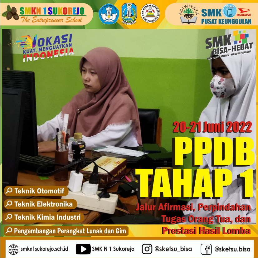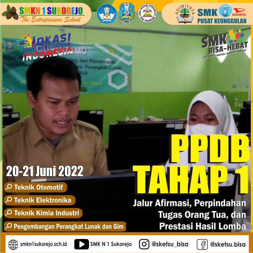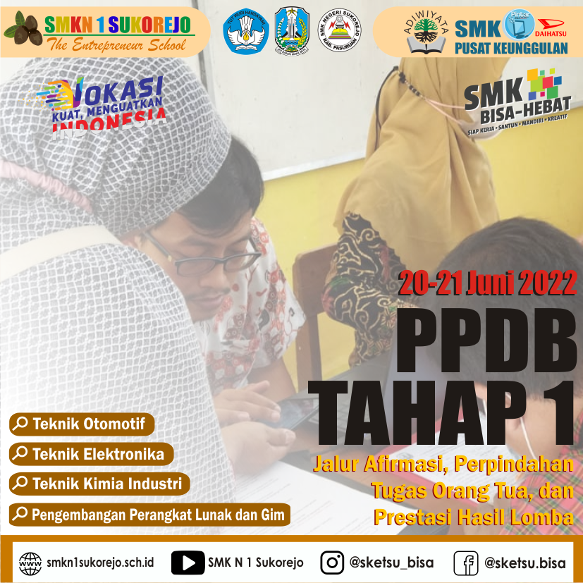 PPDB Tahap 1 (Jalur Afirmasi, Perpindahan Tugas Orang Tua, dan Prestasi Hasil Lomba) telah dibuka. Banyak calon peserta didik yang sudah mendaftar di SMKN 1 Sukorejo.
