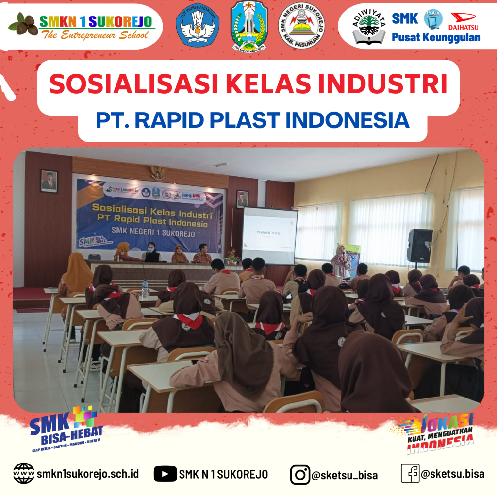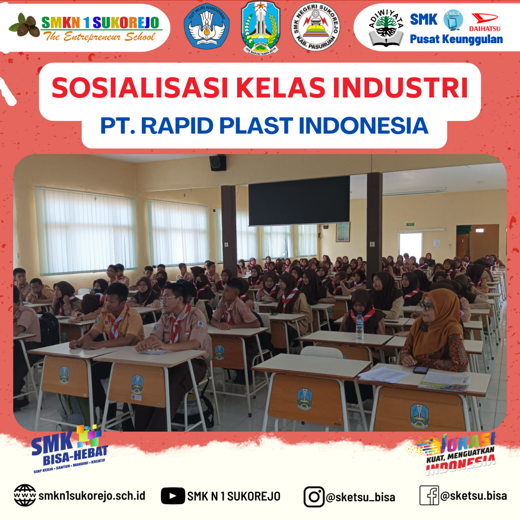 Sukorejo, 15 September 2023 PT. Rapid Plast Indonesia berkesempatan hadir ke SMK Negeri 1 Sukorejo dalam rangka Sosialisasi Kelas Industri. Kelas Industri merupakan program pengadaan kelas khusus dalam lingkungan sekolah. Kelas ini dikelola bersama sama antara sekolah dengan industri. Melalui kelas industri diharapkan kompetensi yang dimiliki peserta didik setelah lulus memang sudah sesuai dengan kriteria yang dibutuhkan di dunia kerja.