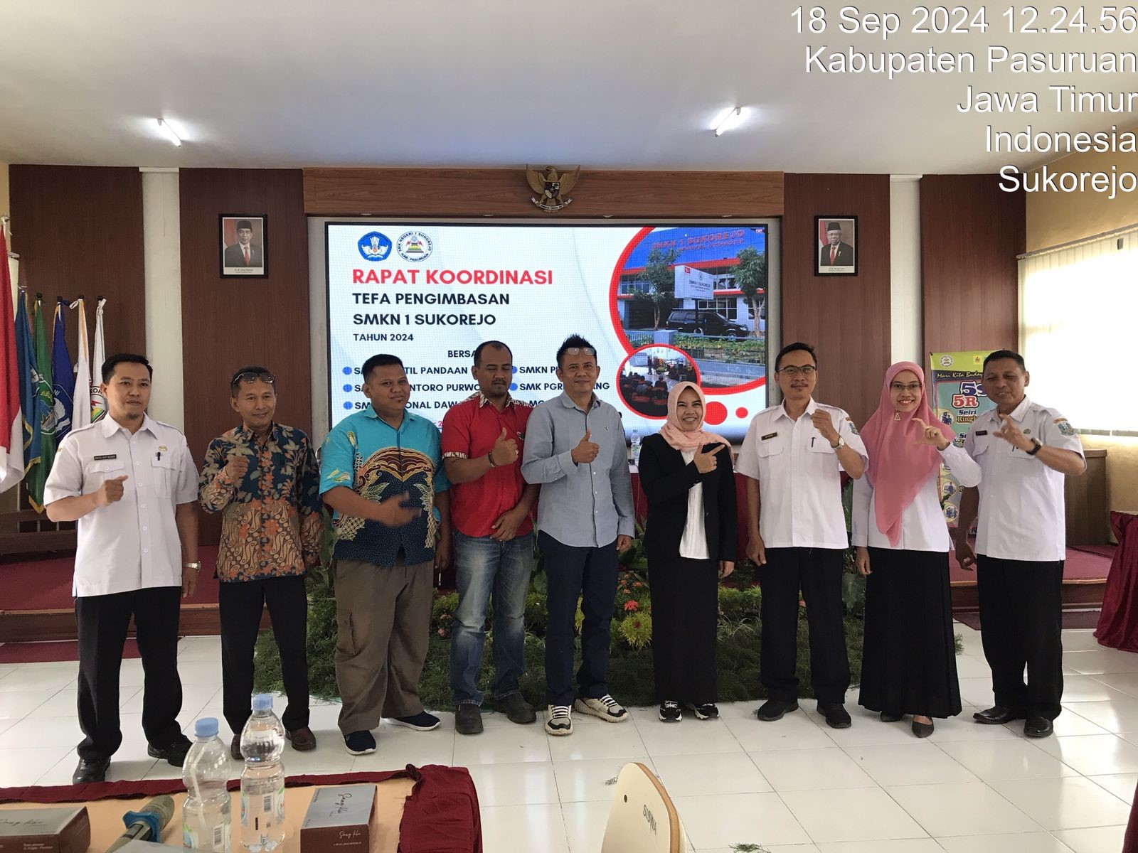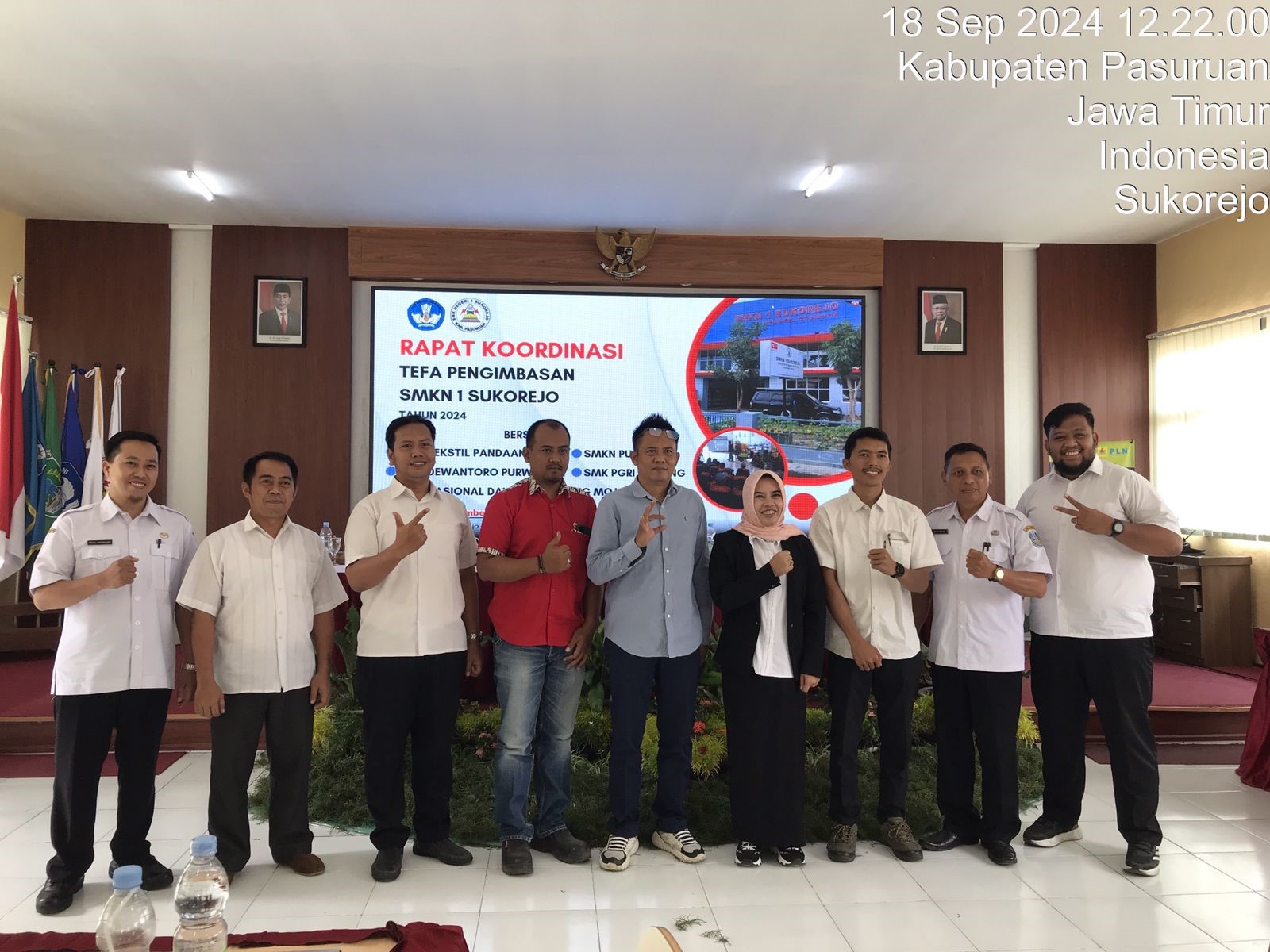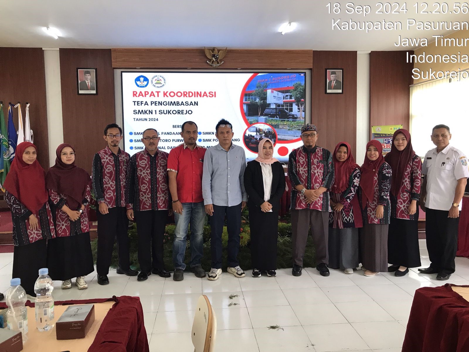 Pada hari Rabu, 18 September 2024, SMKN 1 Sukorejo mengadakan kegiatan Rapat Koordinasi 1 terkait Tefa Pengimbasan. Kegiatan tersebut bertempat di Aula SMKN 1 Sukorejo dan dihadiri oleh seluruh manajemen sekolah, mulai dari Kepala Sekolah Dr. Nisful Laily, S.Pd., M.Pd., Wakil Kepala Sekolah, Ketua Kompetensi Keahlian, hingga guru-guru produktif dari berbagai kompetensi. Selain itu, Ketua dan pengurus Komite SMKN 1 Sukorejo juga turut hadir.