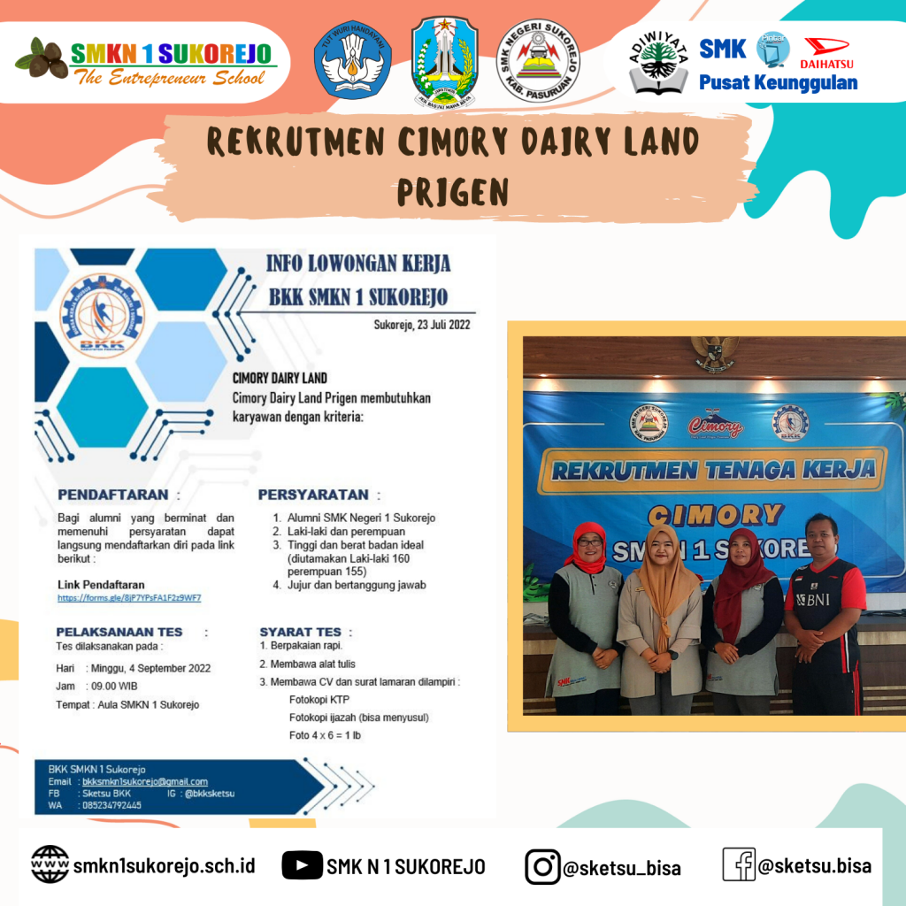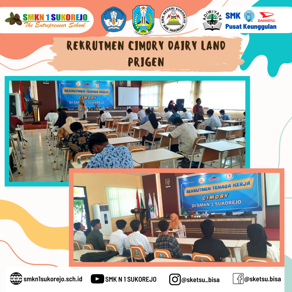 Minggu, 04 September 2022. Cimory Dairy Land menyelenggarakan tes tulis dan interview calon tenaga kerja yang diikuti oleh alumni SMK Negeri 1 Sukorejo. Proses seleksi dilaksanakan di hari minggu karena mendesaknya kebutuhan tenaga kerja di Cimory Dairy Land. Meski dilaksanakan di hari libur, kegiatan rekrutmen ini tidak menyurutkan semangat tim BKK, tim rekrut, serta alumni untuk mengikuti rangkaian seleksi ini dari awal hingga akhir.