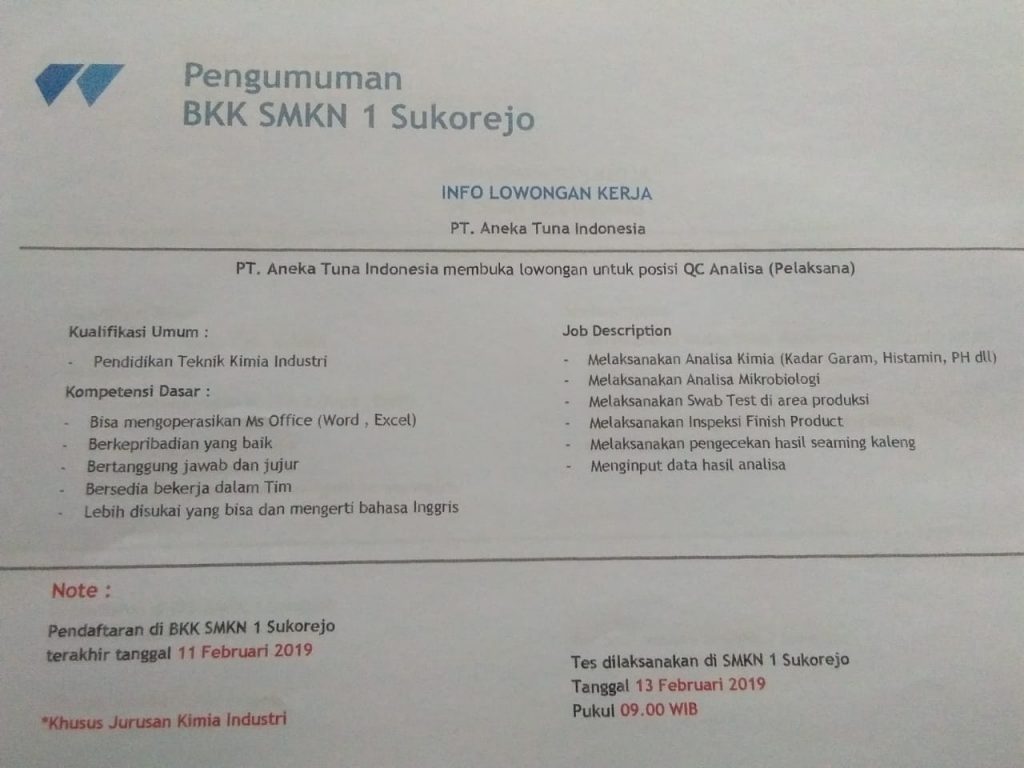 Diumumkan kepada alumni SMKN 1 Sukorejo khususnya dari jurusan Teknik Kimia Industri (TKI) untuk bisa mengikuti rekrutmen karyawan yang diselenggarakan oleh Bursa Kerja Khusus (BKK) bekerjasama dengan PT. Aneka Tuna Indonesia (ATI). Informasi selengkapnya sebagai berikut :