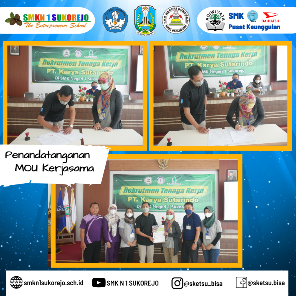 Selain proses rekrutment, SMK Negeri 1 Sukorejo dan PT. Karya Sutarindo juga melakukan perjanjian kerjasama untuk pertama kalinya. Penandatanganan MOU dilakukan sebelum proses rekrutment berlangsung dan disaksikan oleh pihak SMK Negeri 1 Sukorejo, Pihak PT. Karya Sutarindo serta alumni yang akan mengikuti tes tulis dan interview.
