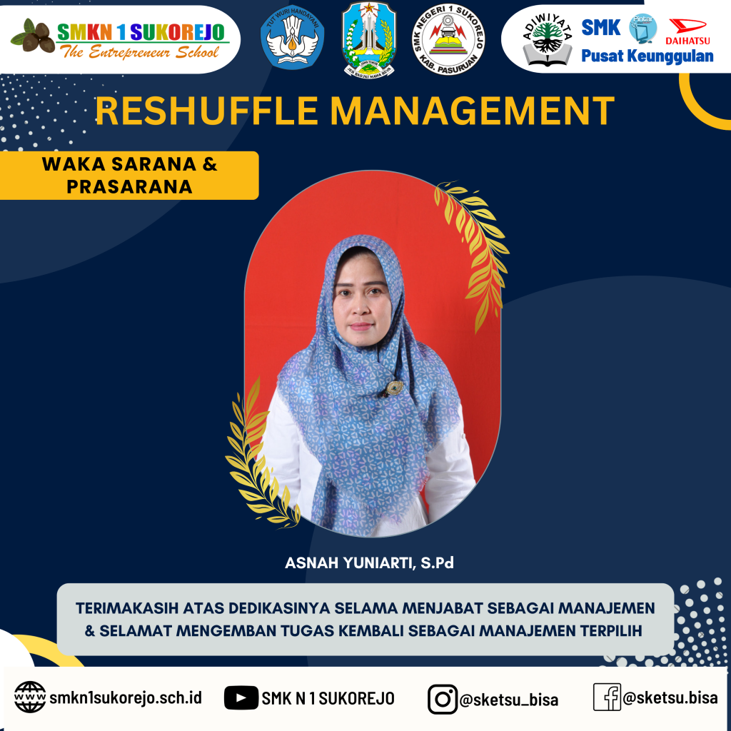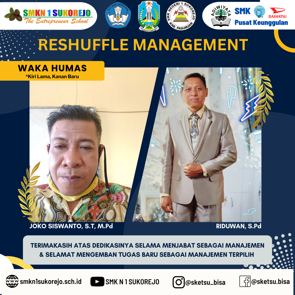 Selamat bertugas dan mengemban amanah bagi Manajemen baru yang telah terpilih, semoga kedepannya SMK Negeri 1 Sukorejo menjadi lebih berprestasi dan unggul.