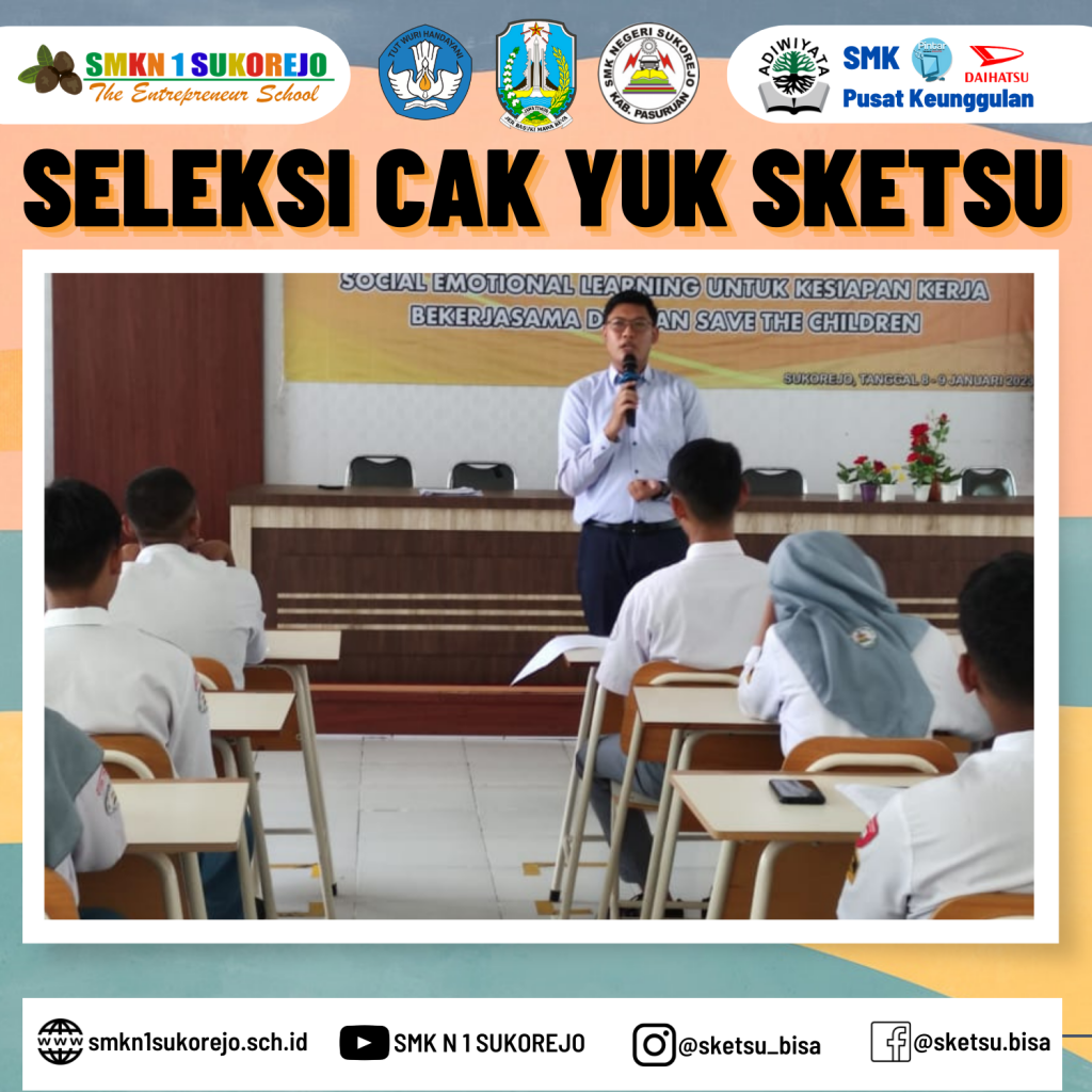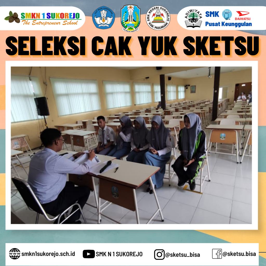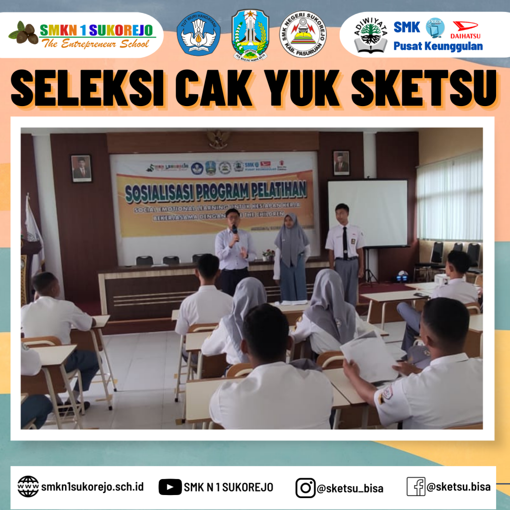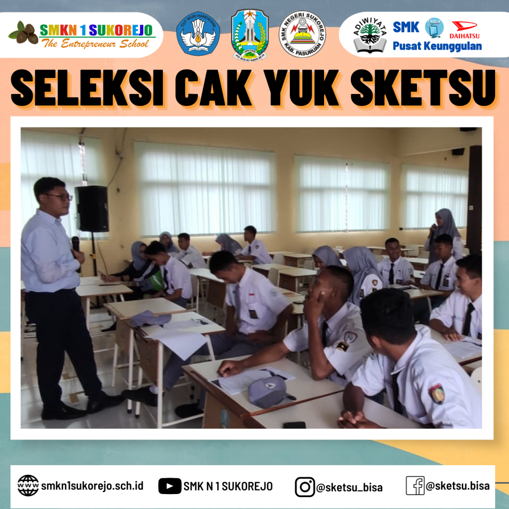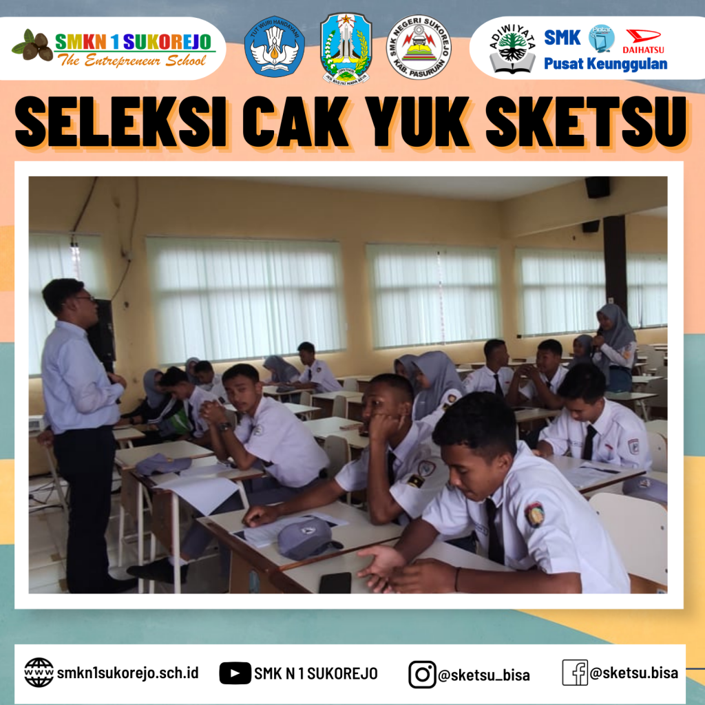 Sukorejo, 16 Januari 2023 masing masing perwakilan kelas dikumpulkan di ruang Aula SMK Negeri 1 Sukorejo untuk mengikuti sosialisasi sekaligus seleksi awal pemilihan Cak Yuk Sketsu.