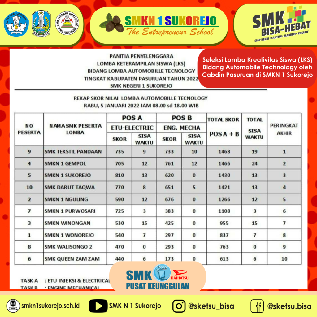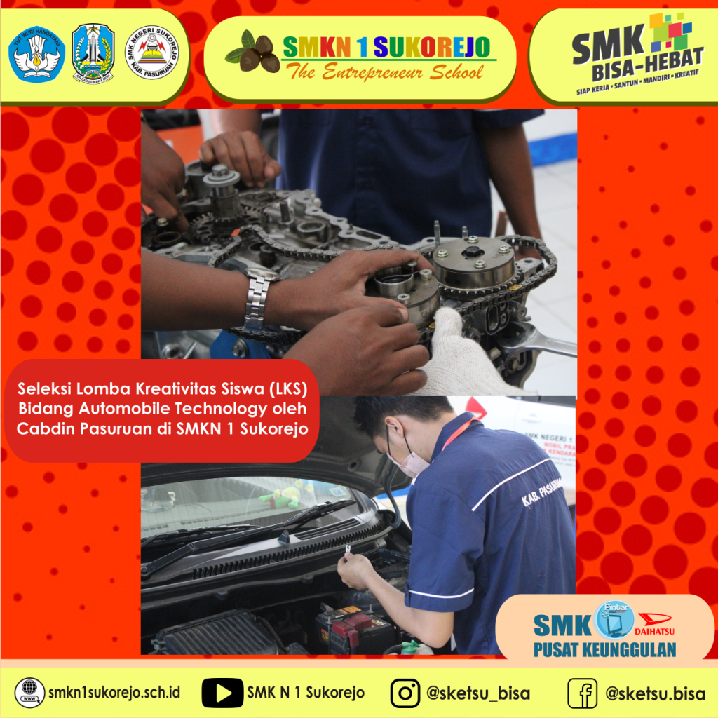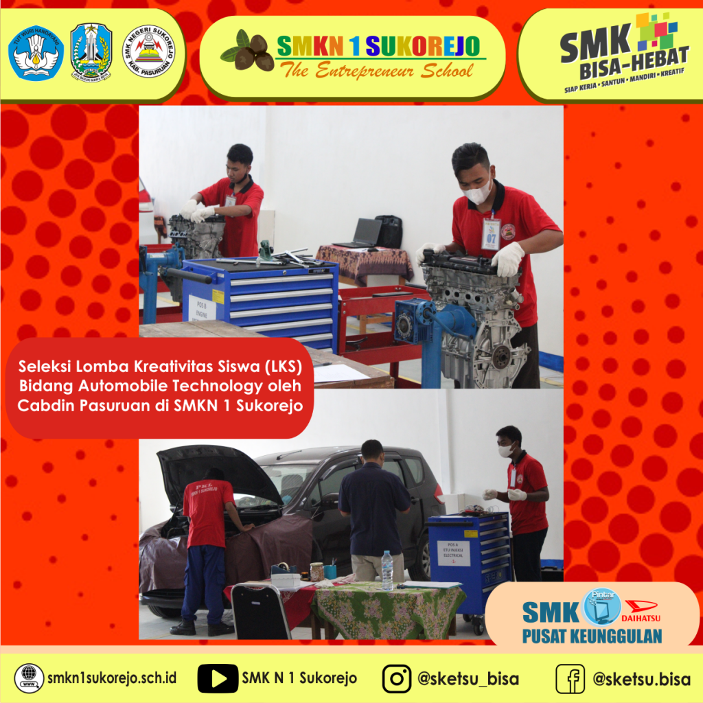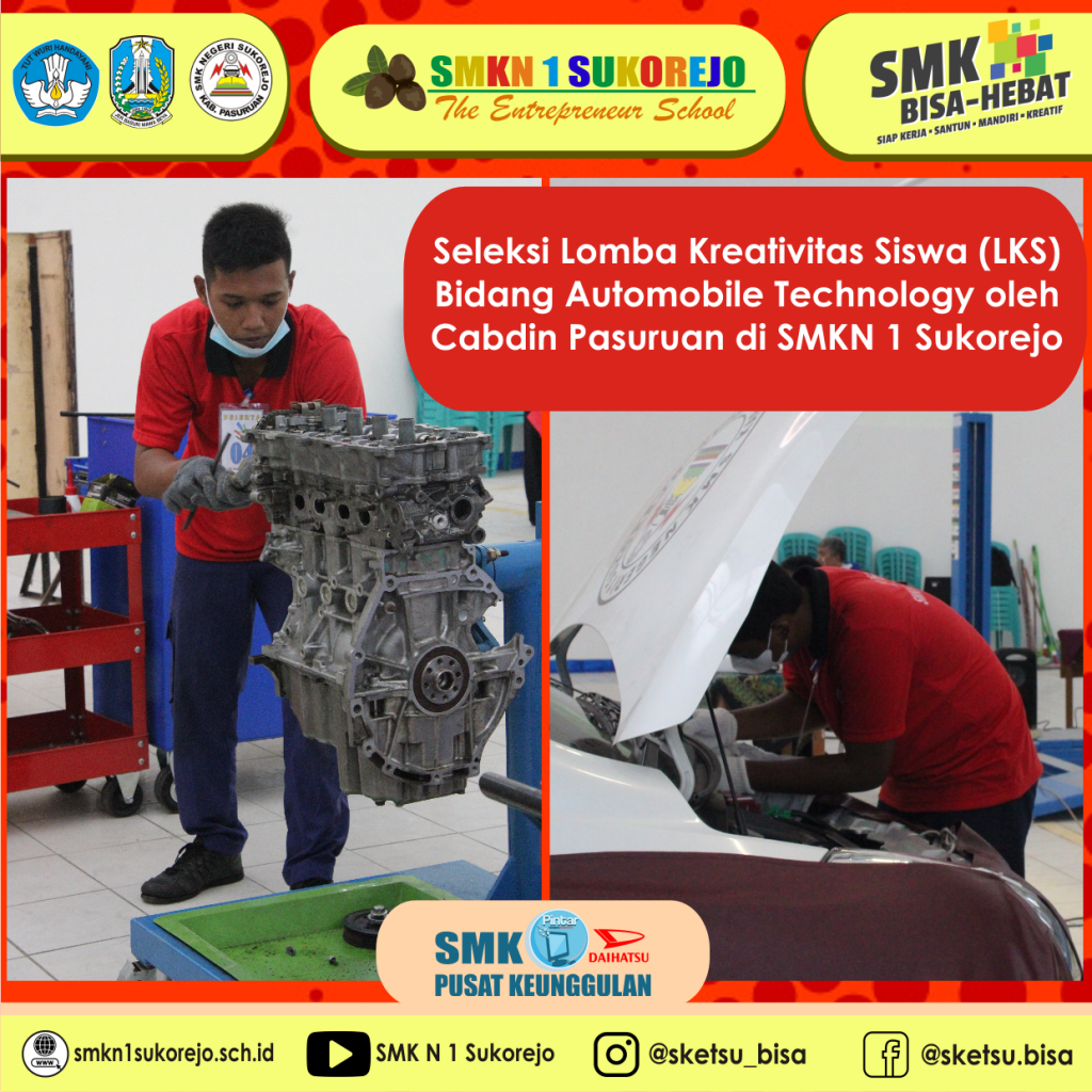 Selasa (05/01/2022), SMKN 1 Sukorejo ditunjuk oleh Cabang Dinas Wilayah Pasuruan sebagai TUK LKS bidang Automobile Technology. Peserta yang mengikuti lomba LKS bidang Automobile Technology sebanyak 10 peserta dari beberapa sekolah di Wilayah Pasuruan. Penilaian lomba LKS bidang Automobile Technology didasarkan pada 2 Tahap, antara lain ETU Injeksi & Electrical (Task A) dan Engine Mechanical (Tak B). Berdasarkan Juknis Lomba LKS Cabdin Pasuruan dan MGMP TKR Wilayah Pasuruan, peserta yang lolos adalah 5 terbaik dan berhak melanjutkan ke tahap Wilker 2 Jatim. Lima (5) peserta terbaik tersebut antara lain: SMKN Tekstil Pandaan (1468), SMKN 1 Gempol (1466), SMKN 1 Sukorejo (1430), SMKN Darut Taqwa (1421), SMKN 1 Nguling (1266) dan mereka berhak melanjutkan ke tahap Wilker 2 yang akan diadakan di Banyuwangi.
