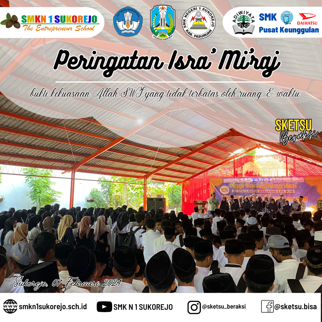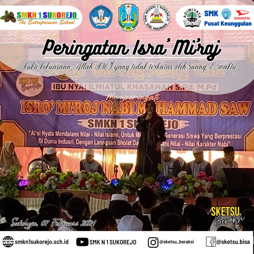 Tepat pada 27 rajab ini, SMK Negeri 1 Sukorejo menyelenggarakan kegiatan meriah untuk memperingati peristiwa Isra Miraj. Ibu Nyai Ilmiatul Khasanah, S.Pd., M.Pd. berkesempatan hadir untuk memberikan kajian terkait Isra Miraj, ibu Nyai Ilmi tegas memperingatkan kita semua untuk melaksanakan sholat 5 waktu dan tepat waktu.