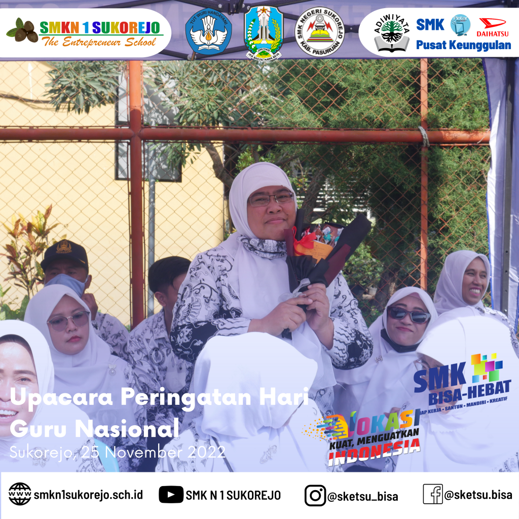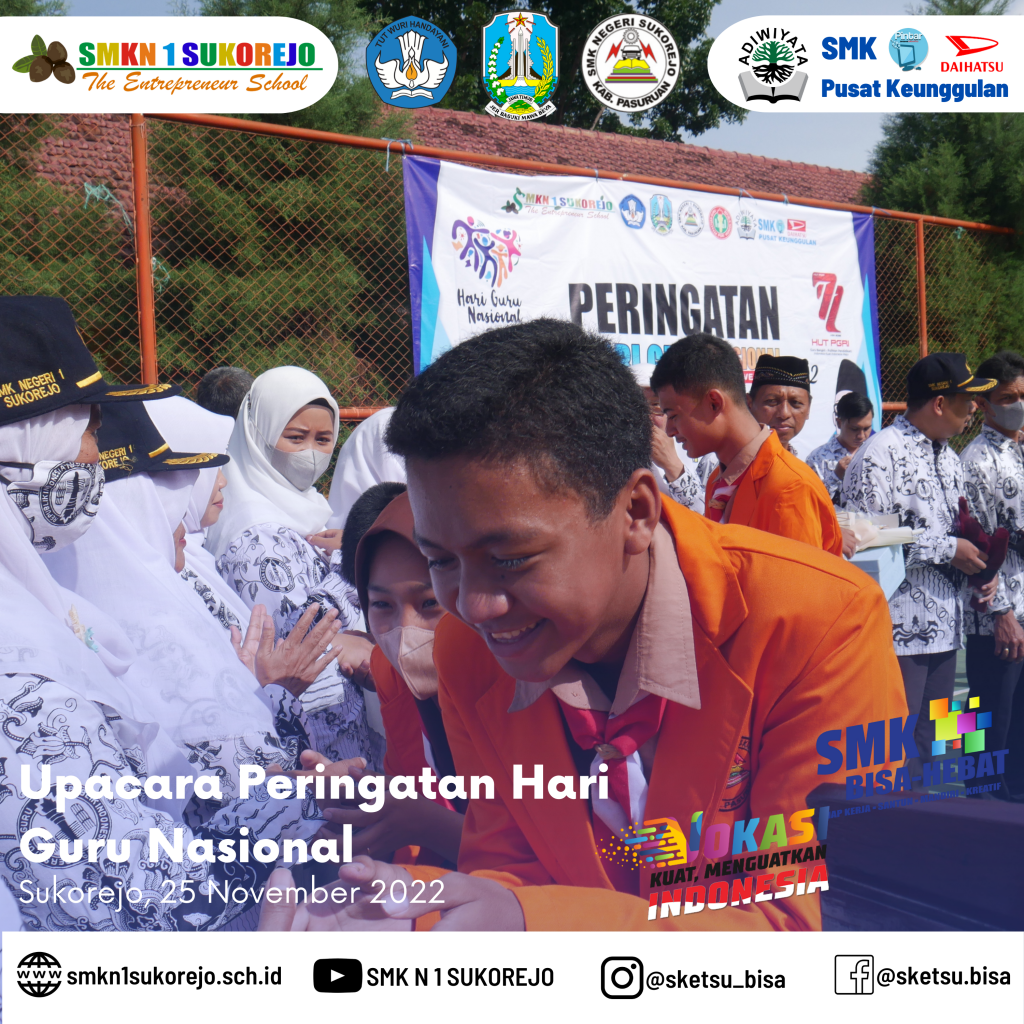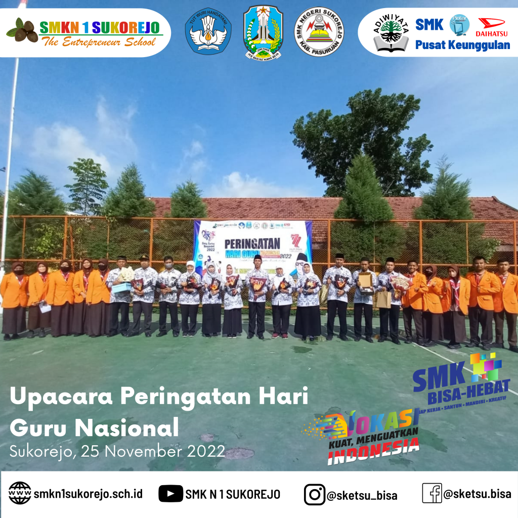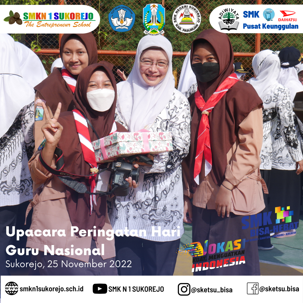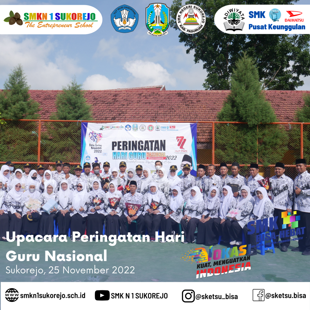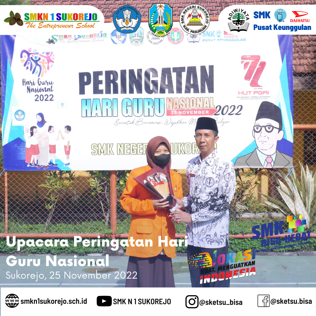 Tepat hari ini Jum’at, 25 November 2022 Indonesia memperingati Hari Guru Nasional dan HUT PGRI yang ke- 77 Tahun. Semarak perayaan hari guru di SMK Negeri 1 Sukorejo berlangsung sangat meriah namun tetap hikmat.
