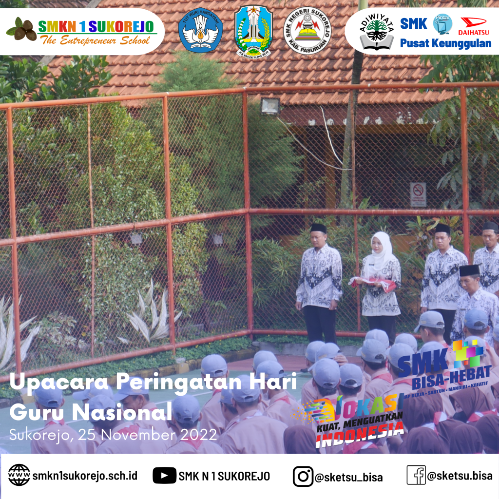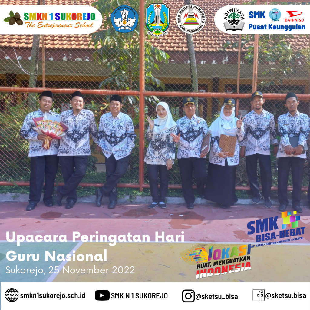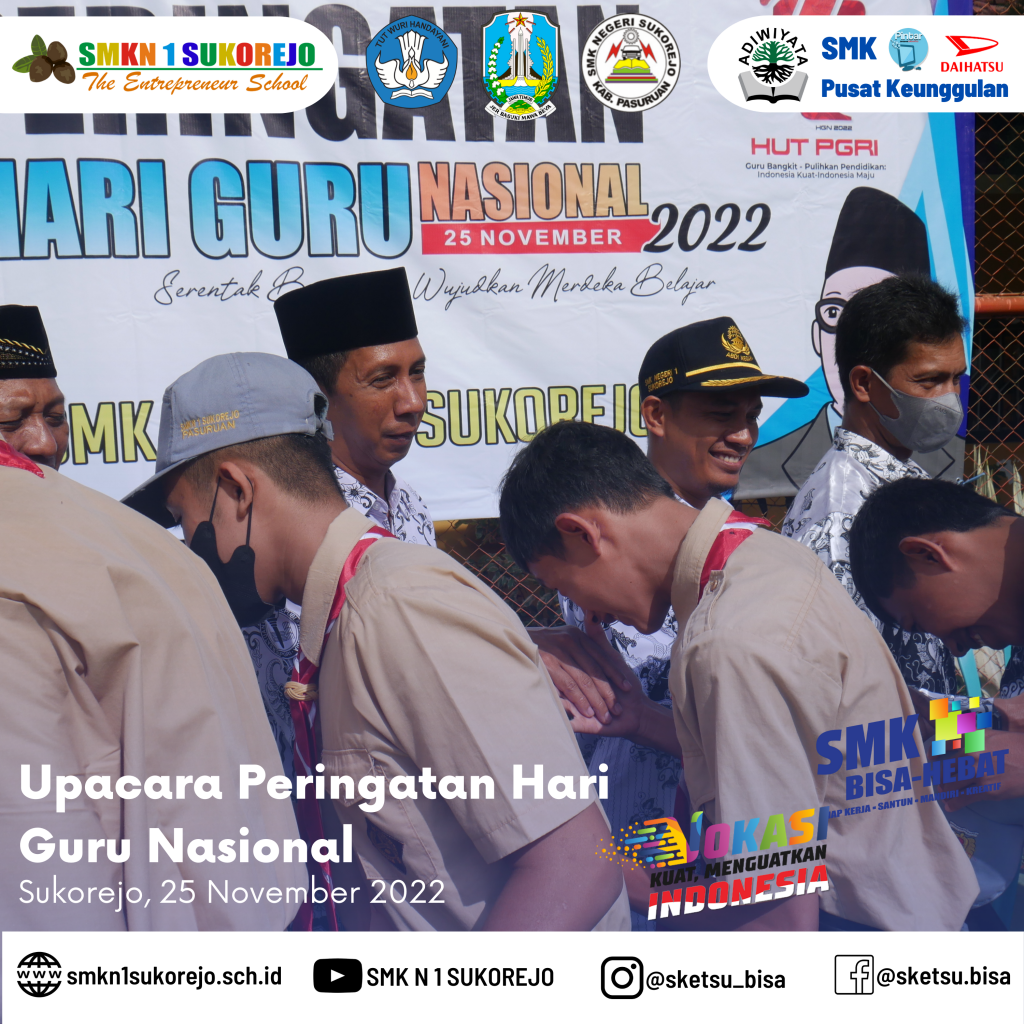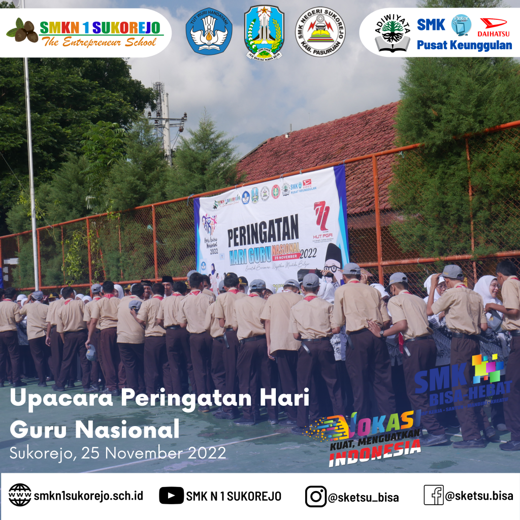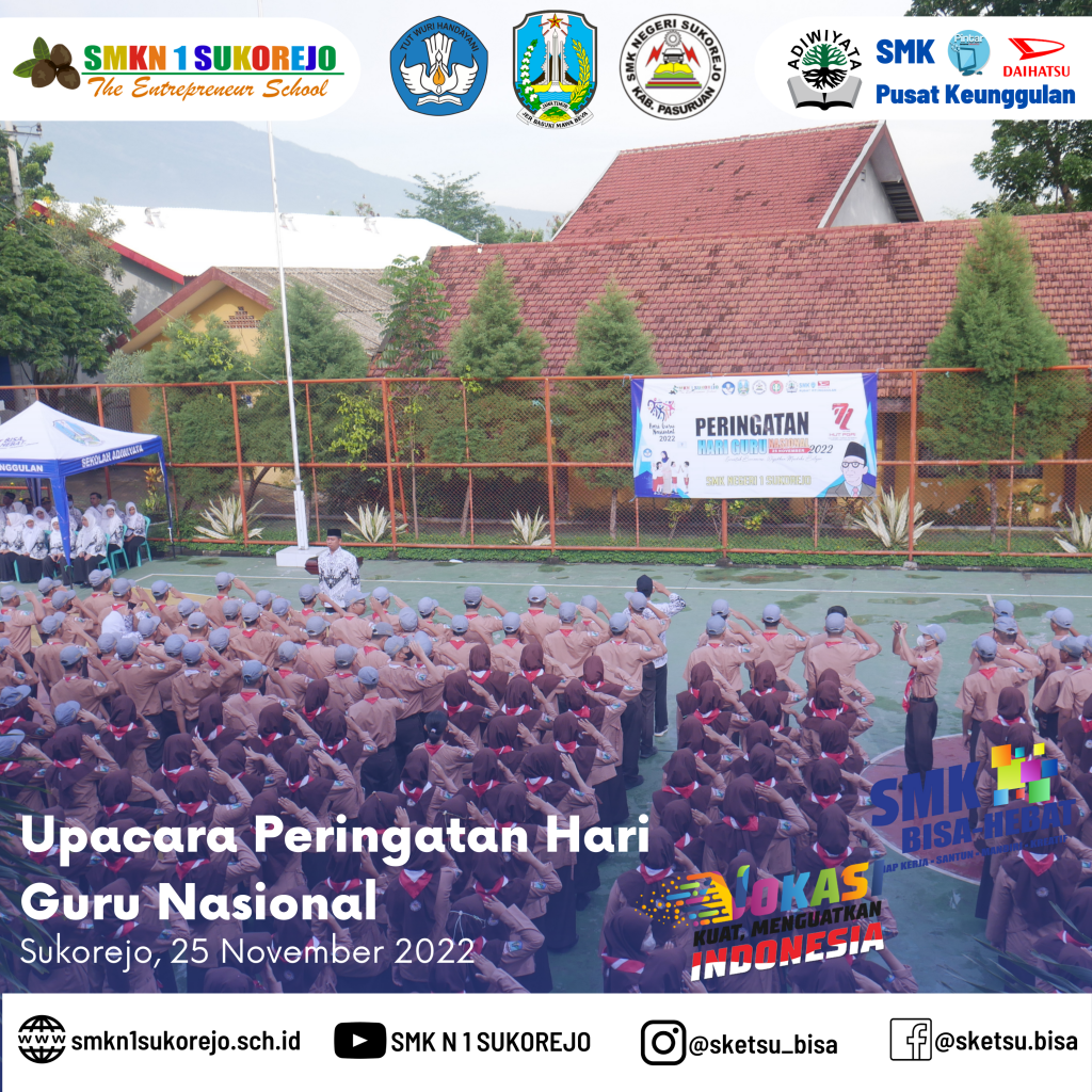 Tepat hari ini Jum’at, 25 November 2022 Indonesia memperingati Hari Guru Nasional dan HUT PGRI yang ke- 77 Tahun. Semarak perayaan hari guru di SMK Negeri 1 Sukorejo berlangsung sangat meriah namun tetap hikmat.