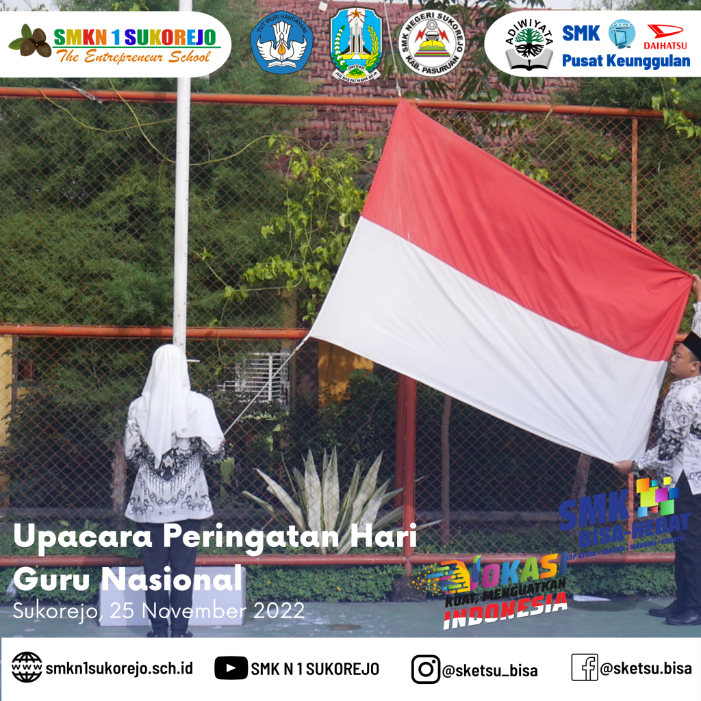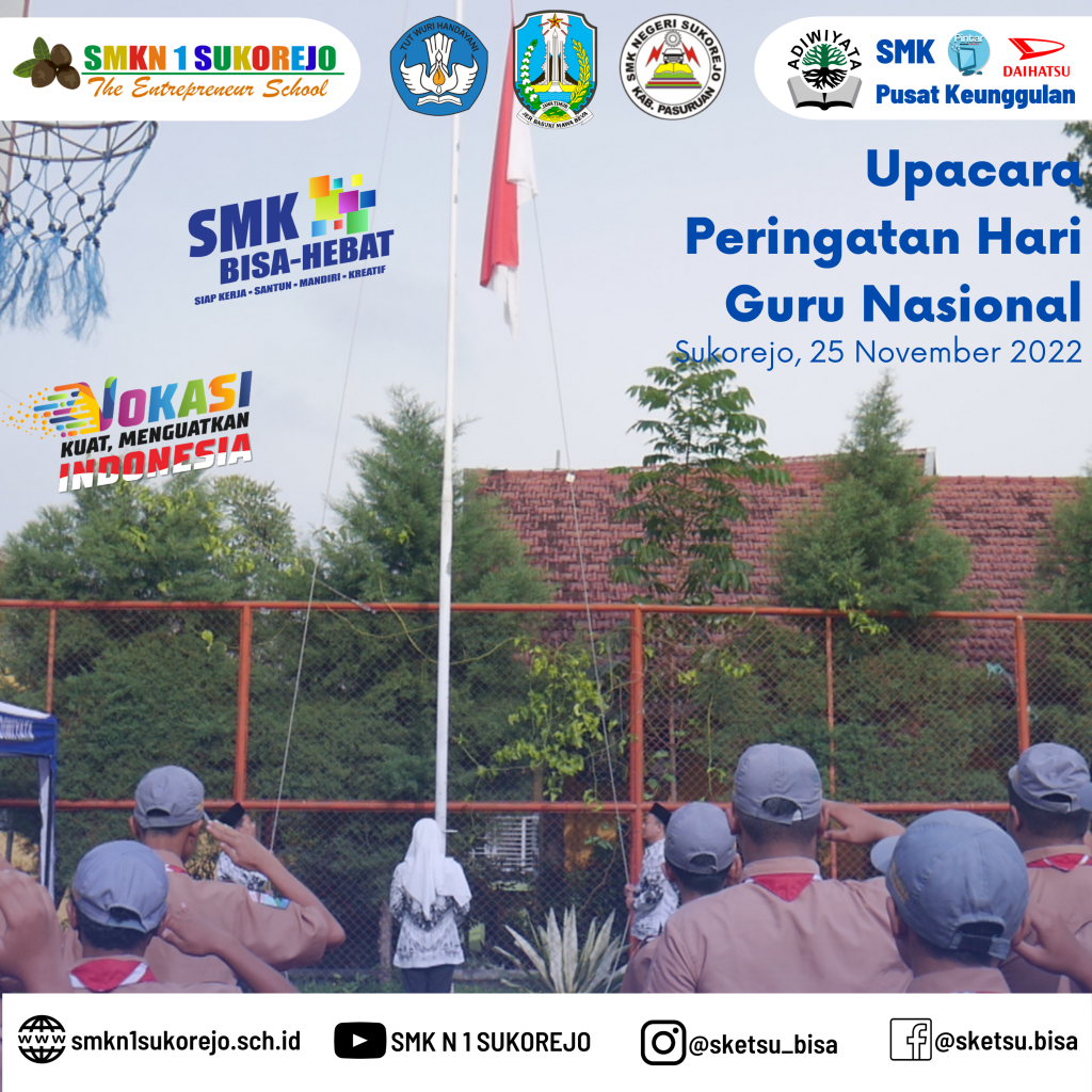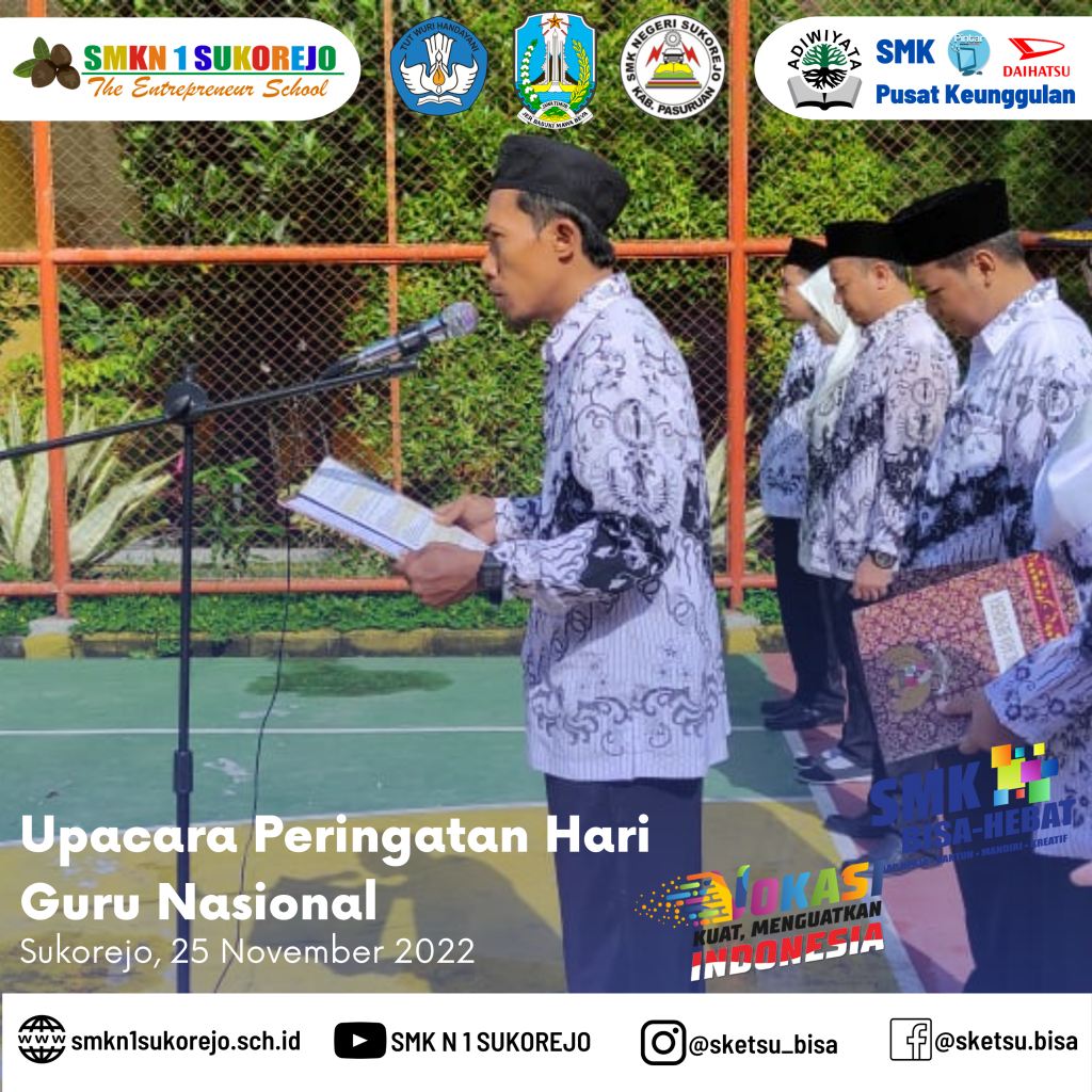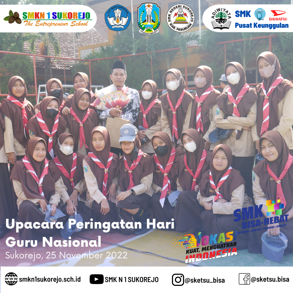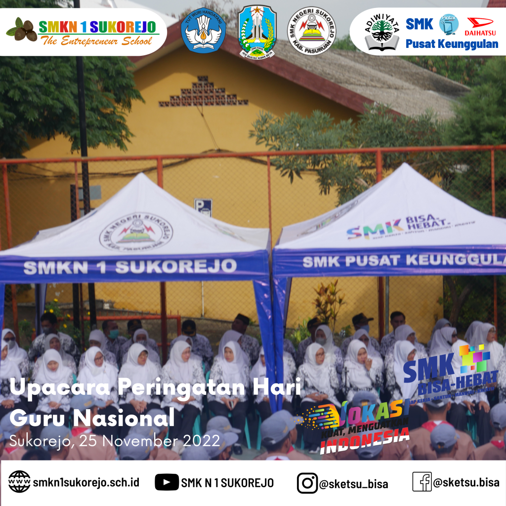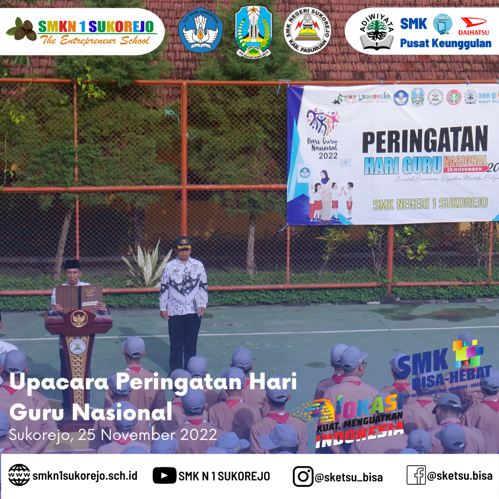 Tepat hari ini Jum’at, 25 November 2022 Indonesia memperingati Hari Guru Nasional dan HUT PGRI yang ke- 77 Tahun. Semarak perayaan hari guru di SMK Negeri 1 Sukorejo berlangsung sangat meriah namun tetap hikmat.
