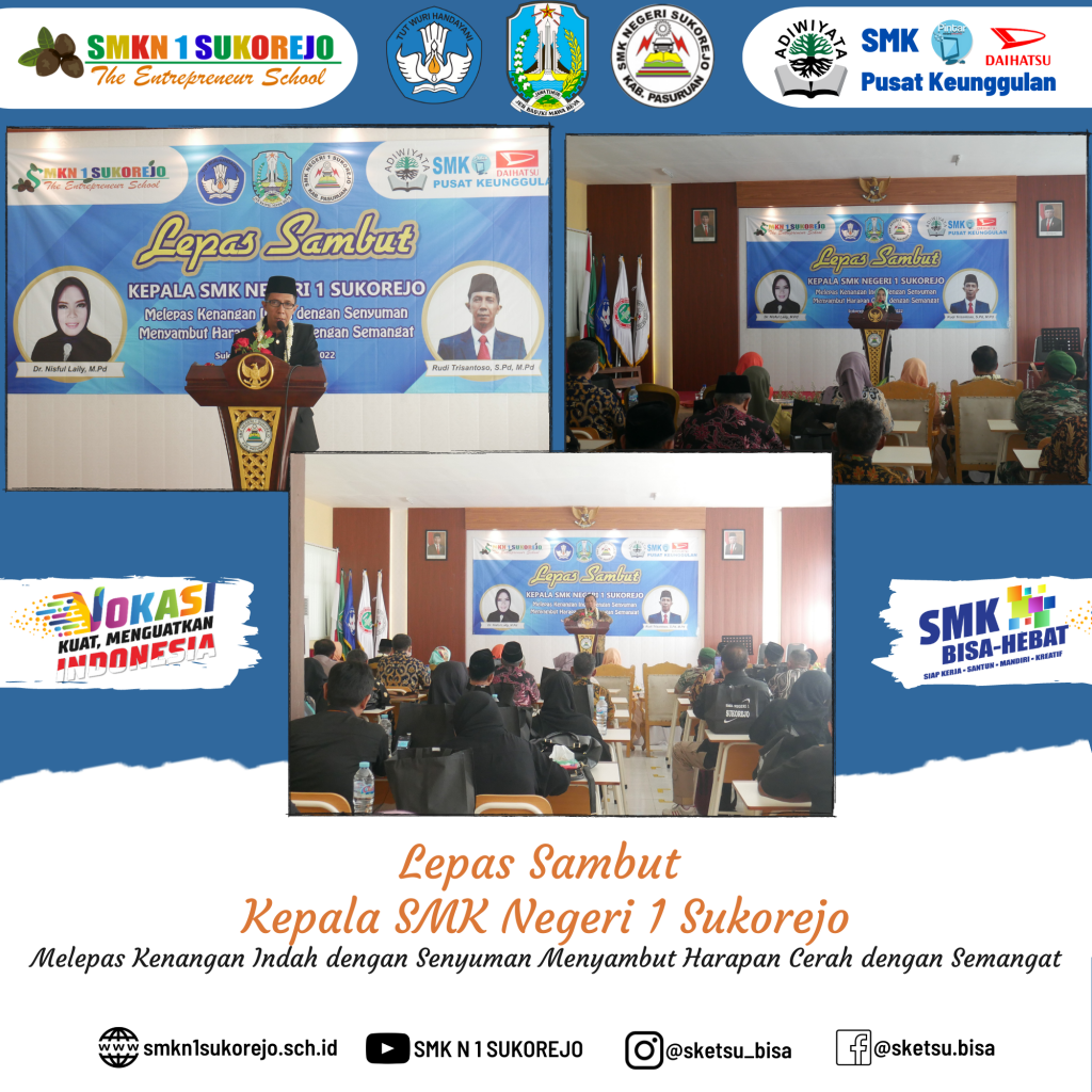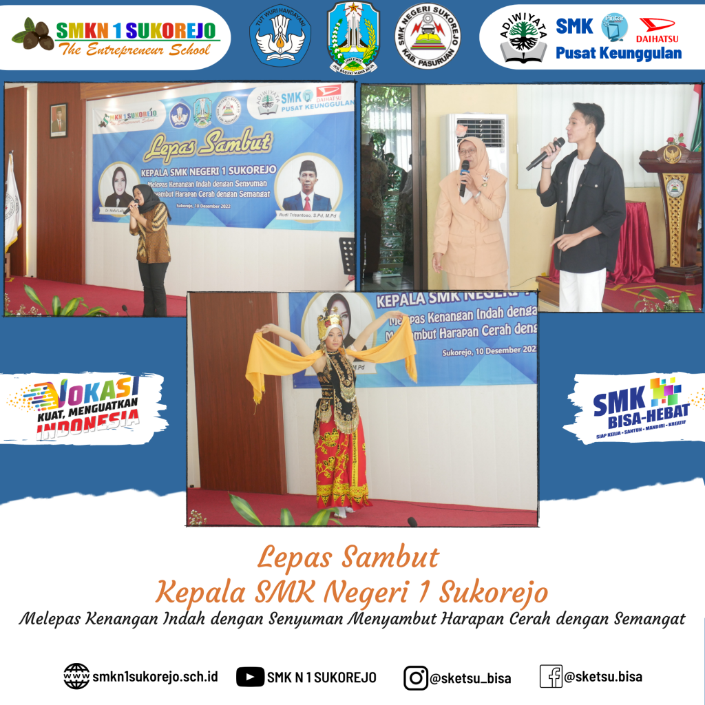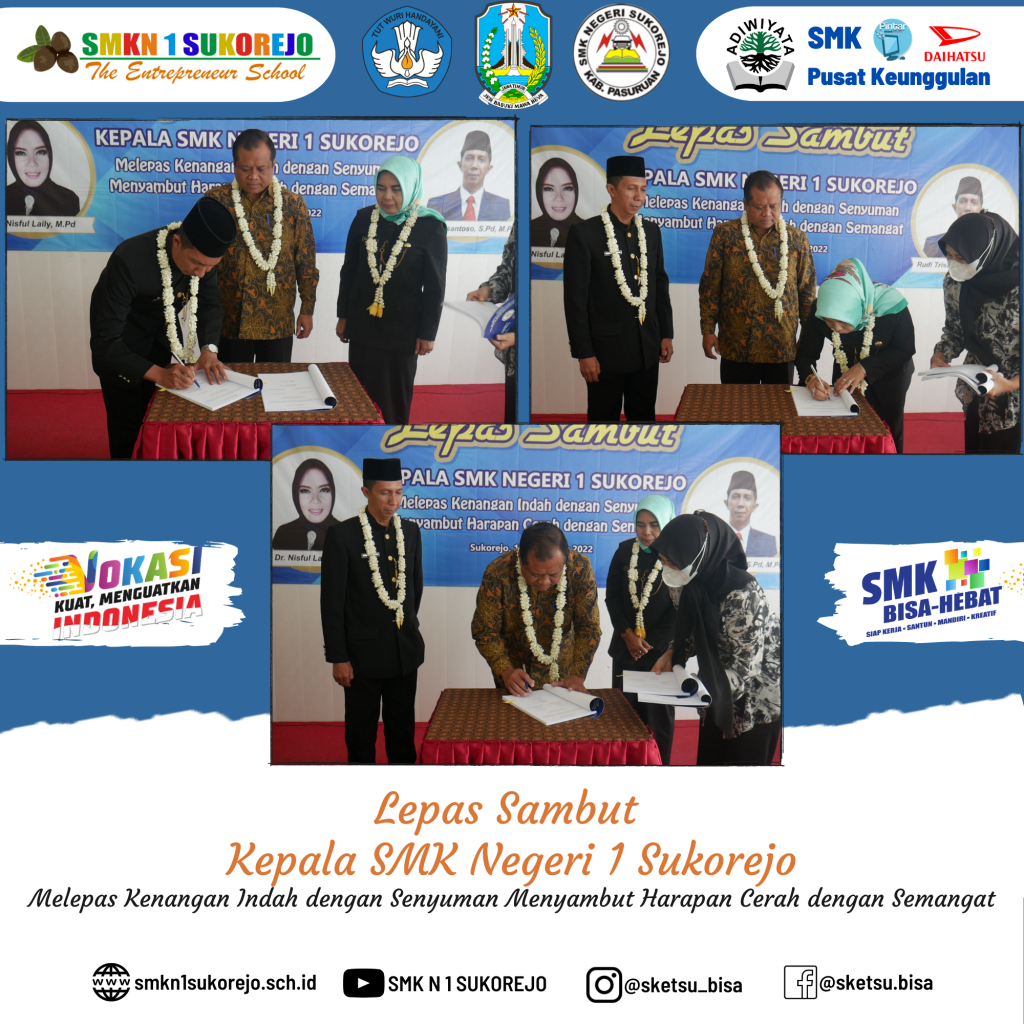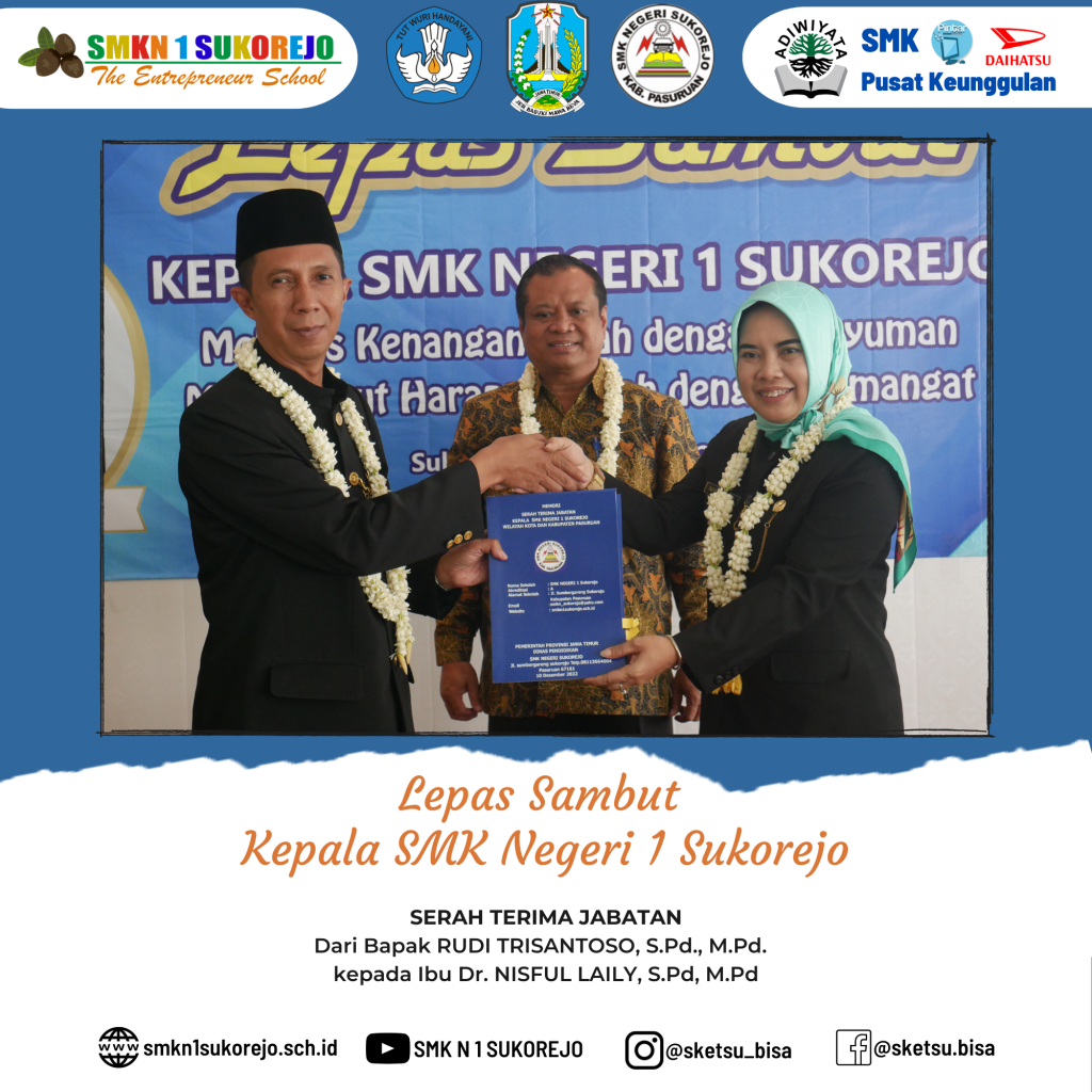 Sukorejo, 10 Desember 2022 telah dilaksanakan kegiatan Serah Terima Jabatan (Sertijab) dari Kepala SMK Negeri 1 Sukorejo yang lama (Bapak RUDI TRISANTOSO, S.Pd, M.Pd) kepada (Ibu Dr. NISFUL LAILY, S.Pd, M.Pd) selaku Kepala SMK Negeri 1 Sukorejo yang baru.