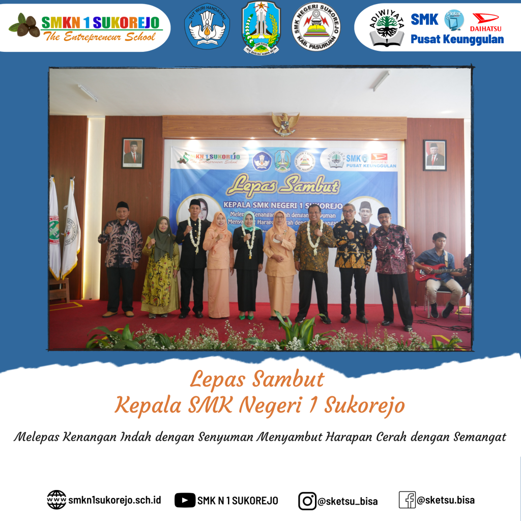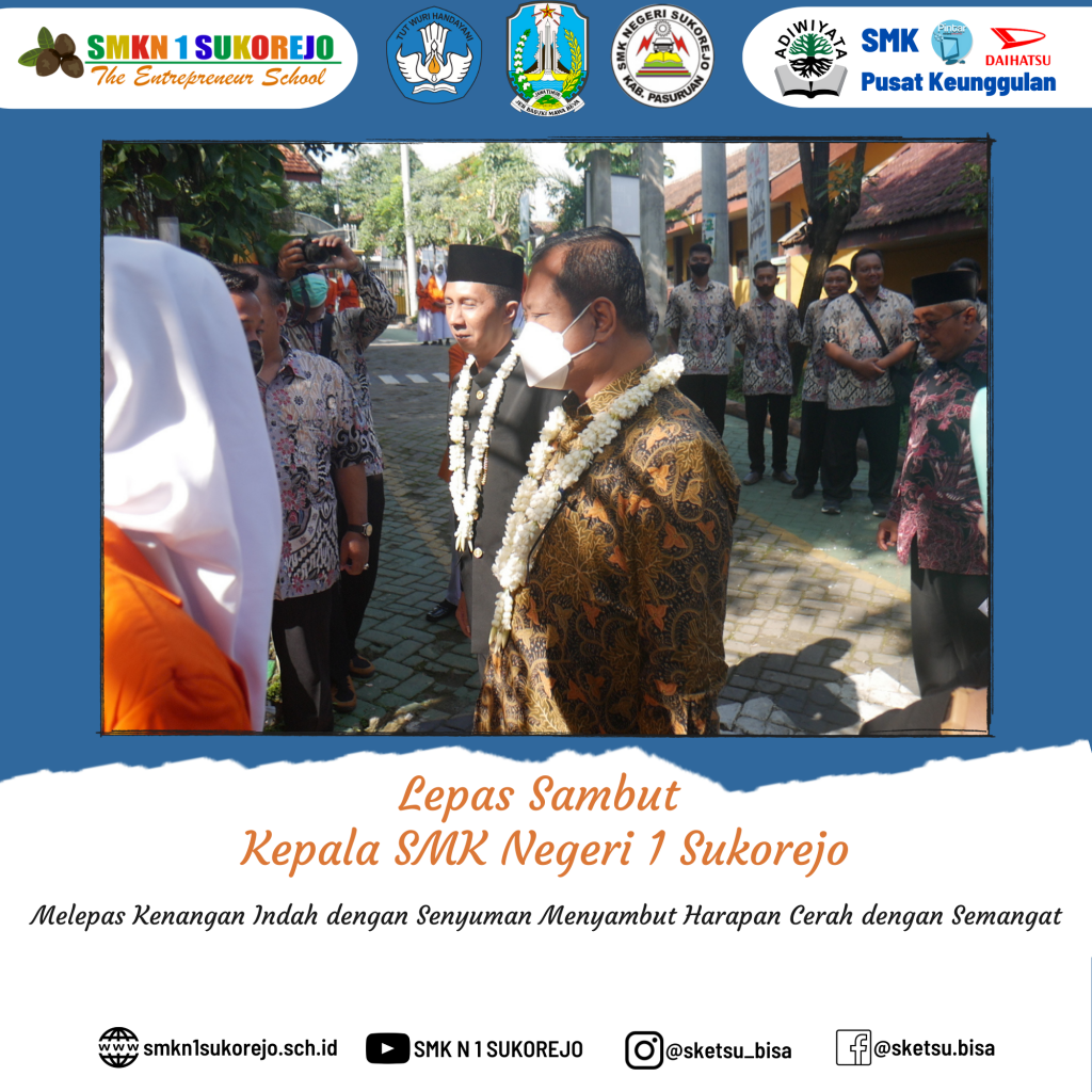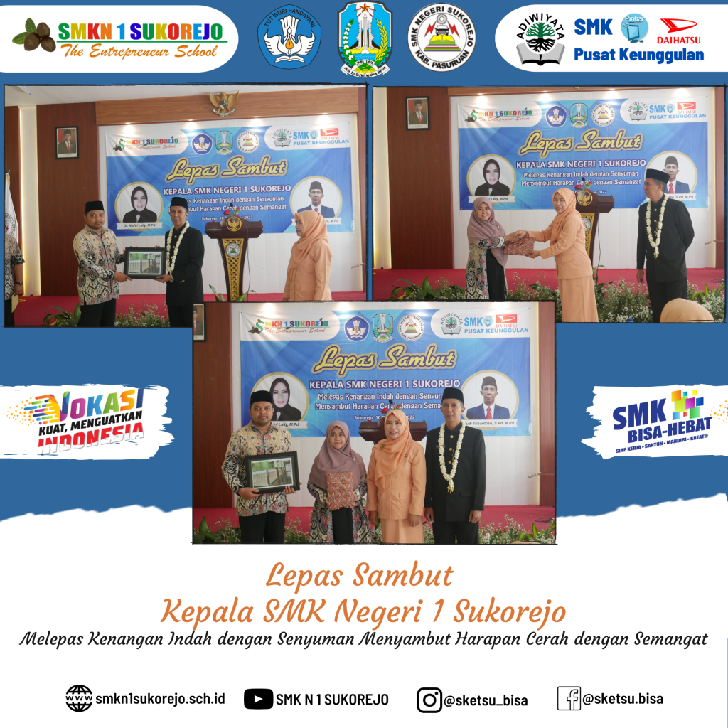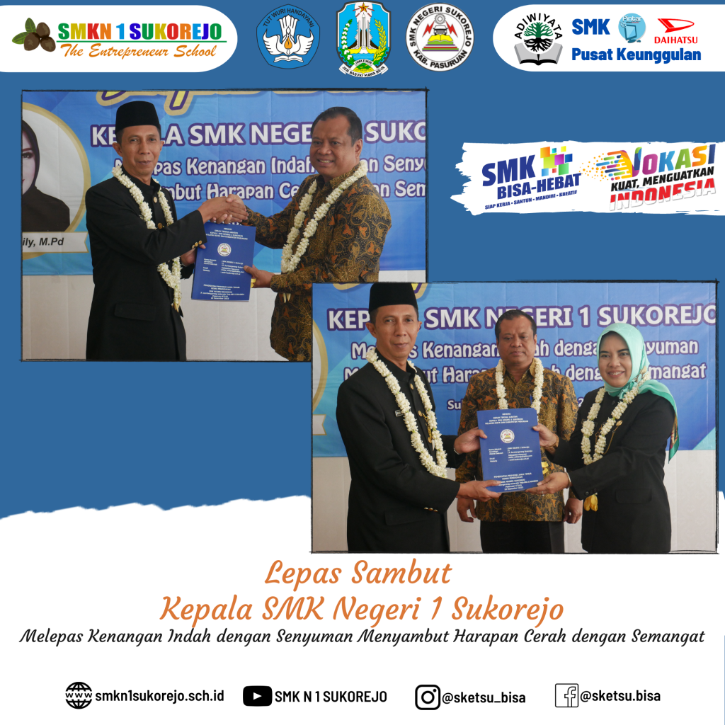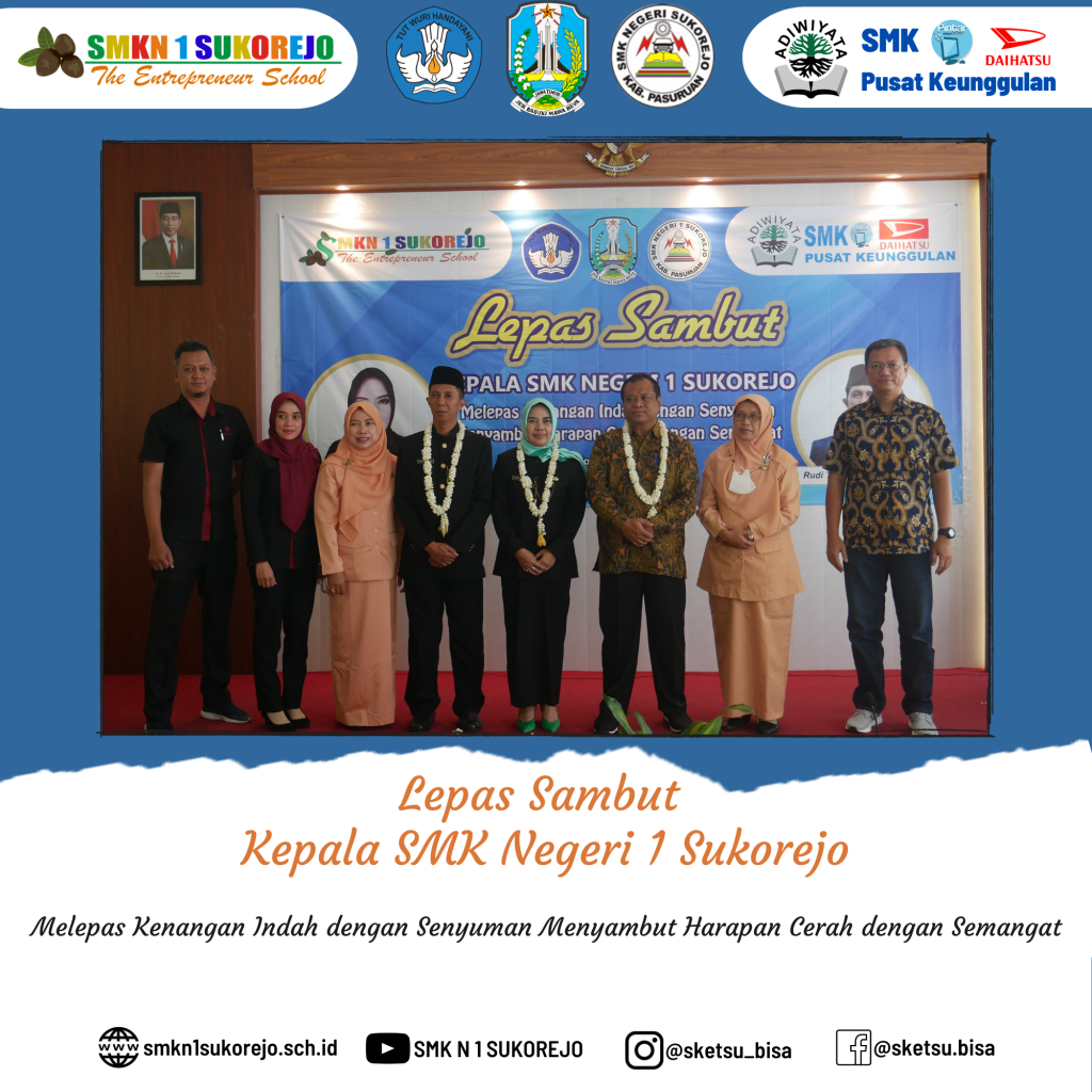 Sukorejo, 10 Desember 2022 telah dilaksanakan kegiatan Serah Terima Jabatan (Sertijab) dari Kepala SMK Negeri 1 Sukorejo yang lama (Bapak RUDI TRISANTOSO, S.Pd, M.Pd) kepada (Ibu Dr. NISFUL LAILY, S.Pd, M.Pd) selaku Kepala SMK Negeri 1 Sukorejo yang baru.