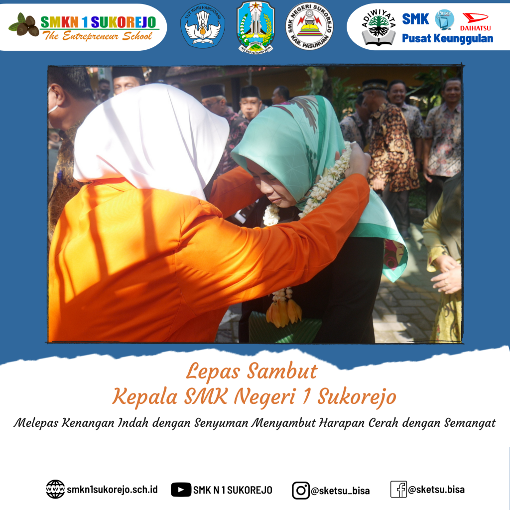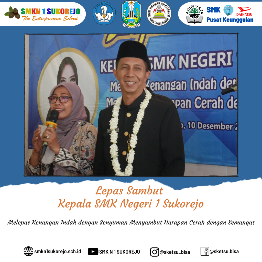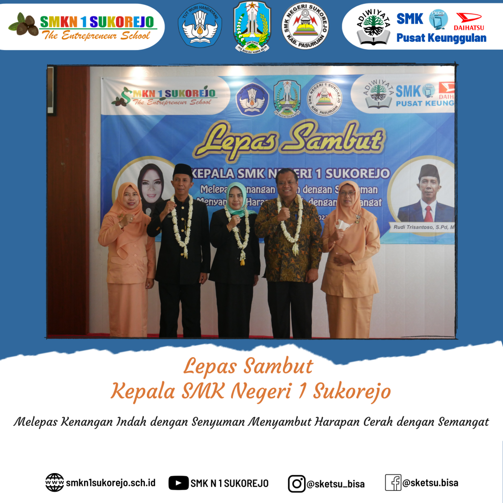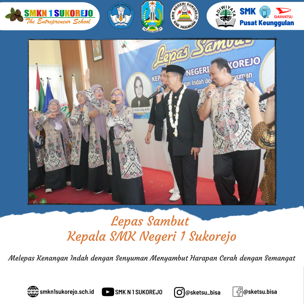 SMK Negeri 1 Sukorejo ikhlas melepas kenangan indah bersama Bapak RUDI TRISANTOSO, S.Pd, M.Pd dengan senyuman dan siap menyambut harapan cerah dengan semangat bersama Ibu Dr. NISFUL LAILY, S.Pd, M.Pd