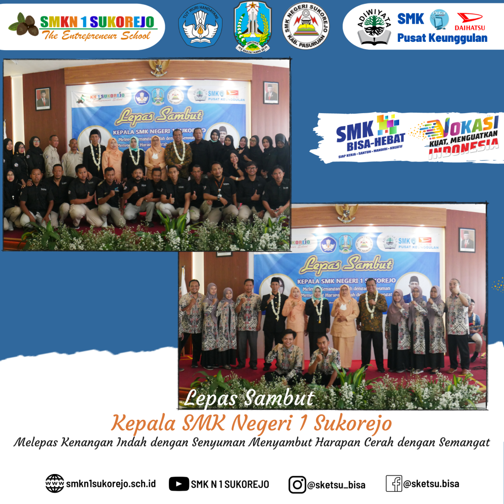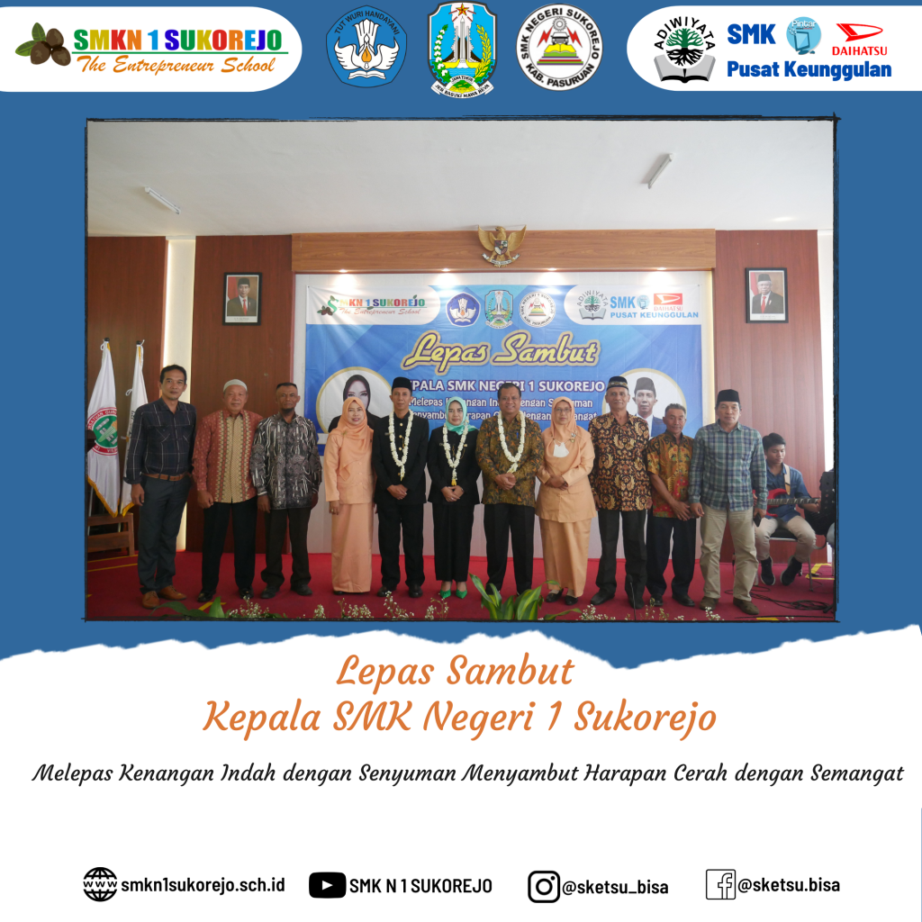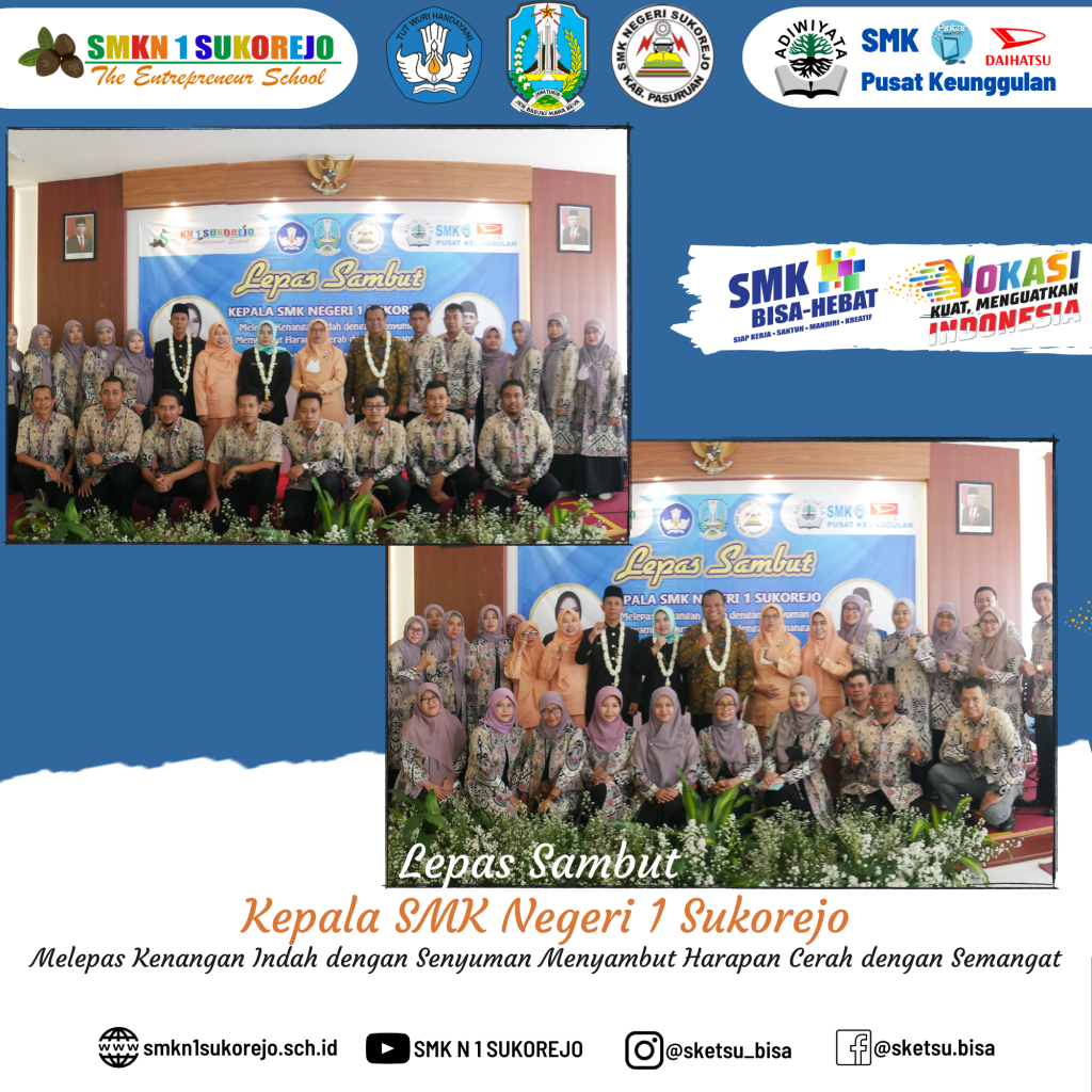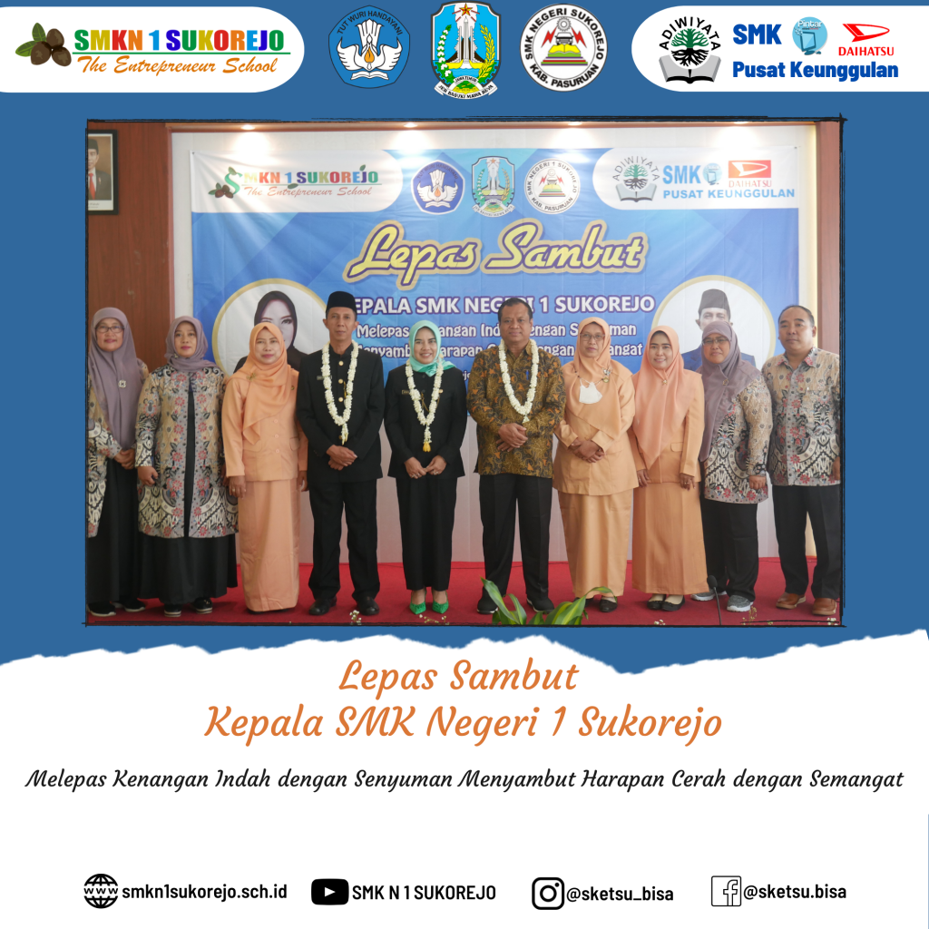SMK Negeri 1 Sukorejo ikhlas melepas kenangan indah bersama Bapak RUDI TRISANTOSO, S.Pd, M.Pd dengan senyuman dan siap menyambut harapan cerah dengan semangat bersama Ibu Dr. NISFUL LAILY, S.Pd, M.Pd