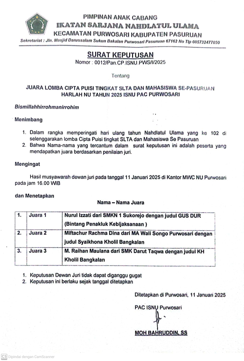 Minggu, 12 Januari 2025. Dalam rangka memperingati Hari Ulang Tahun Nahdlatul Ulama (Harlah NU) yang ke-102, Nurul Izzati, siswi kelas XII jurusan Teknik Elektronika Industri SMKN 1 Sukorejo, berhasil meraih prestasi membanggakan dalam lomba cipta puisi tingkat SLTA dan mahasiswa se-Kabupaten Pasuruan. Kompetisi yang diikuti oleh pelajar dan mahasiswa ini menjadi ajang bagi generasi muda untuk mengekspresikan kreativitas mereka melalui karya sastra.