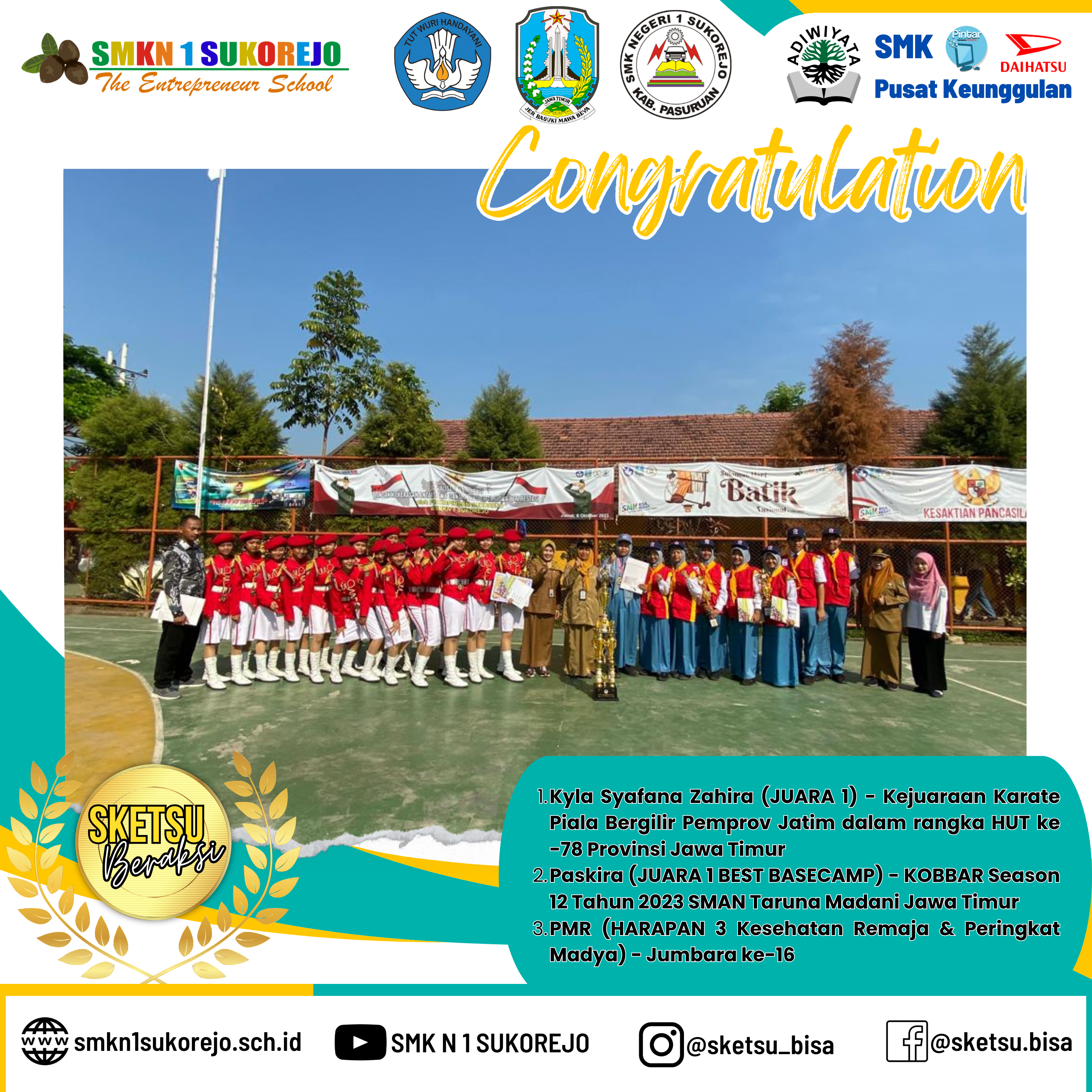 Peserta didik SMK Negeri 1 Sukorejo tak henti hentinya mengharumkan nama sekolah. Berikut ini daftar peserta didik yang telah berprestasi : 1. Kyla Syafana Zahira (JUARA 1) – Kejuaraan Karate Piala Bergilir Pemprov Jatim dalam rangka HUT ke -78 Provinsi Jawa Timur 2. Paskibra (JUARA 1 BEST BASECAMP) – KOBBAR Season 12 Tahun 2023 SMAN Taruna Madani Jawa Timur 3. PMR (HARAPAN 3 Kesehatan Remaja & Peringkat Madya) – Jumbara ke-16